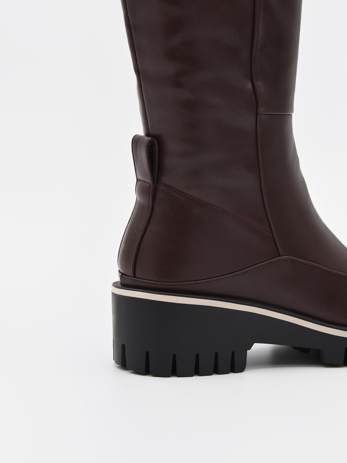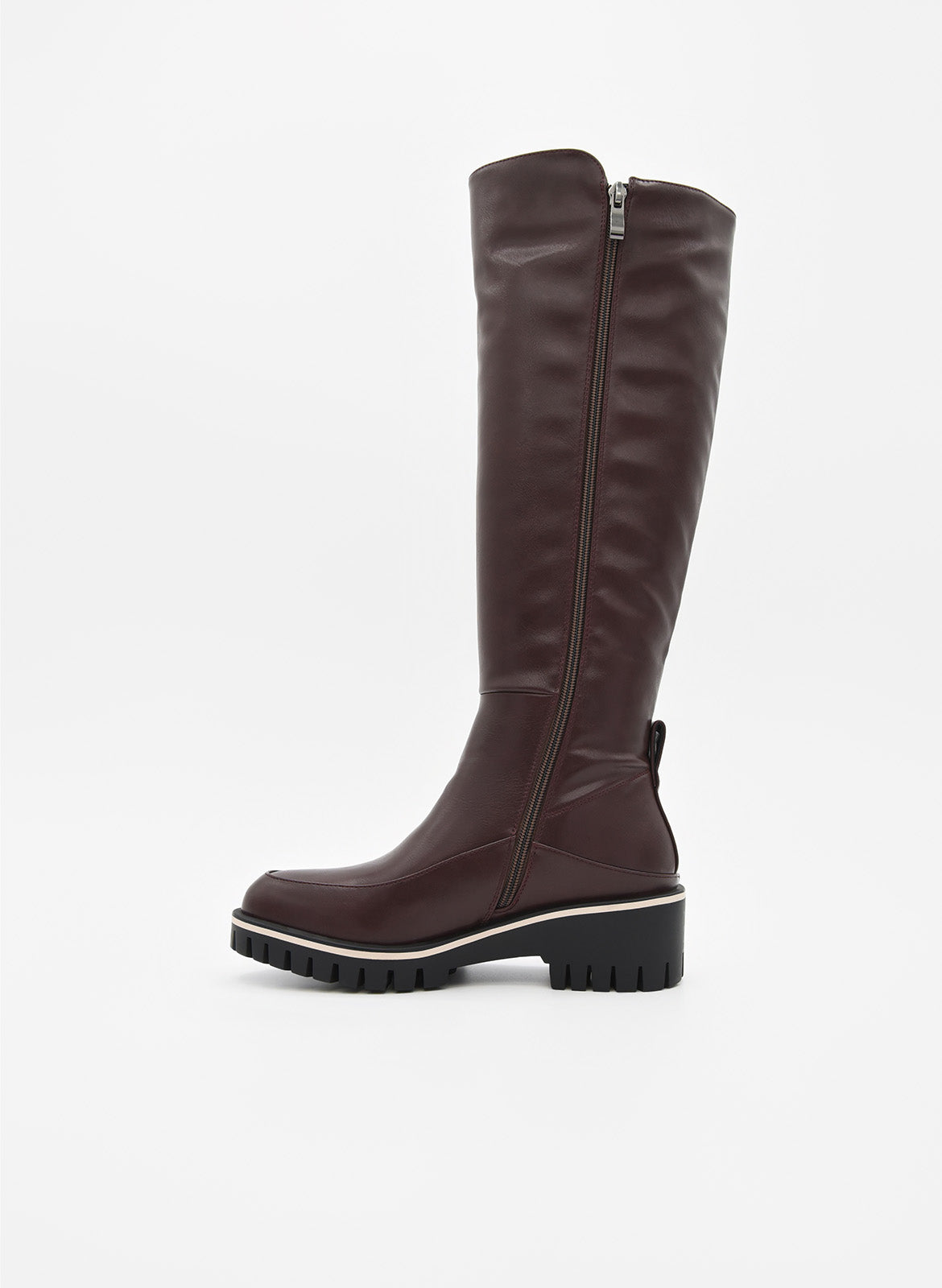Su cremallera lateral asegura un ajuste práctico y estilizado, mientras que la caña alta estiliza la pierna al instante. Perfecta para combinar con vestidos de punto, faldas midi, abrigos largos o incluso unos vaqueros pitillo, esta bota burdeos con plataforma es tu aliada para looks de día o de noche con un aire sofisticado y urbano.