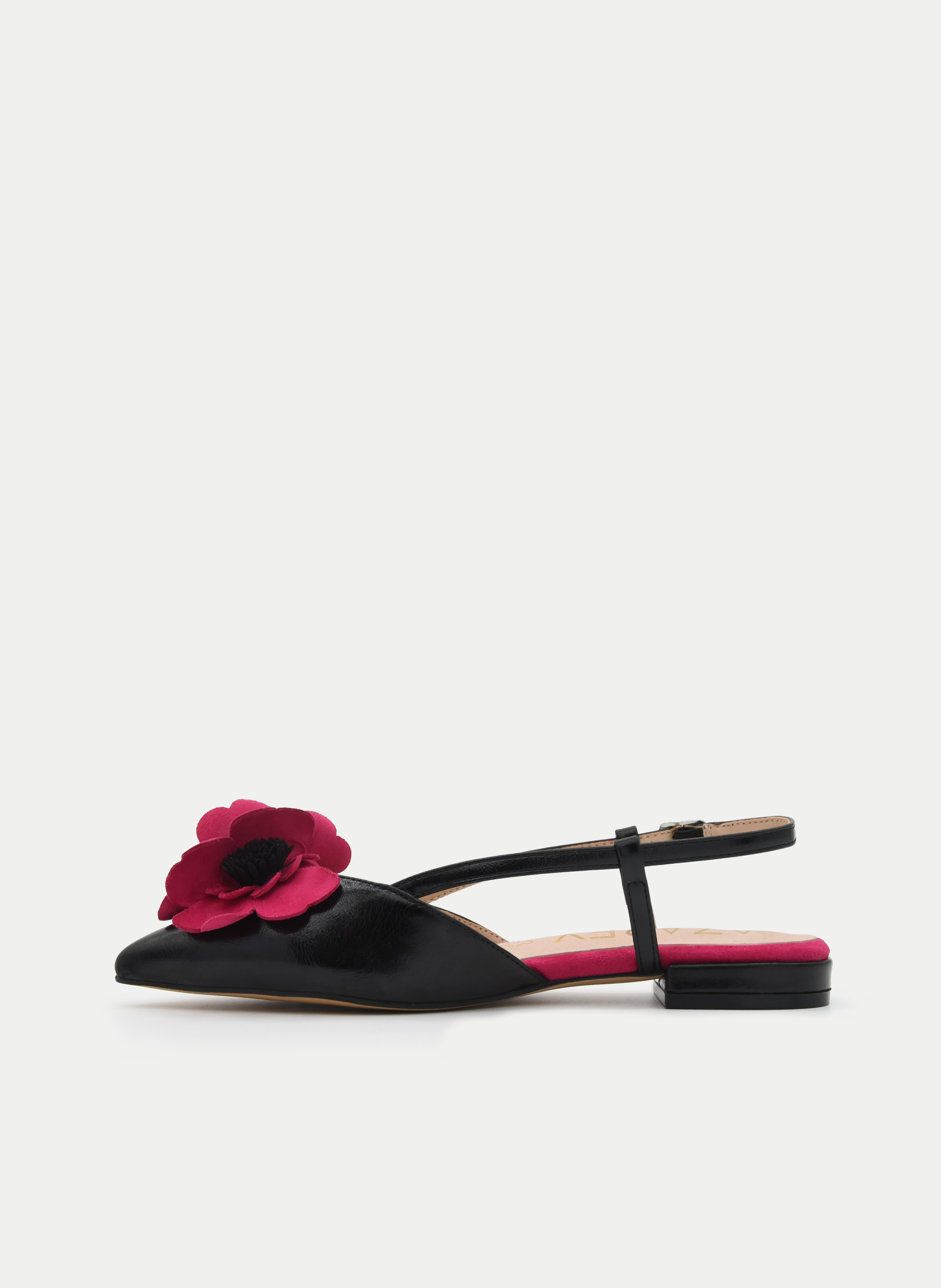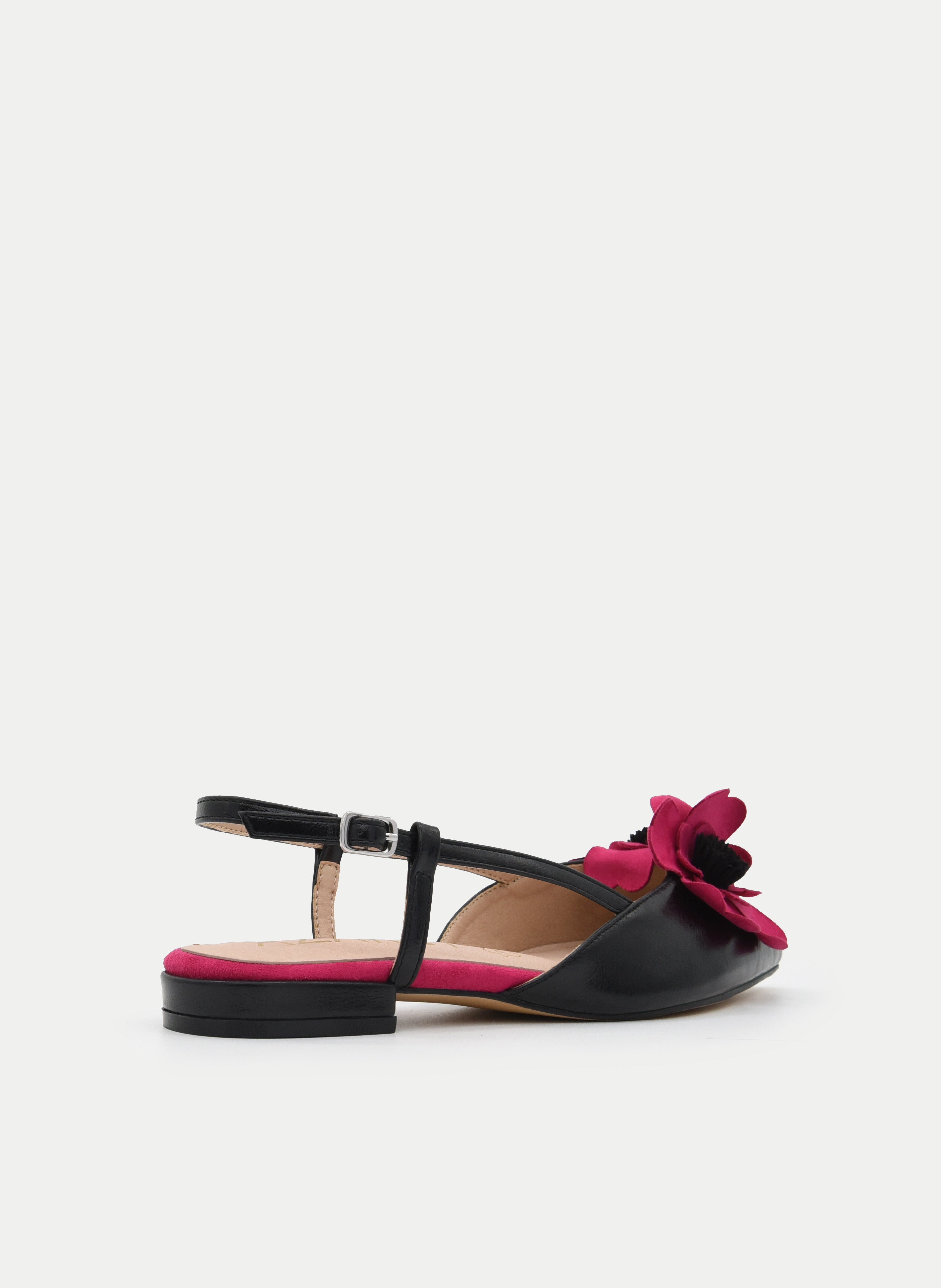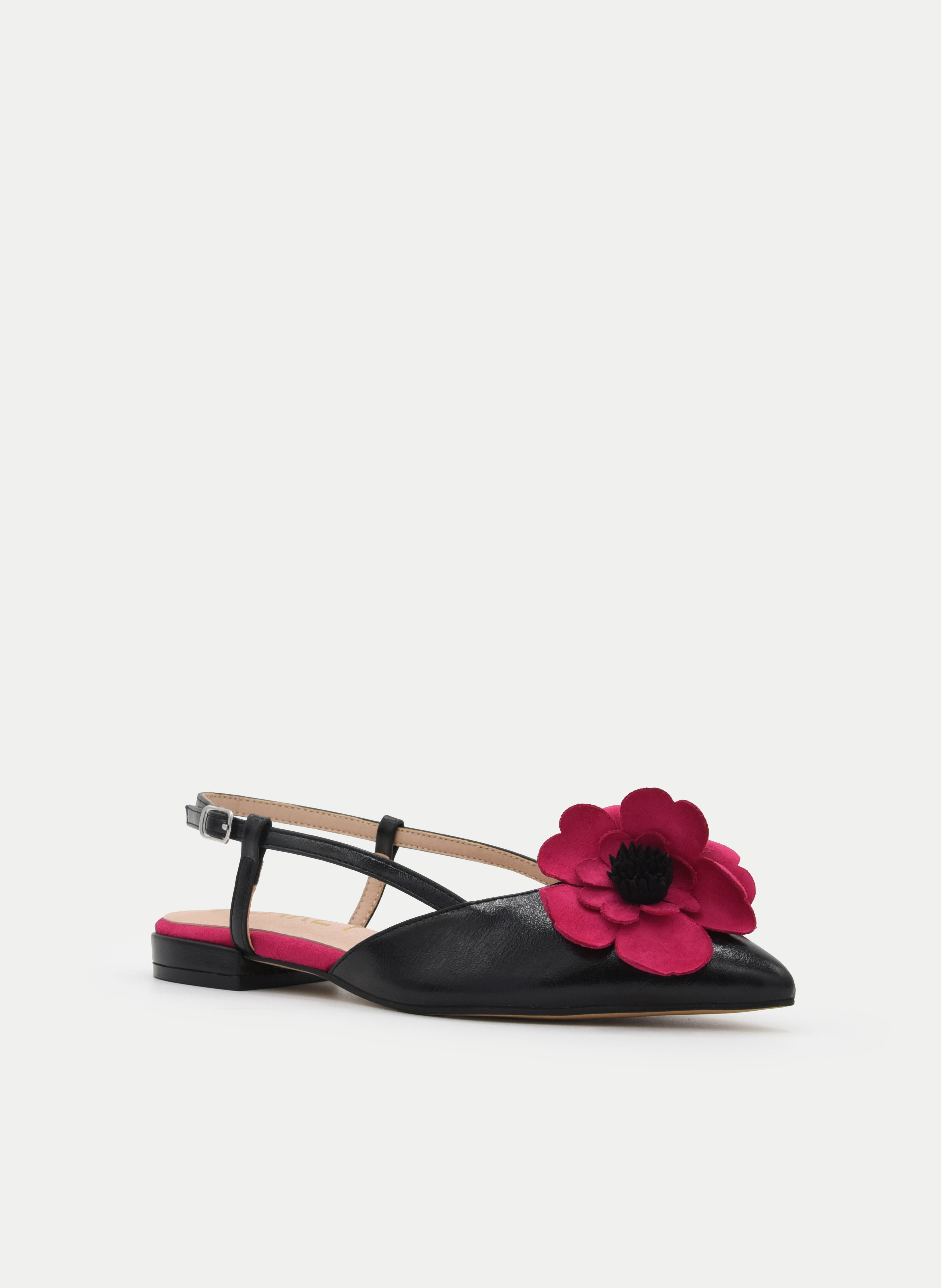 Elegante, femenina y con un toque muy especial. Esta bailarina destalonada negra destaca por su diseño sofisticado con punta fina y un llamativo detalle de flor fucsia en el empeine que aporta personalidad y un aire muy chic al conjunto.