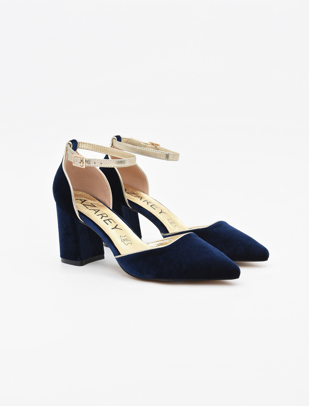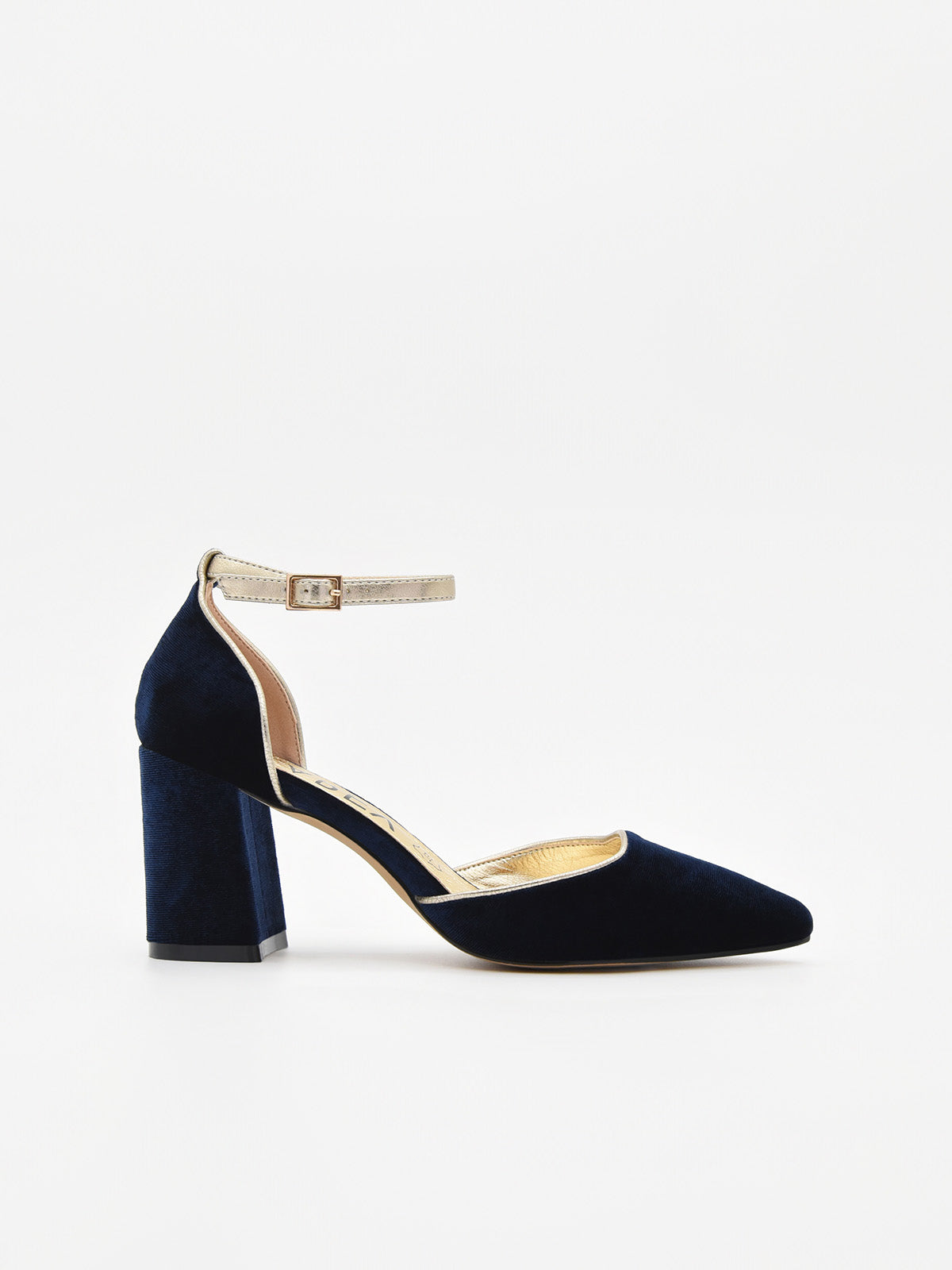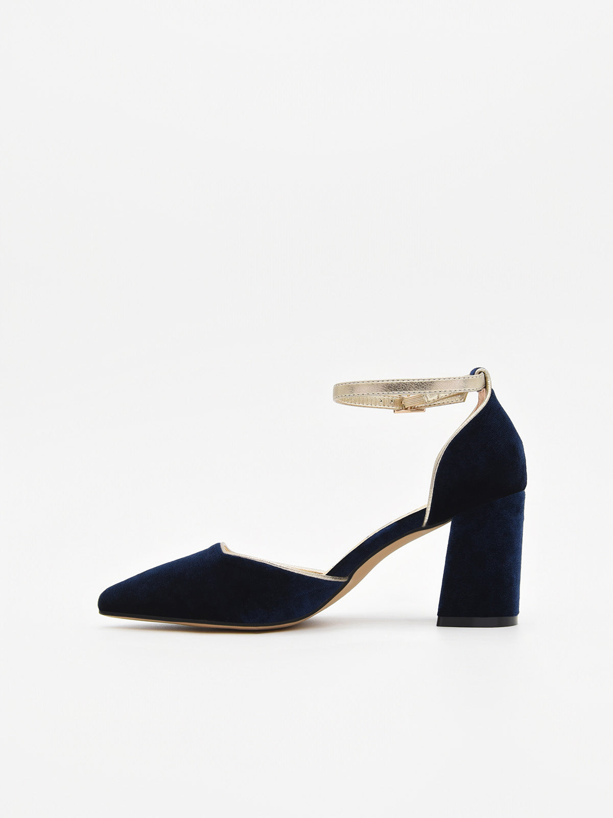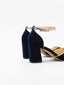 Estos zapatos de terciopelo azul marino combinan elegancia y confort desde el primer instante. El tacón ancho aporta estabilidad para caminar con seguridad, mientras que la plantilla de piel acolchada mima tus pies incluso tras horas llevándolos. La delicada pulsera al tobillo no solo refina el diseño, sino que aporta sujeción extra sin restar sofisticación.