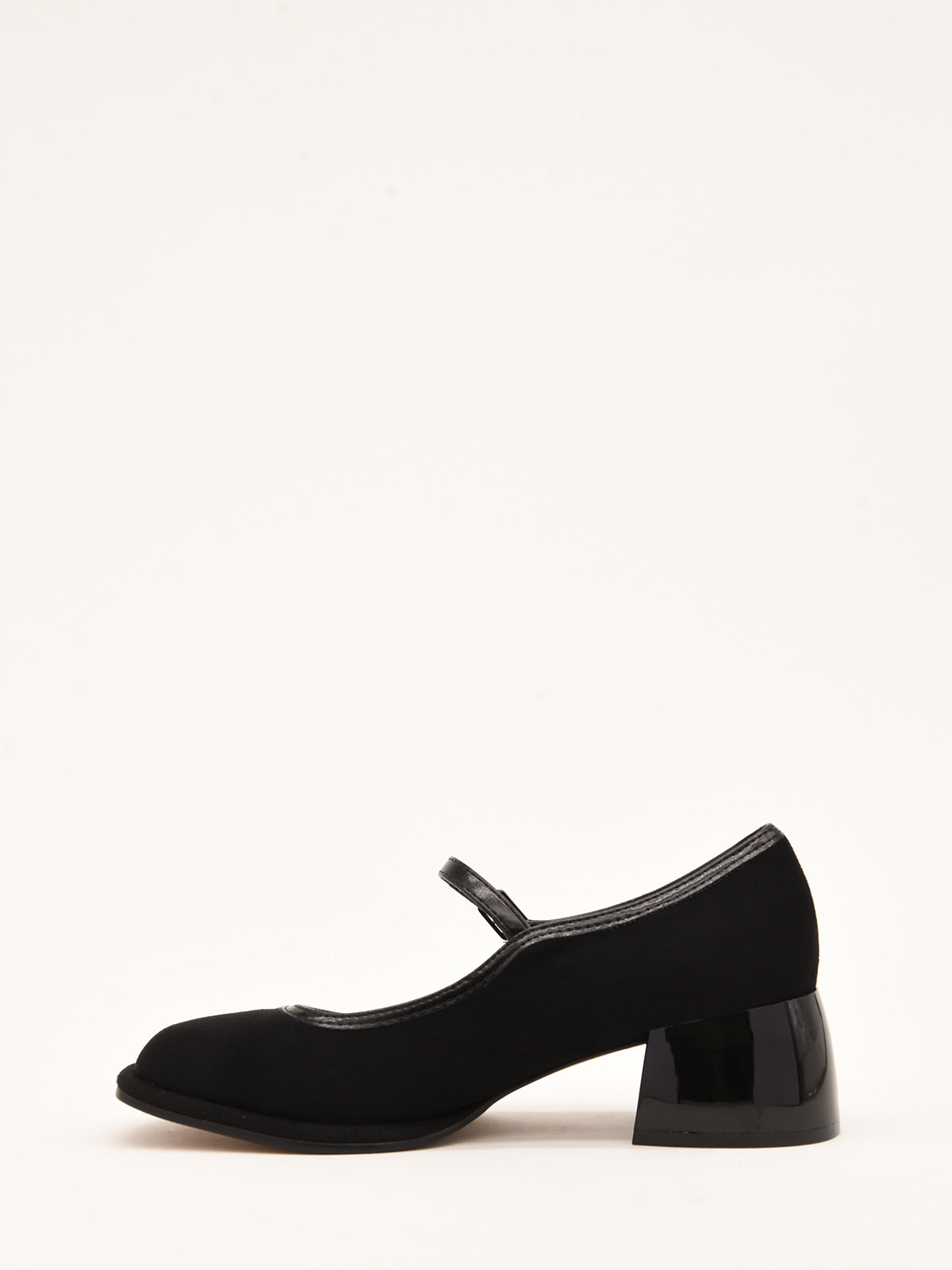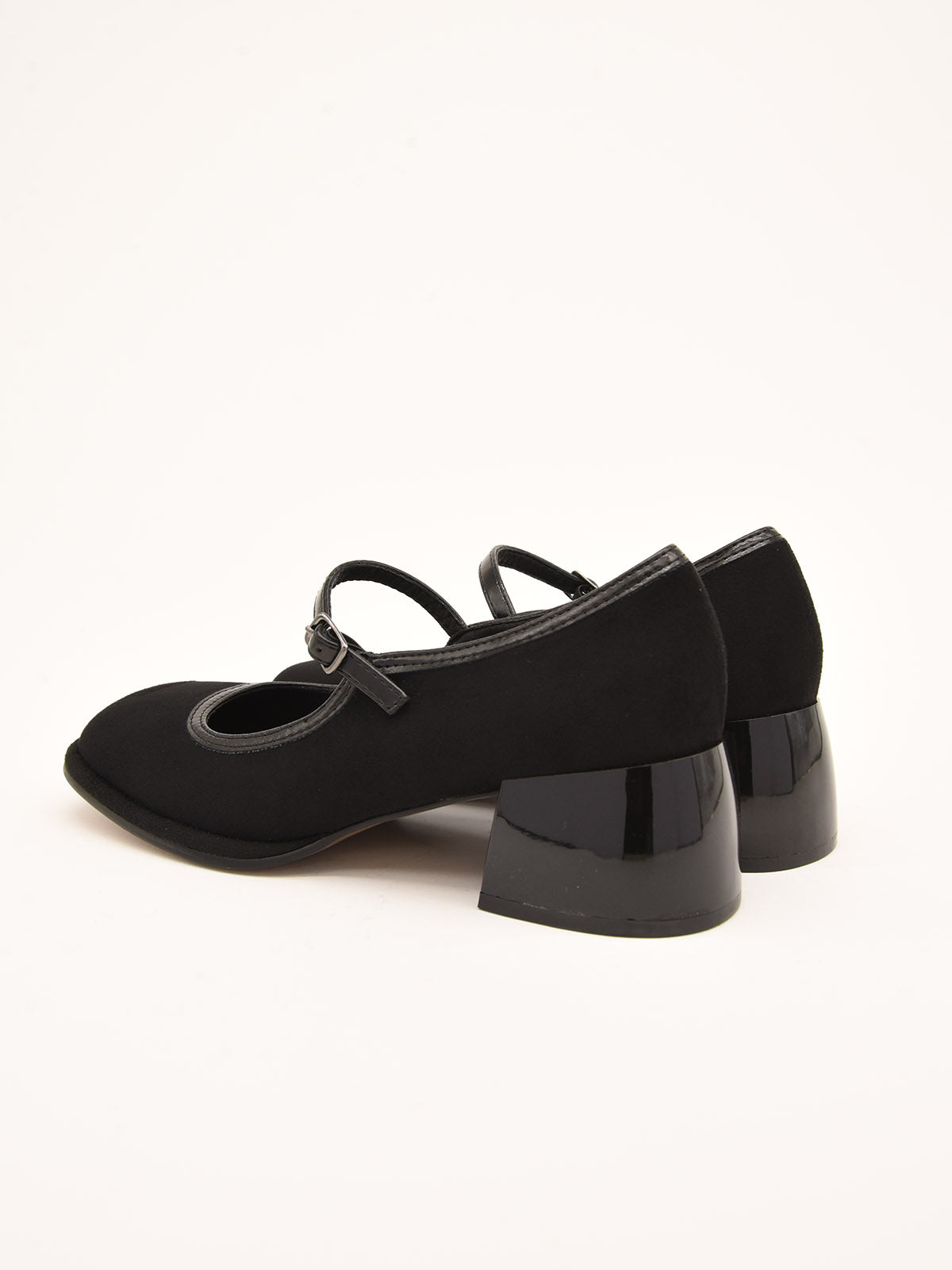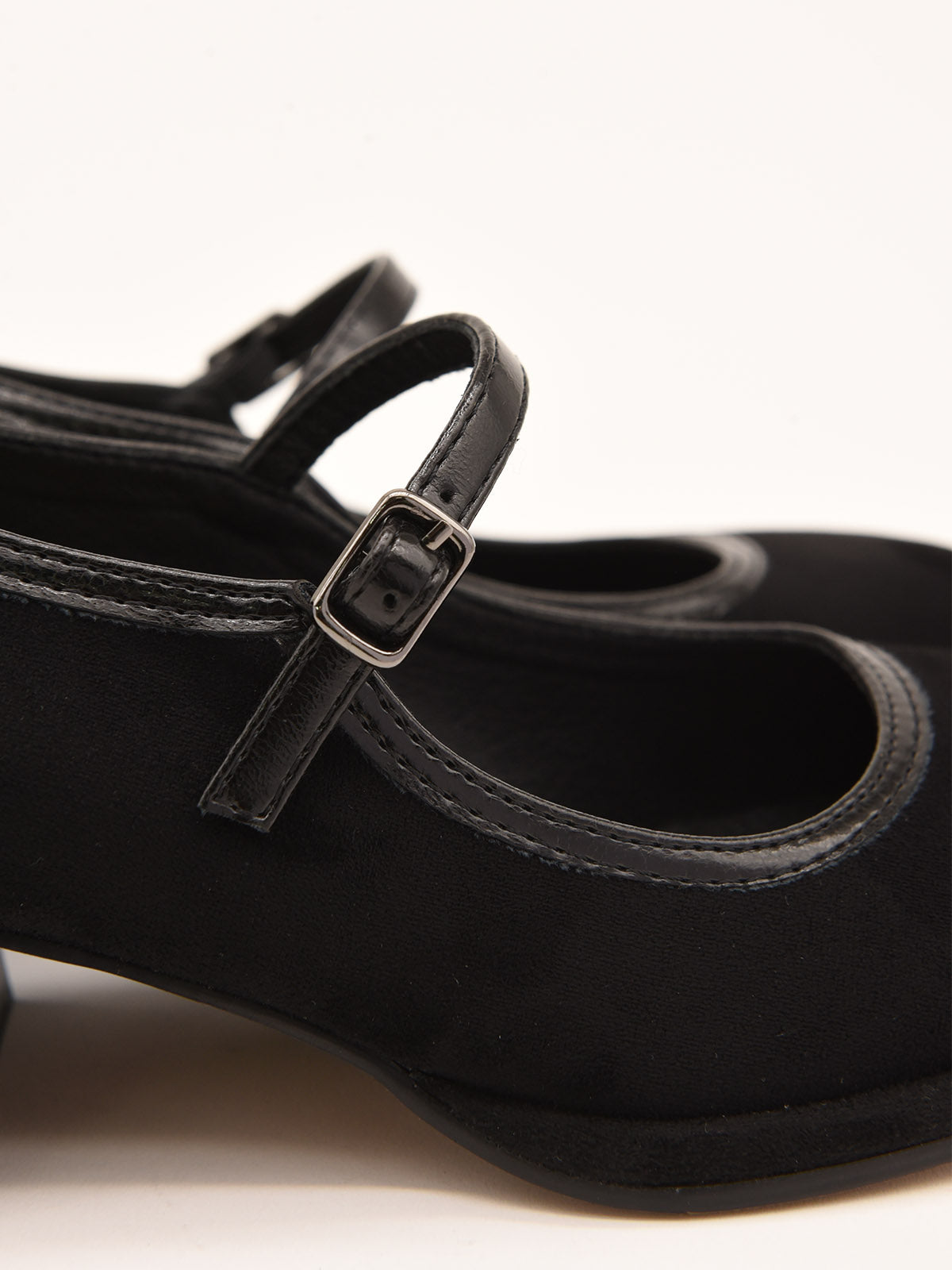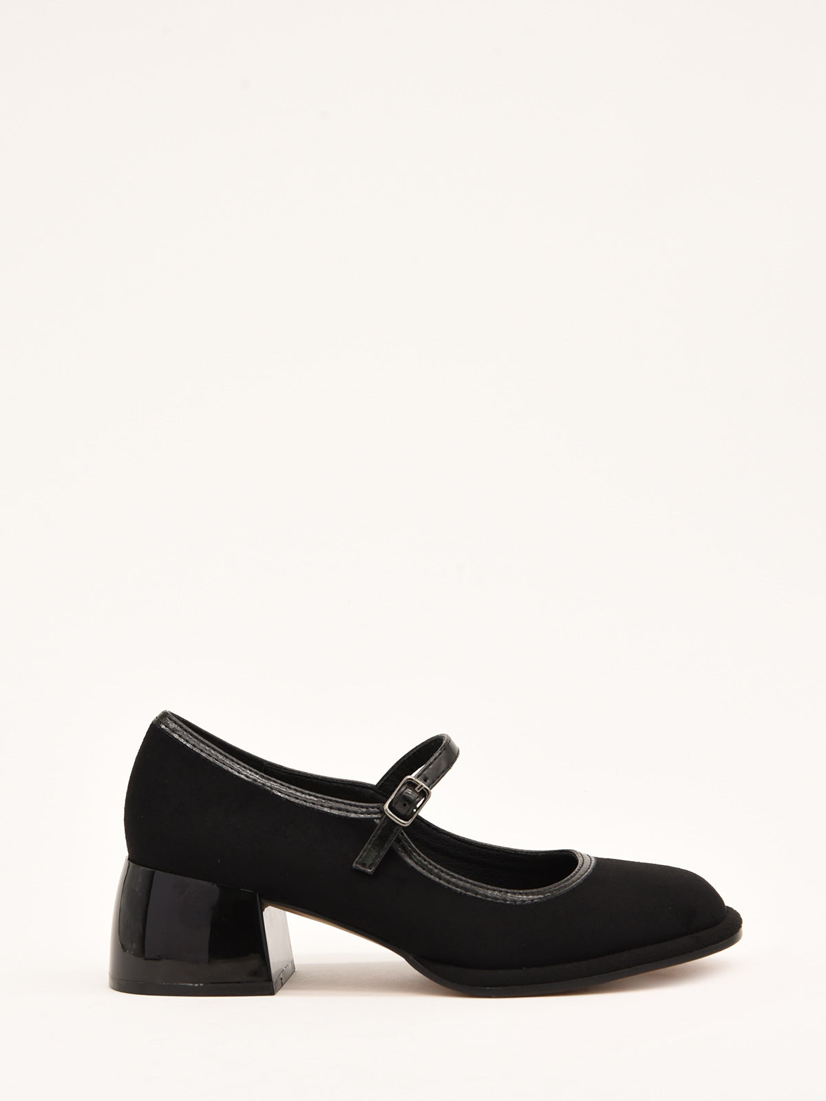 Elegant black suede-effect shoe with an adjustable metallic strap over the instep. Classic and comfortable design with contrast stitching and a sturdy square heel, perfect for casual or work styles.