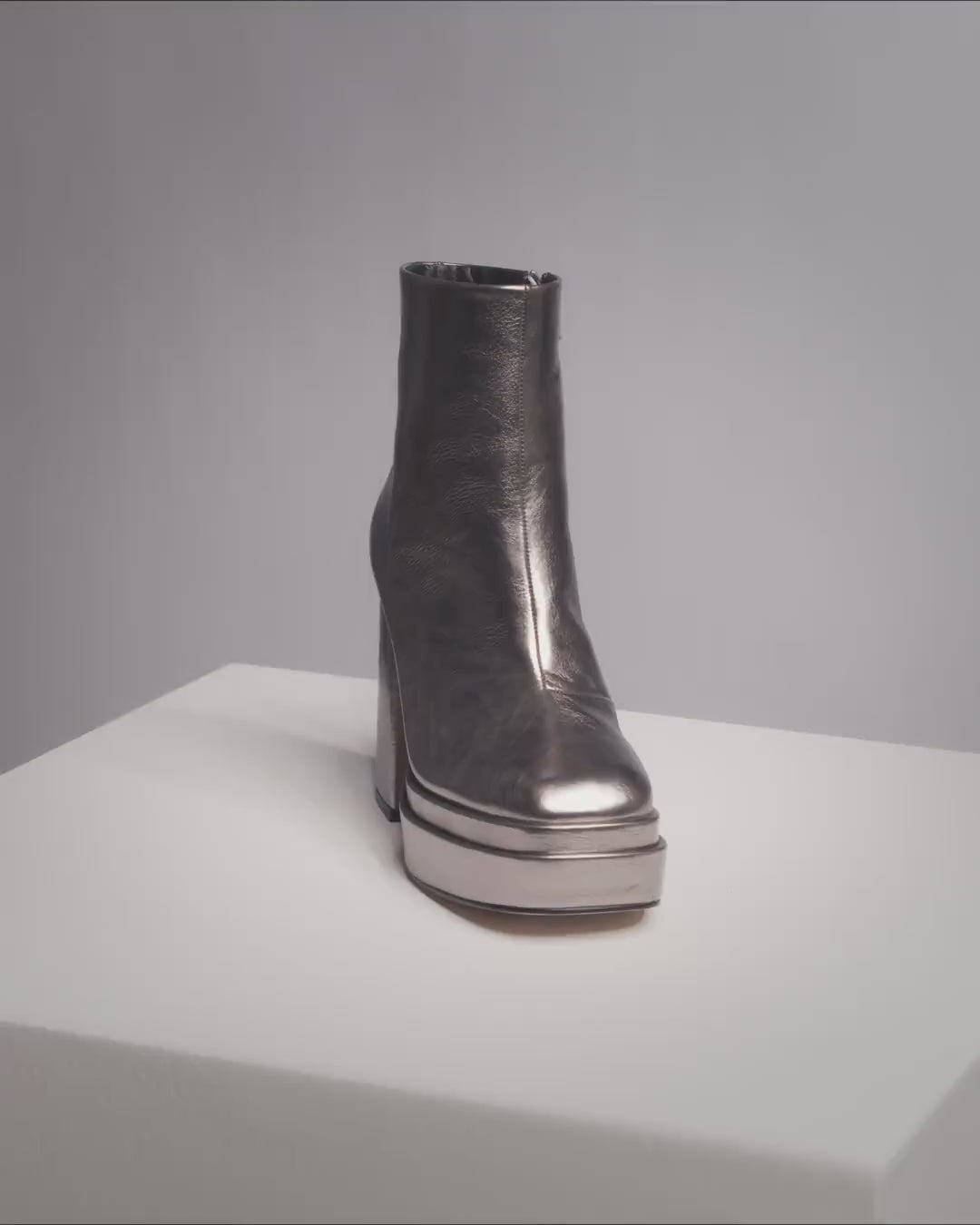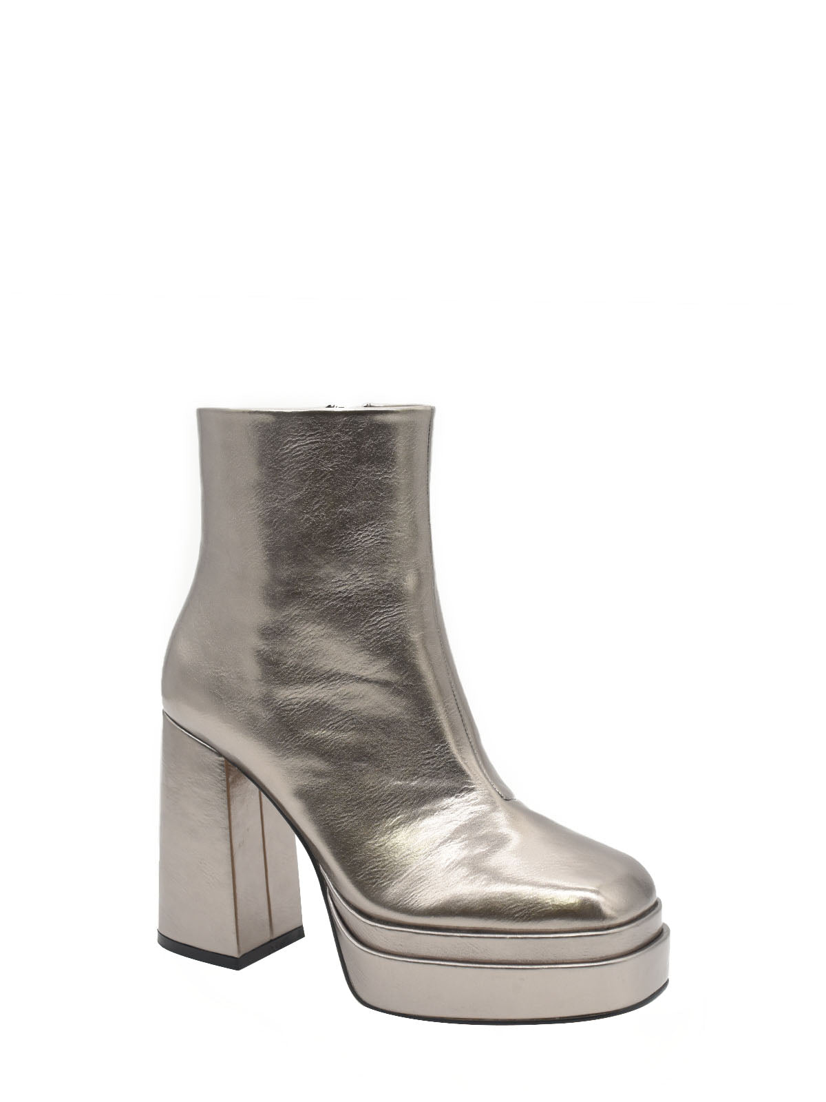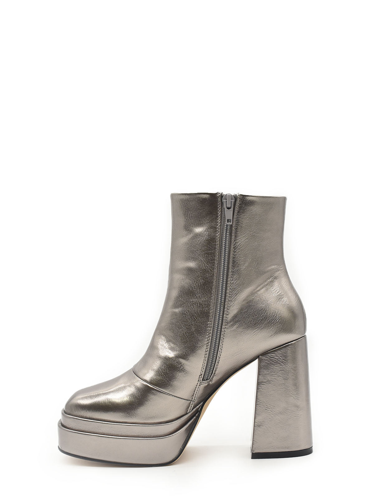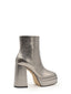 Heeled ankle boot with platform in metallic lead