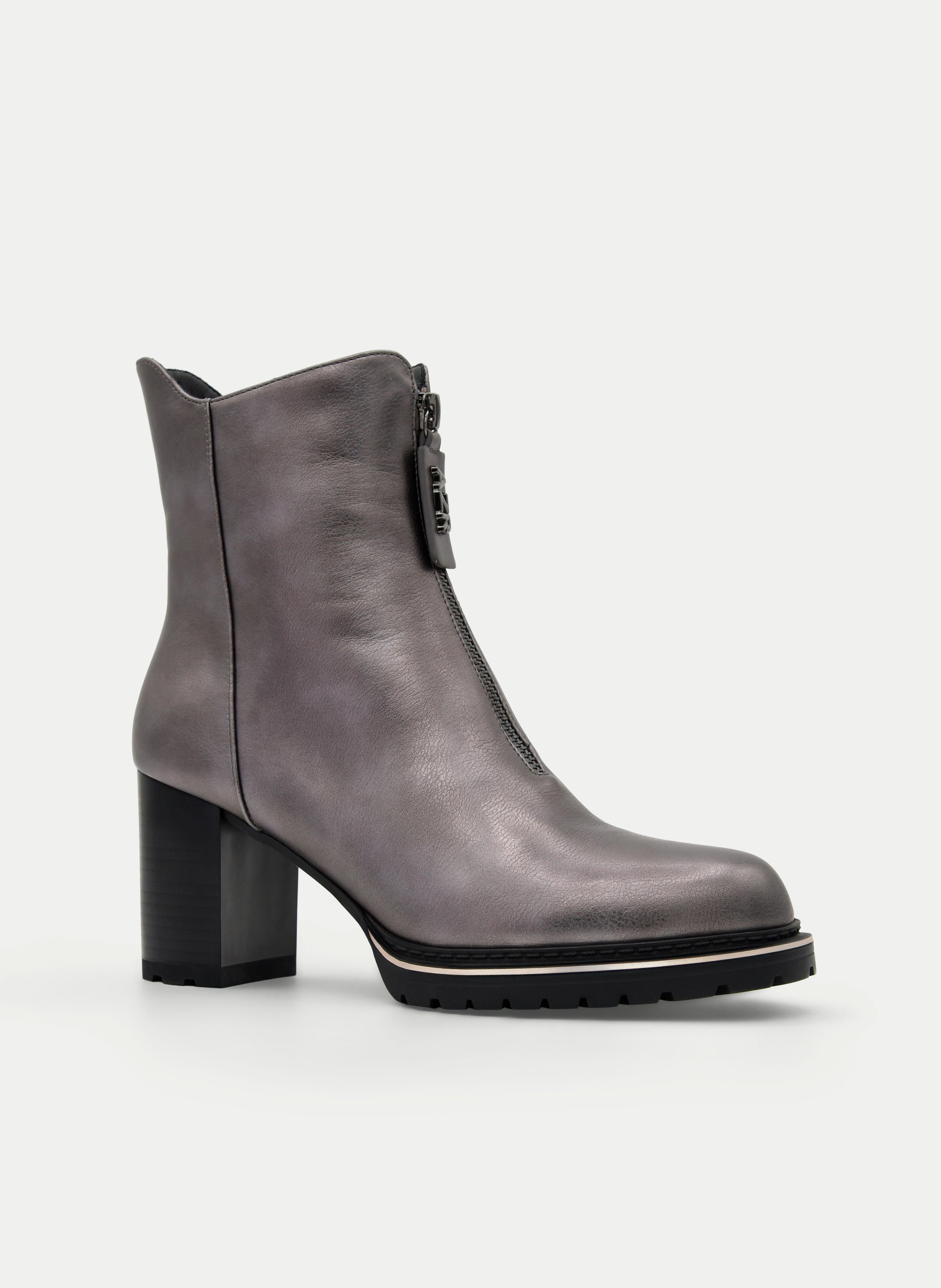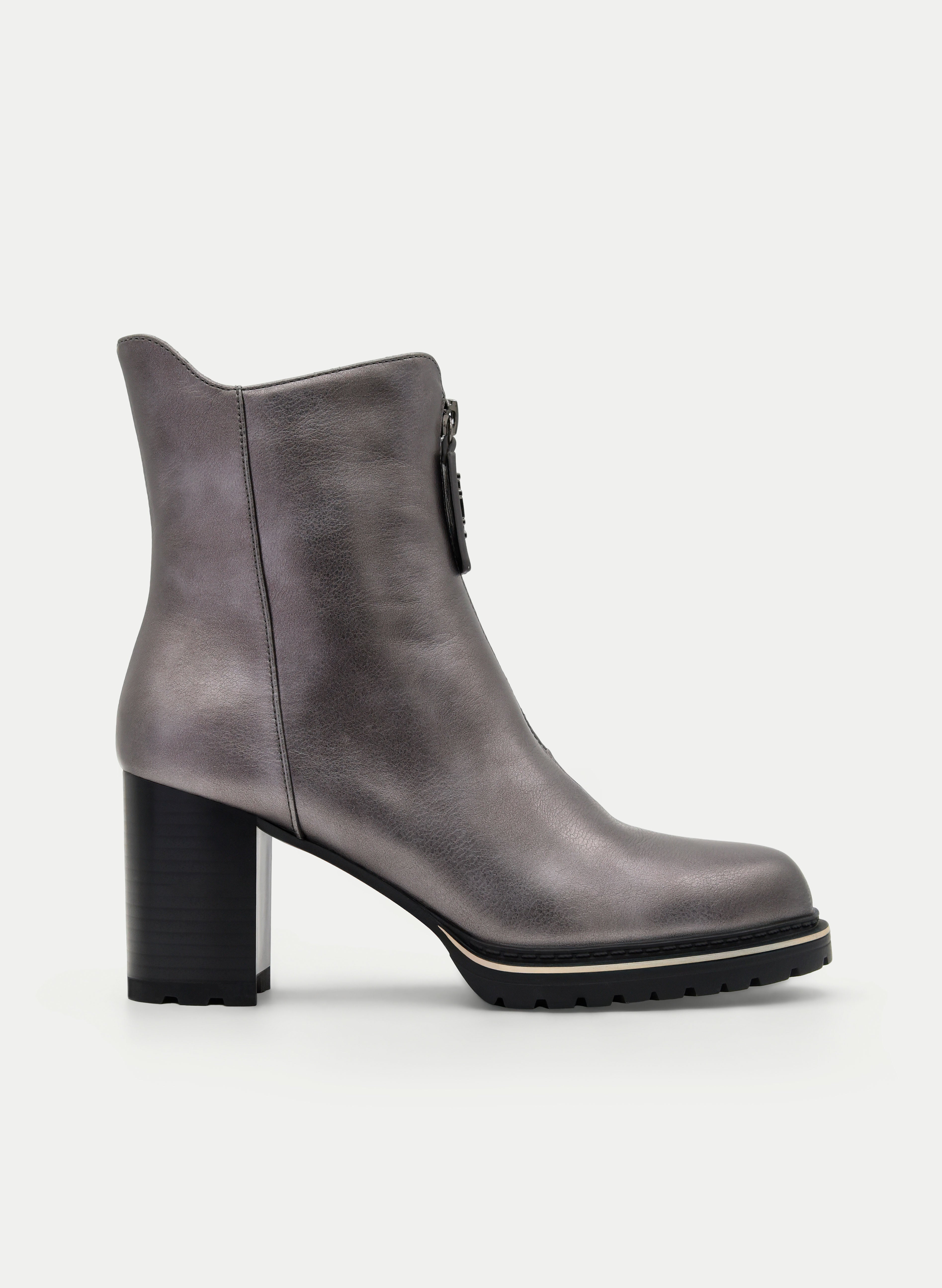 These lead colored ankle boots They stand out for their modern and sophisticated aesthetics, ideal for women looking for an elegant design with a daring touch. The metallic finish in a lead tone provides luminosity and style, while the decorative front zipper adds character and makes this model absolutely distinctive. The wide heel offers stability and comfort, perfect for all-day wear.