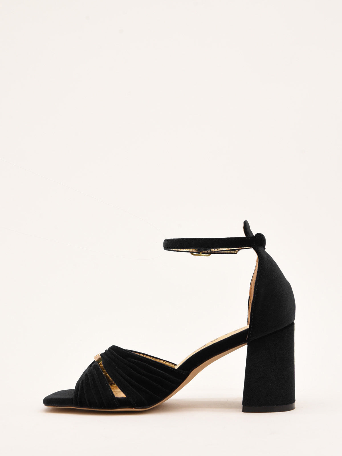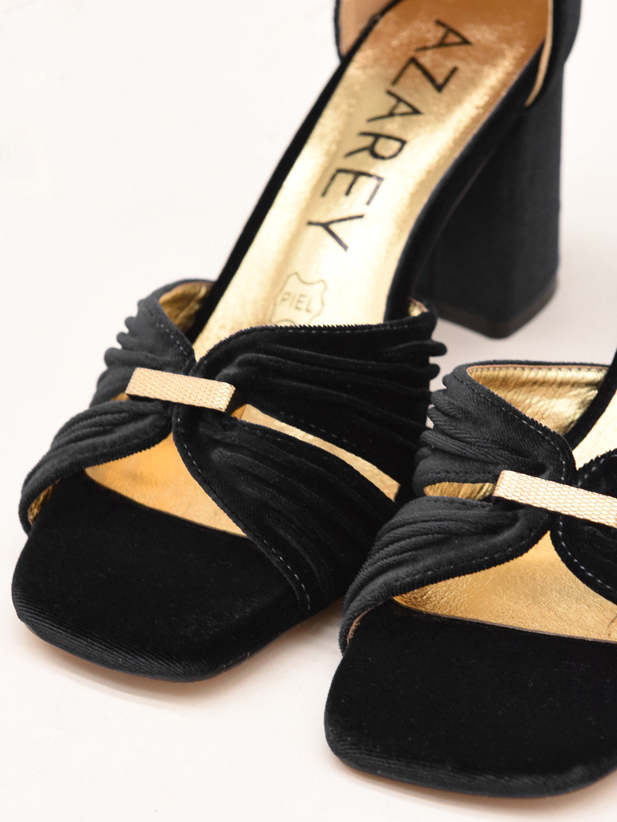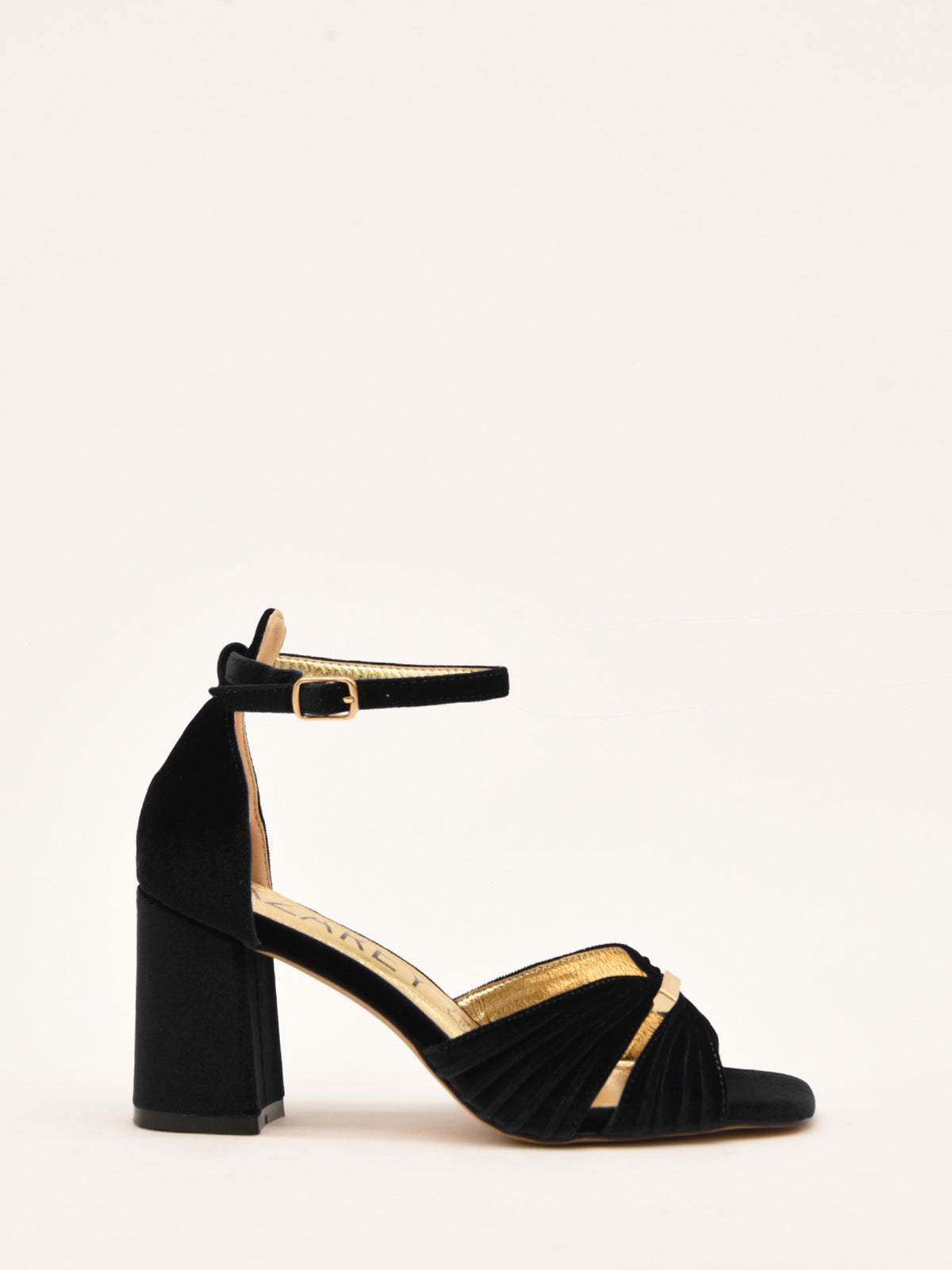 Discover the charm and sophistication that these black velvet sandals can add to any evening outfit. Designed with a comfortable, wide heel, these sandals perfectly combine style and stability. The crisscross band detail at the front adds a feminine and chic touch, while the adjustable ankle strap ensures a perfect fit. Ideal for formal events or a special night out, these sandals are a must-have for any fashion lover who doesn't want to sacrifice comfort for style.