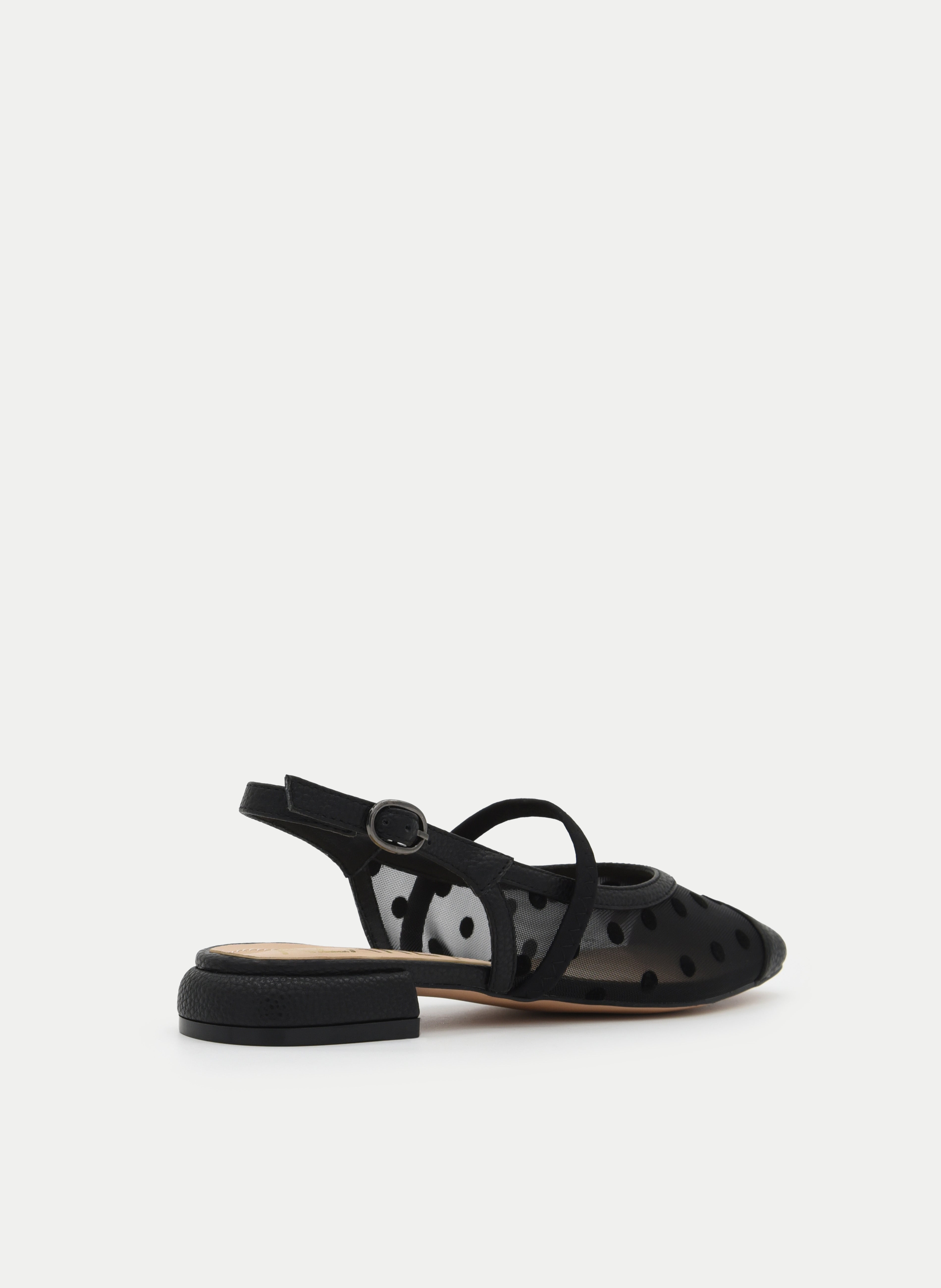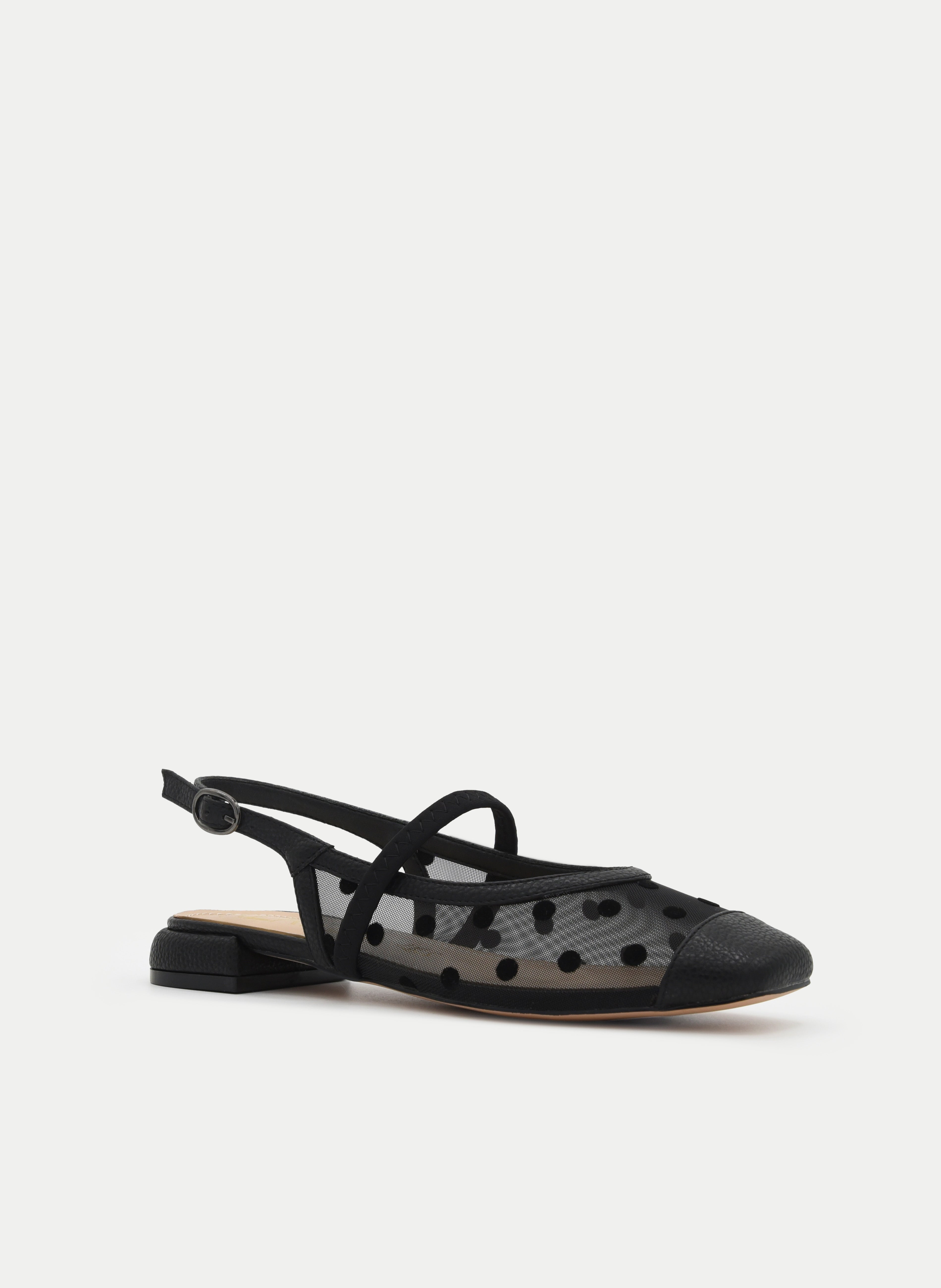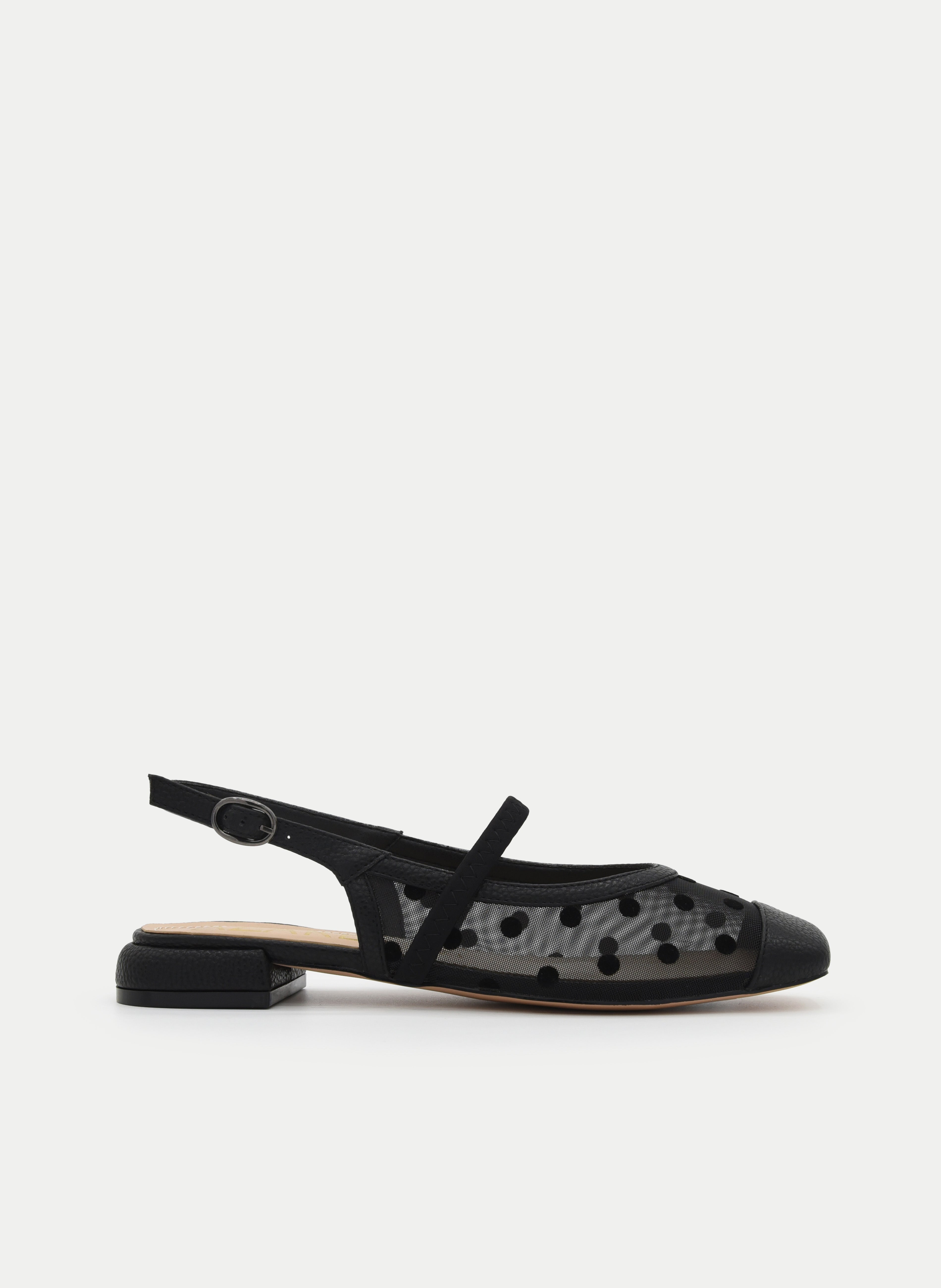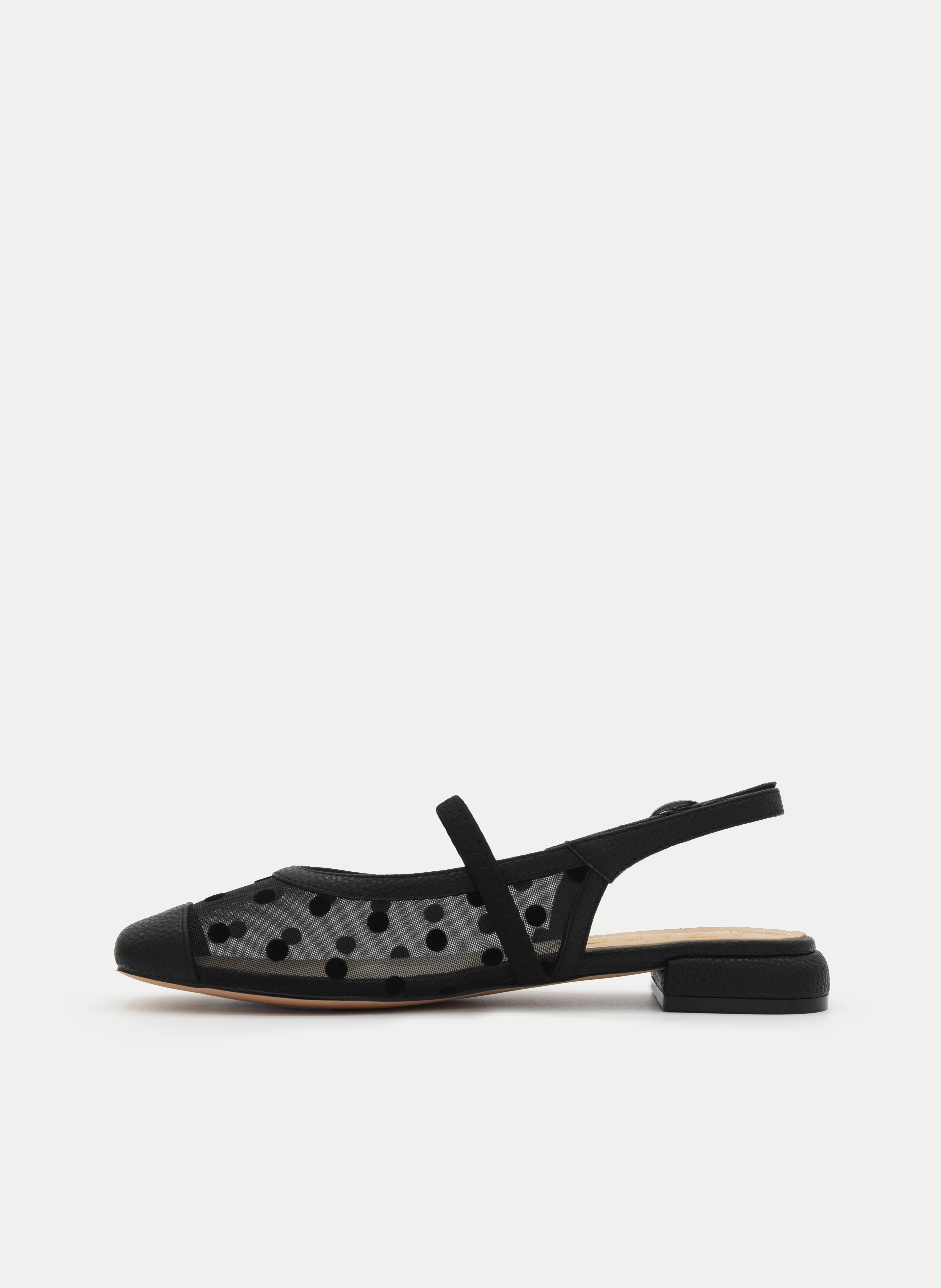 Black slingback ballerina in translucent mesh with embroidered polka dots, round toe and side closure. Lightweight, modern and comfortable design, with open heel and small buckle for adjustment.