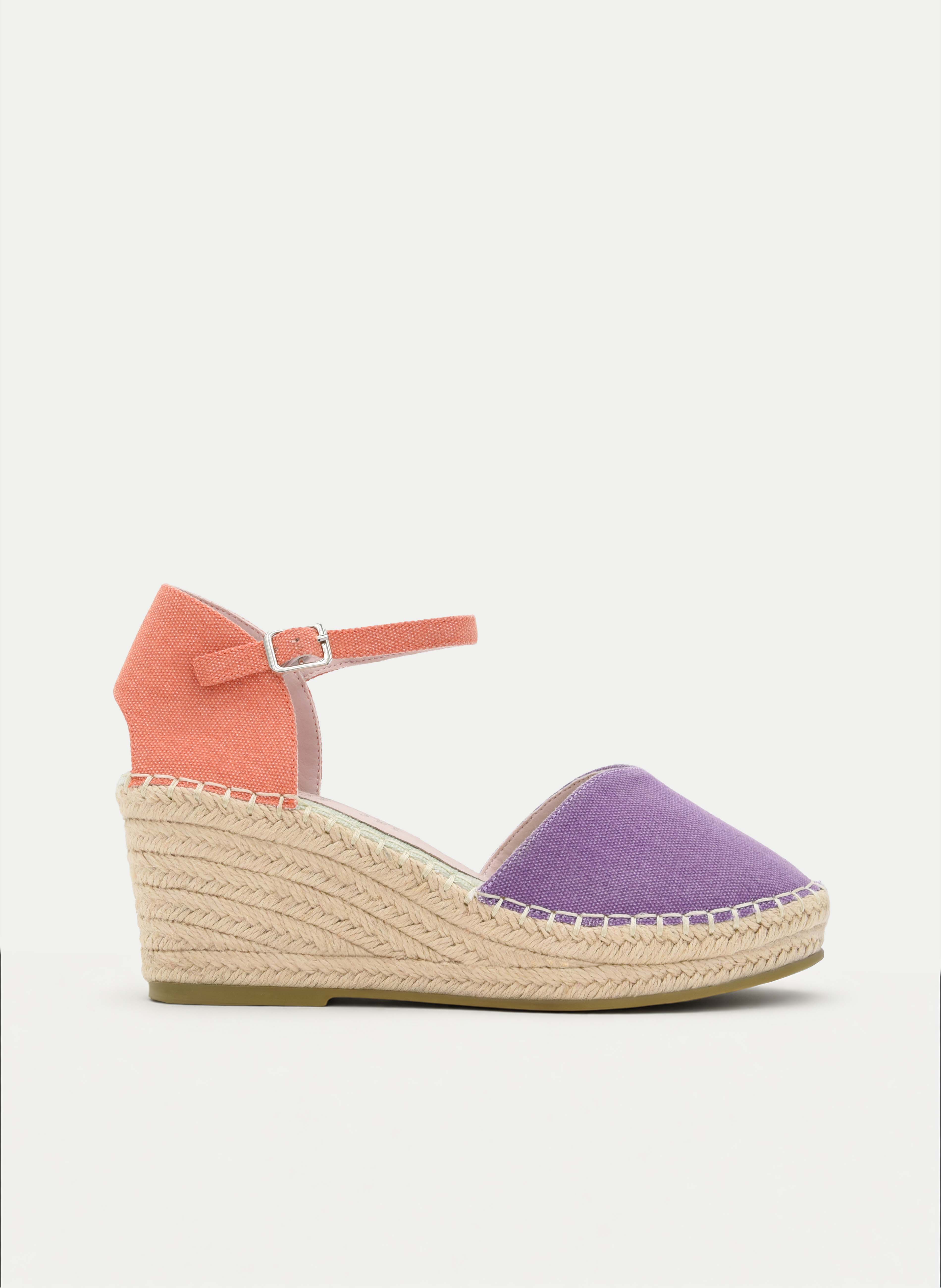 These two-tone wedge espadrilles combine artisanal charm with a modern and feminine design. The lilac and coral contrast adds a fresh and sophisticated touch, perfect for effortlessly elevating any outfit. Their slender silhouette with a closed toe and ankle strap closure makes them the ideal choice for special events, outdoor celebrations, or everyday stylish wear.