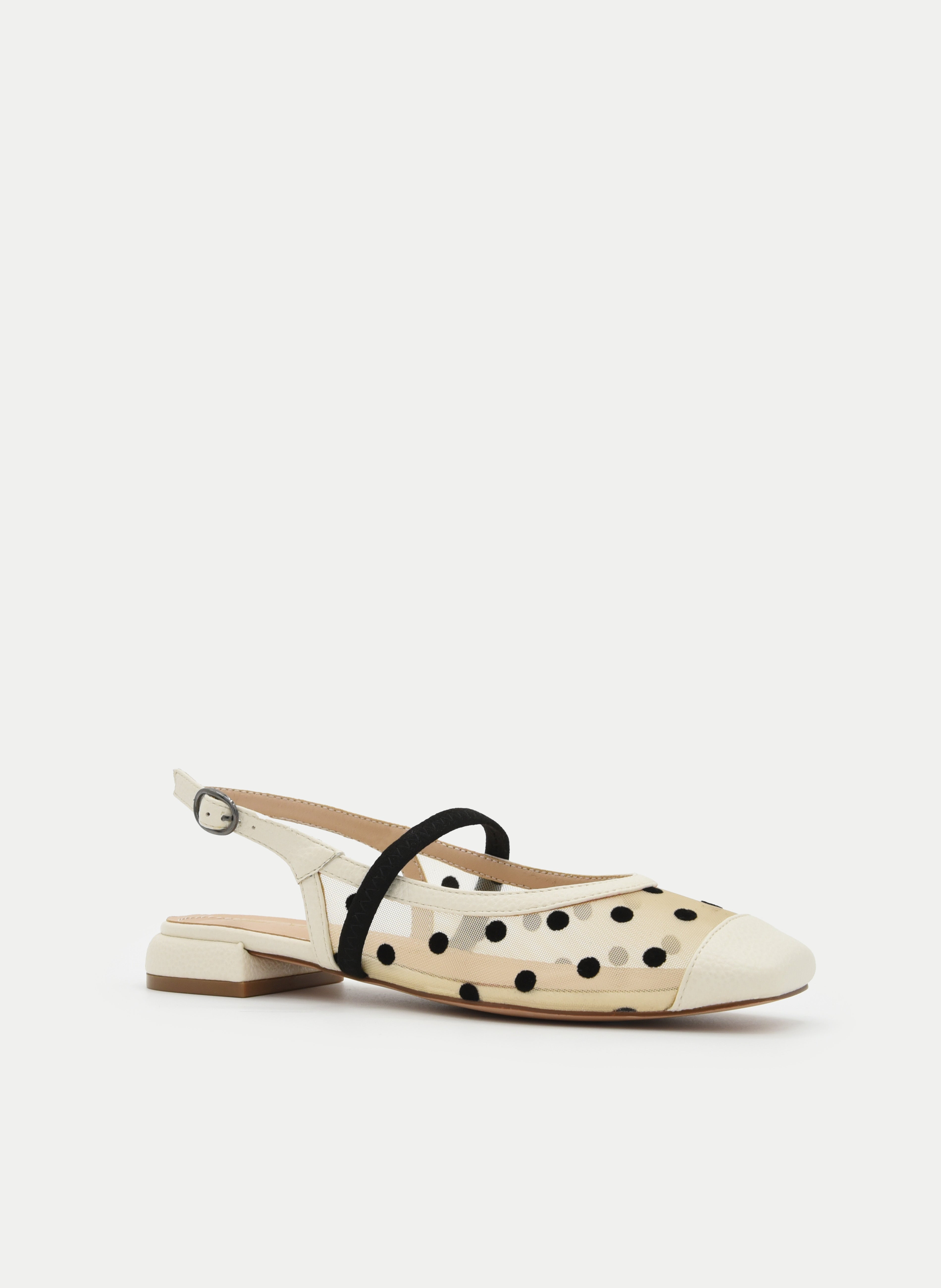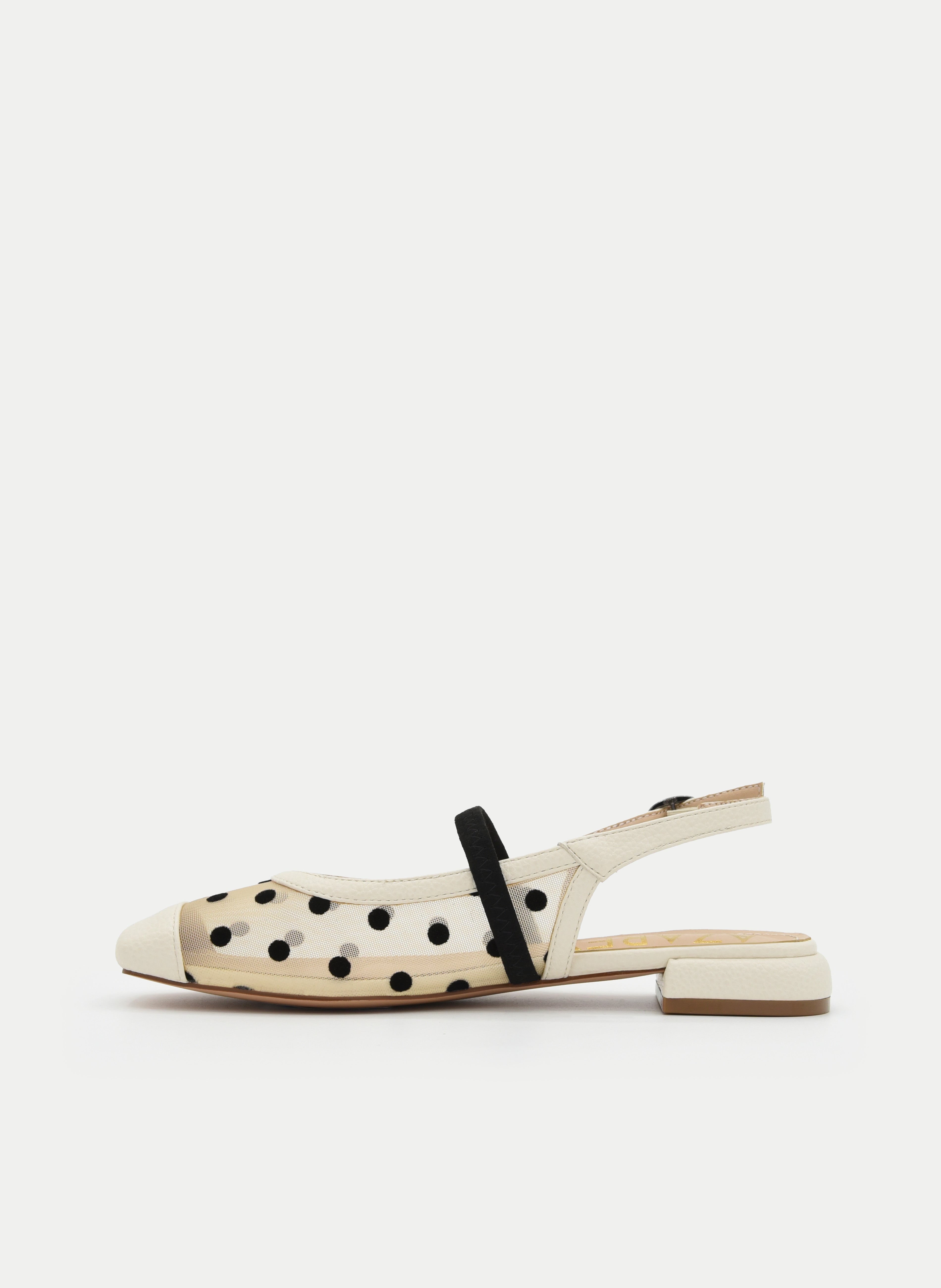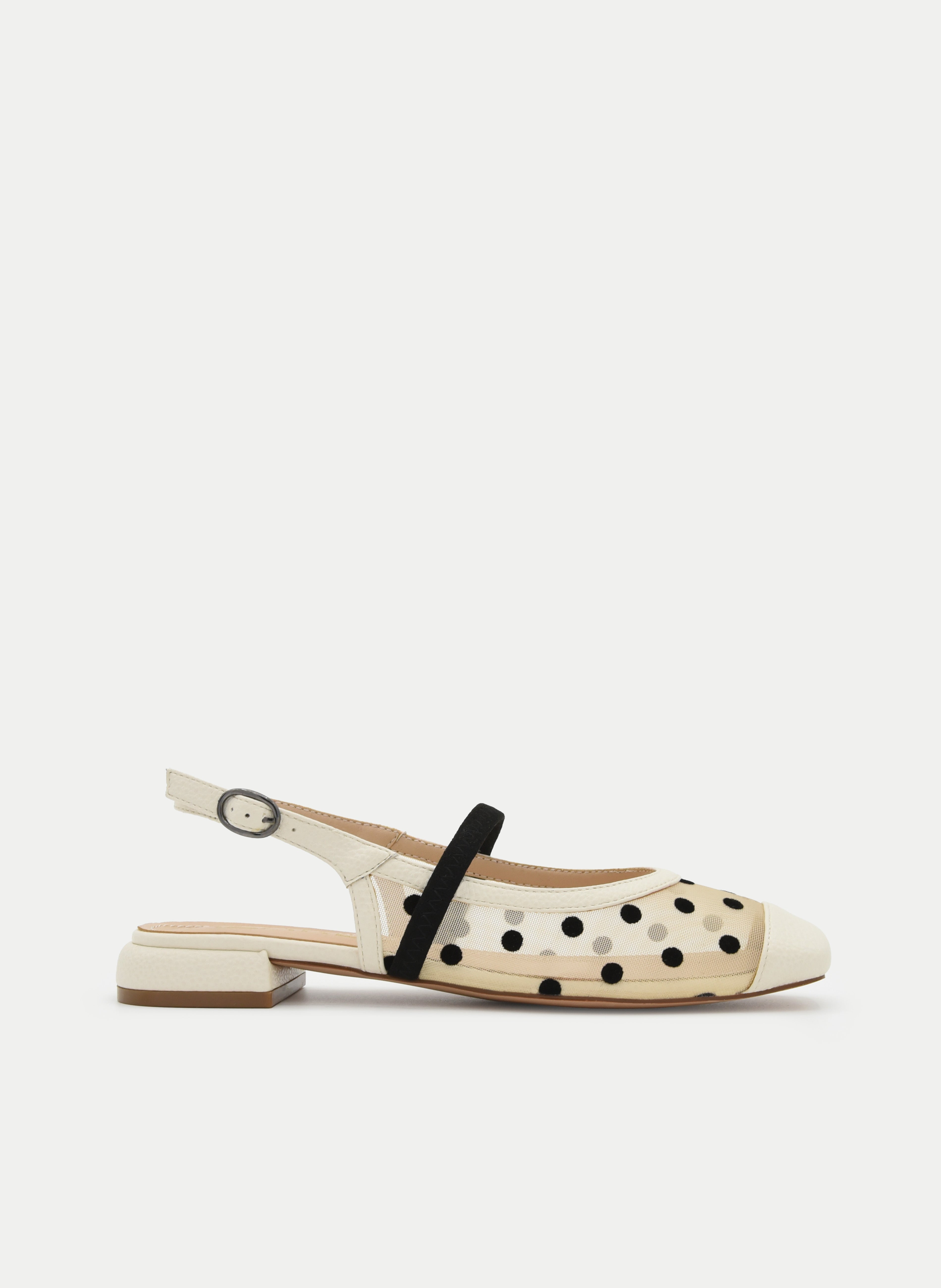 Feminine, delicate, and with a very sophisticated air. These beige backless ballerina flats with black polka dots stand out for their elegant combination of translucent polka dot fabric, rounded toe, and a refined strap design that subtly lengthens the foot.