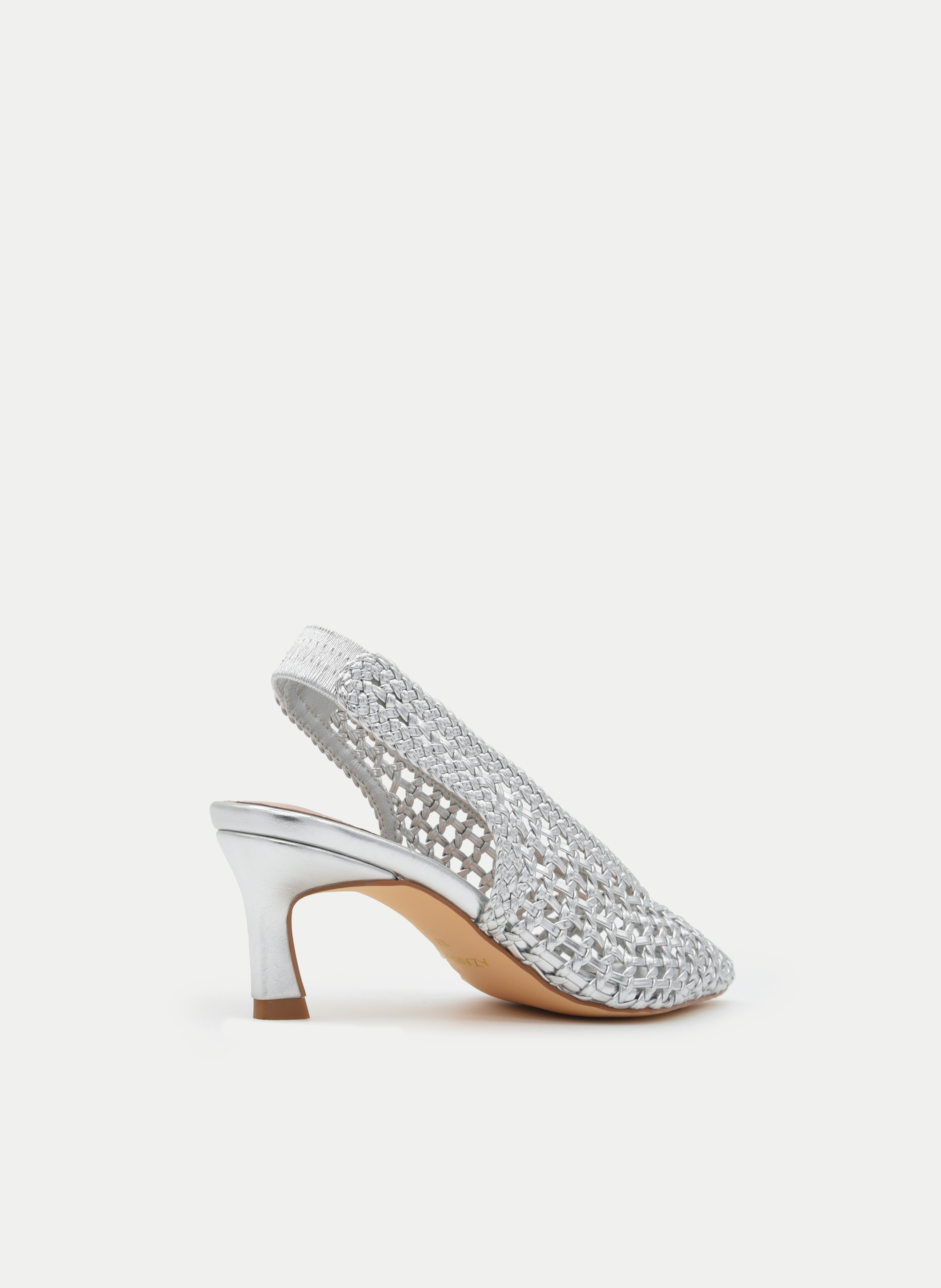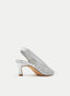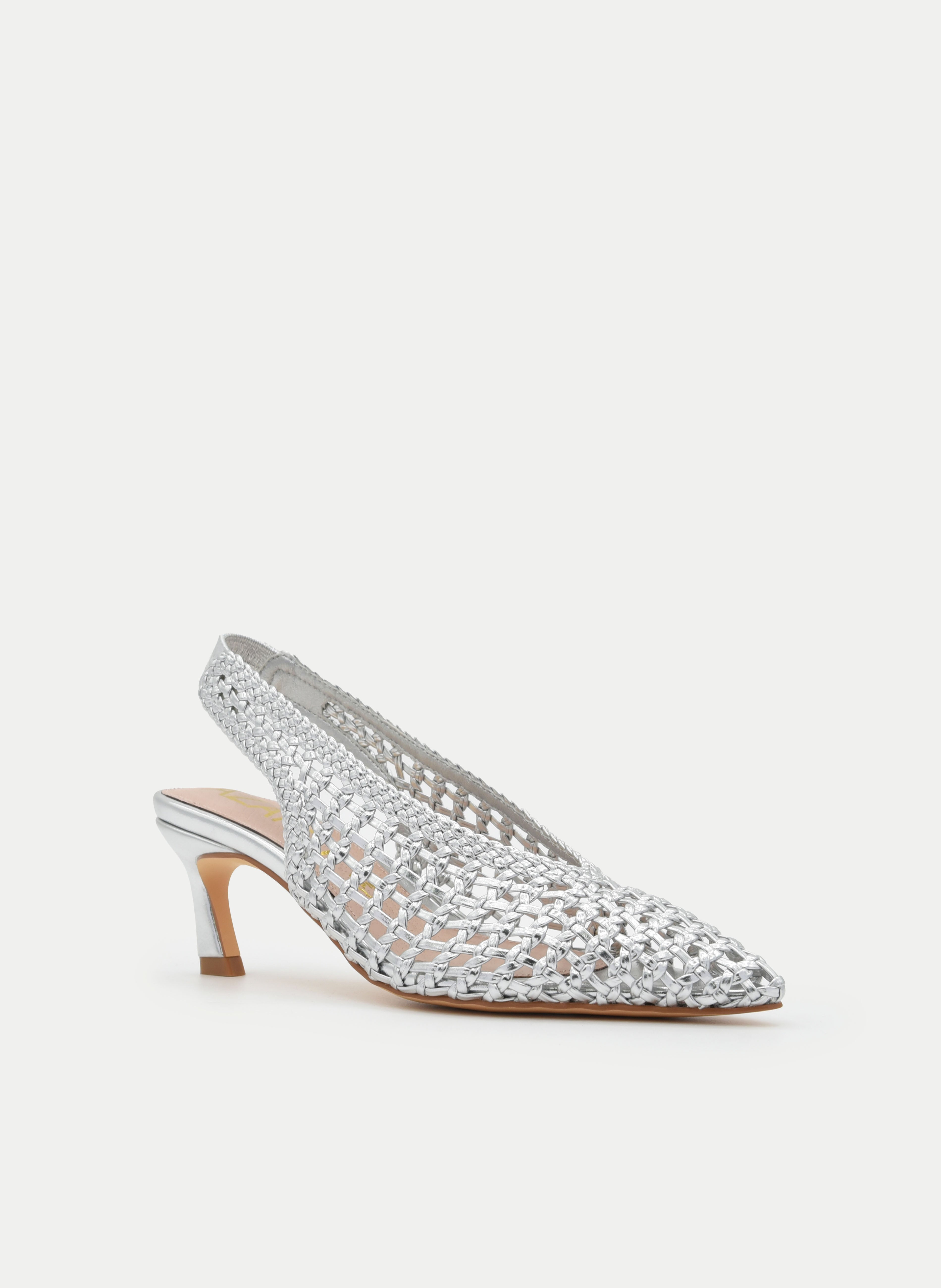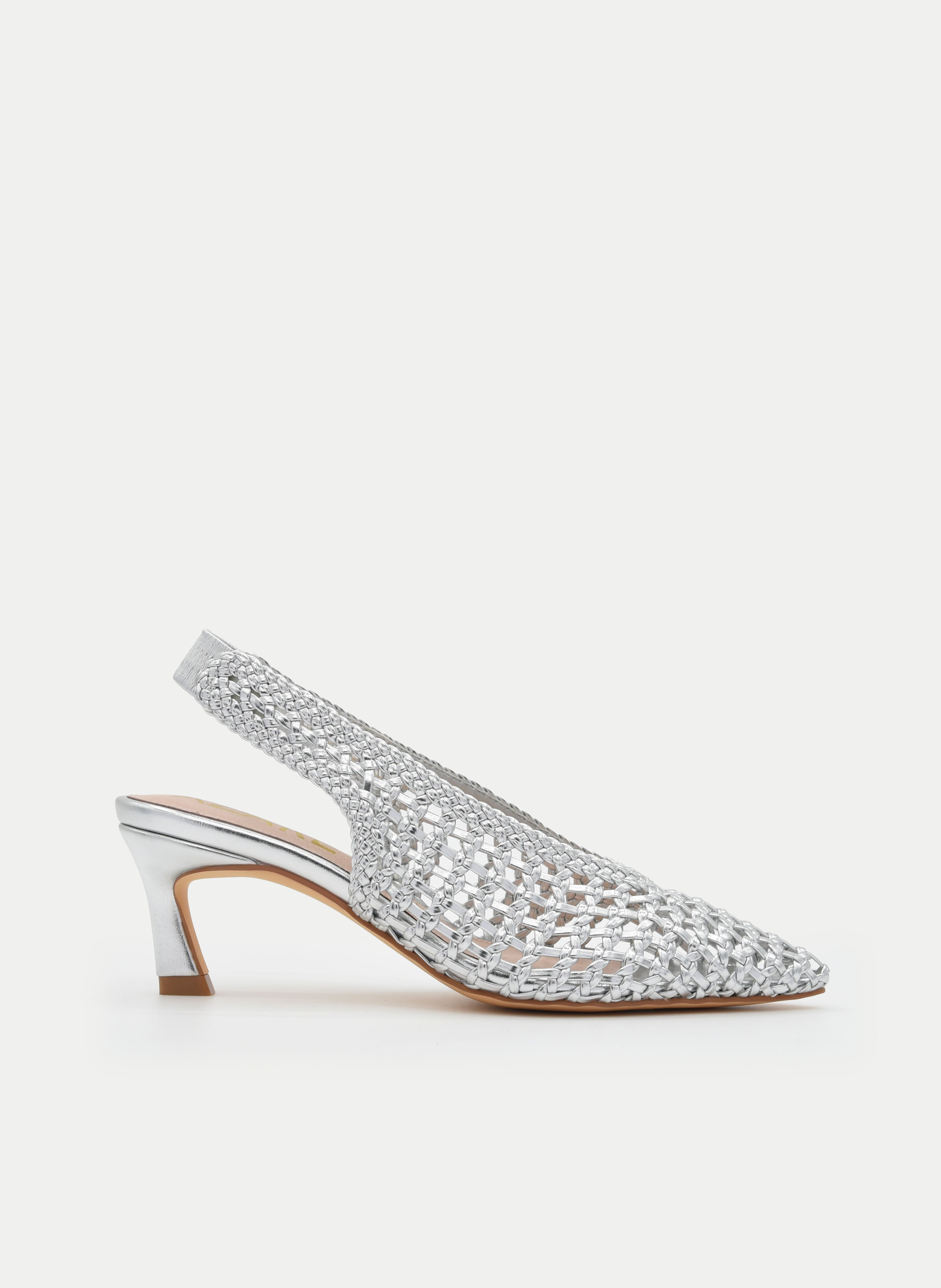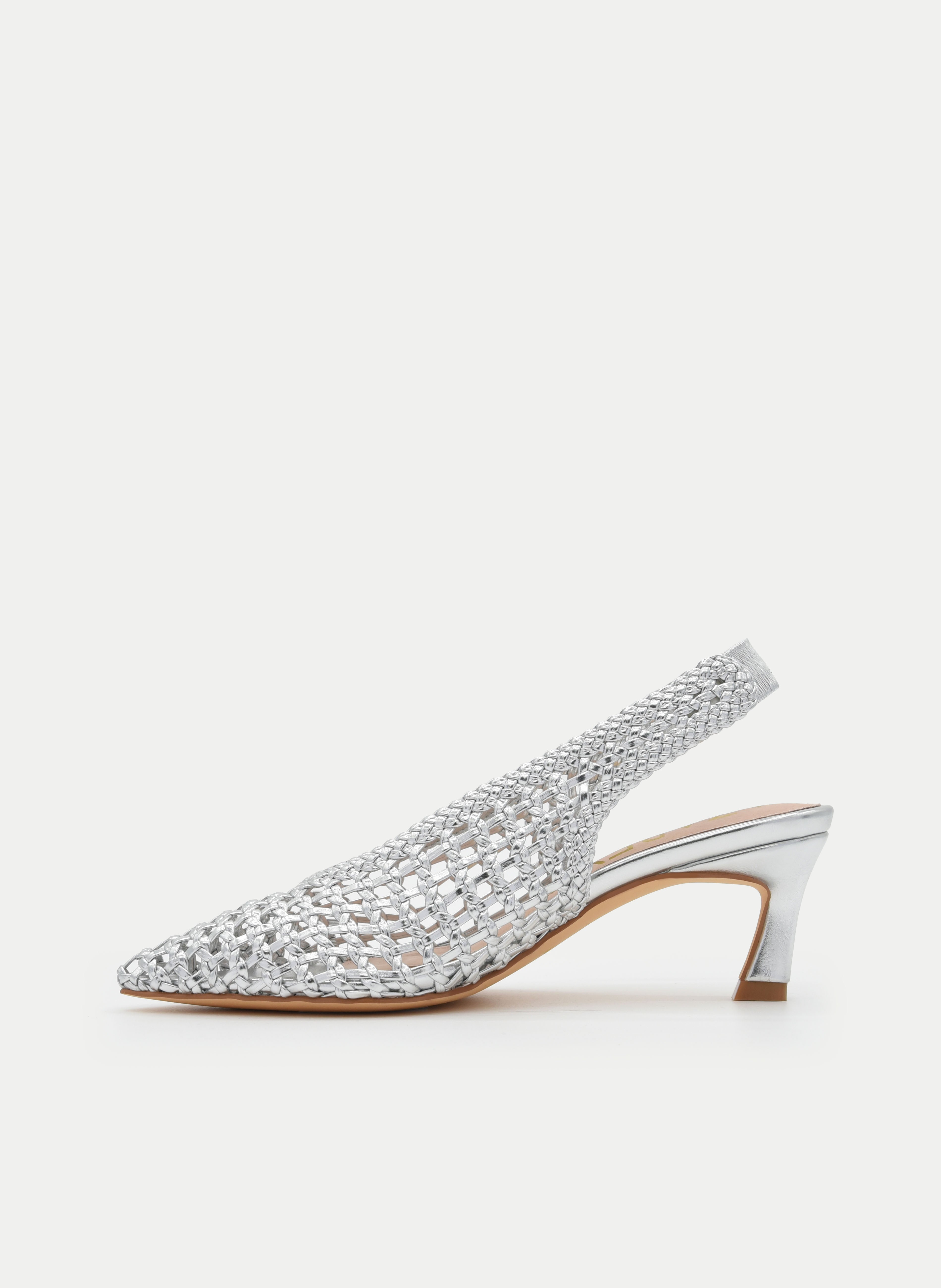 Silver slingback shoe with fine toe and openwork design that brings lightness and freshness to the silver. The finely shaped medium heel subtly elevates the silhouette without losing comfort in the step. Its open heel style, with a fitted back strap, offers a natural and elegant fit. A delicate and versatile proposal that easily combines with day and night looks, providing a sophisticated air to each occasion.
