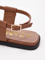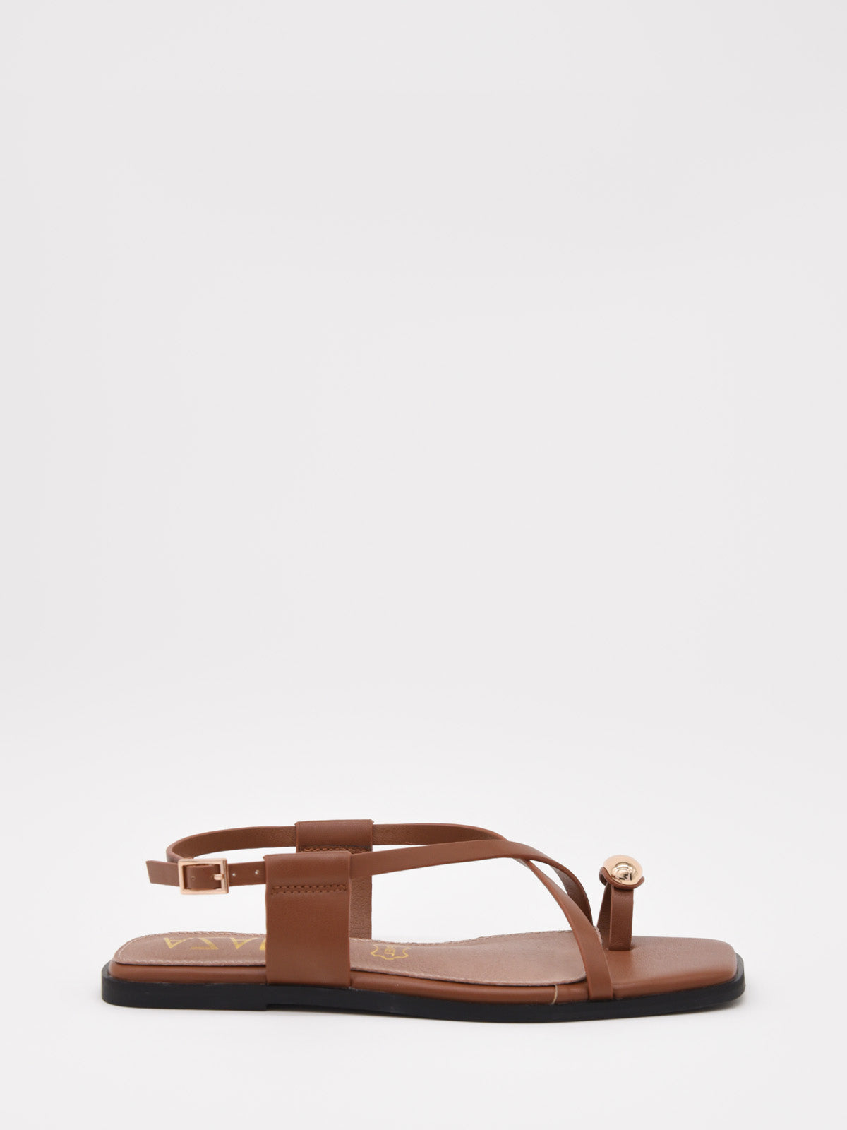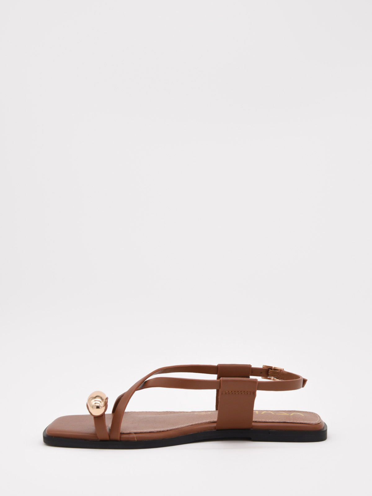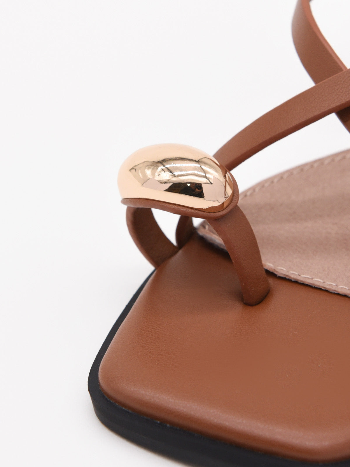 Estas sandalias planas color marrón ofrecen un diseño sencillo pero elegante con un toque moderno. Su detalle dorado minimalista en la parte frontal aporta un sutil toque de sofisticación, ideal para looks casuales o relajados. La suela acolchada garantiza comodidad durante todo el día, mientras que las tiras ajustables aseguran un ajuste perfecto. Versátiles y atemporales, son el complemento ideal para cualquier outfit veraniego.