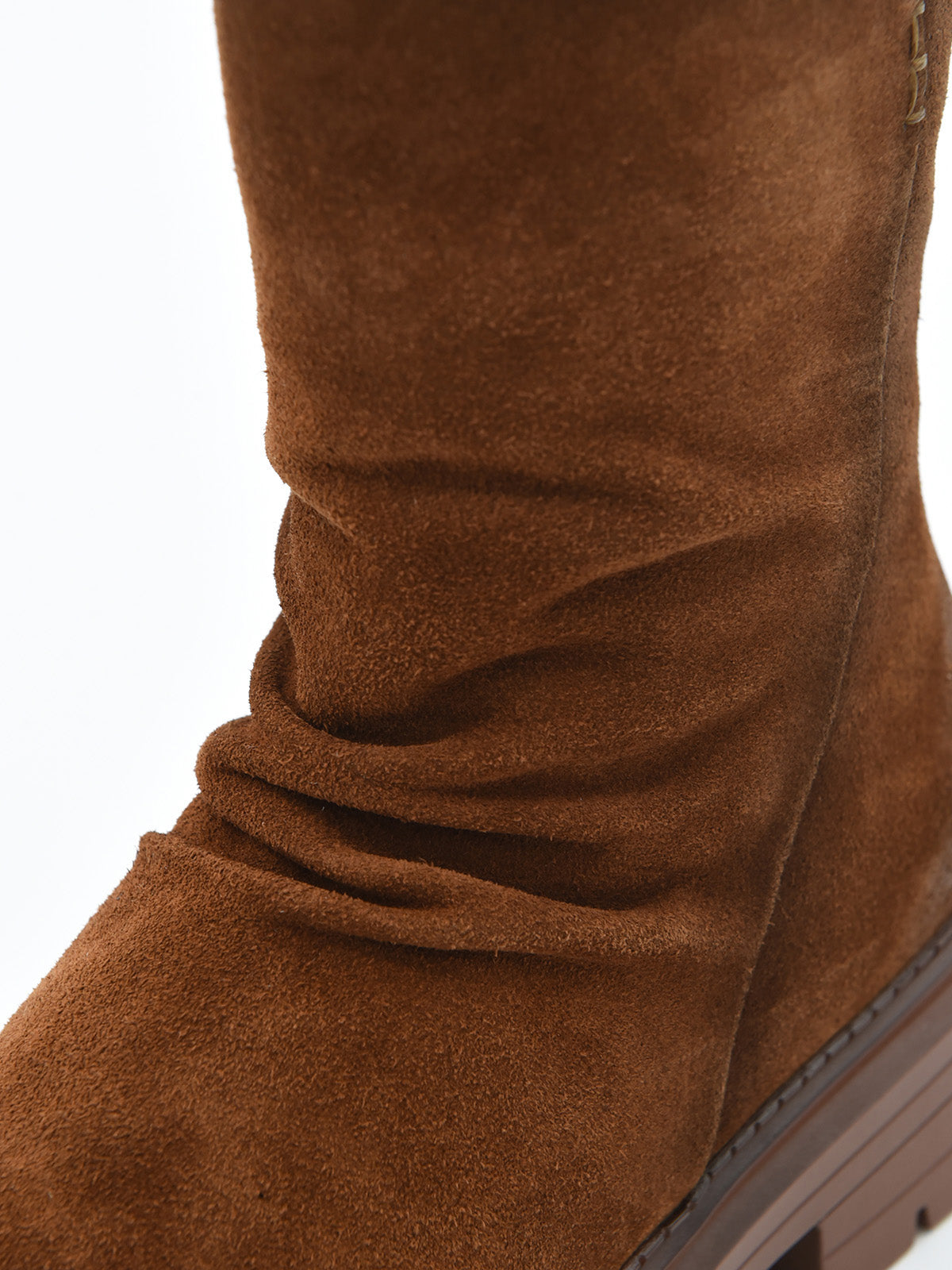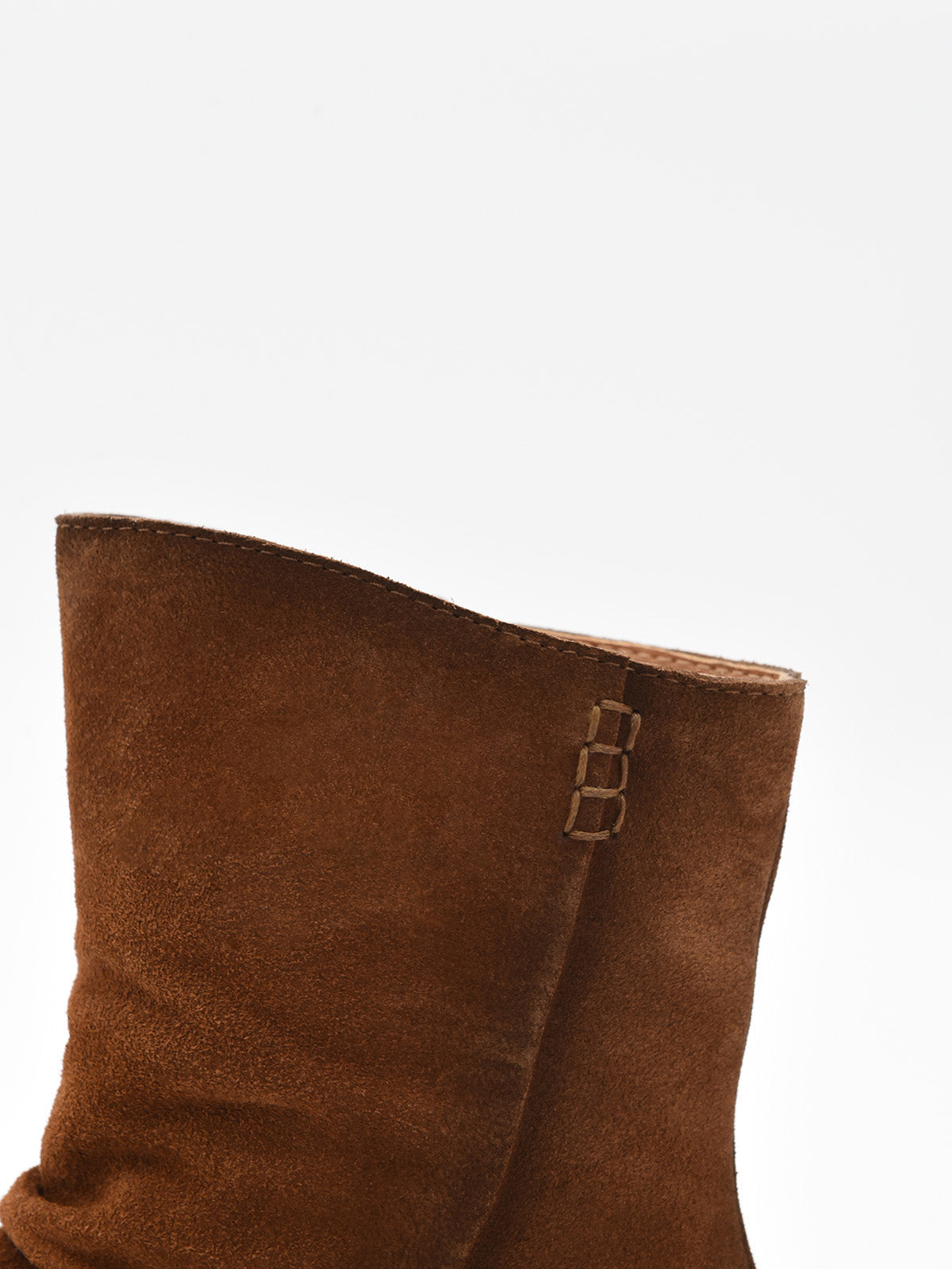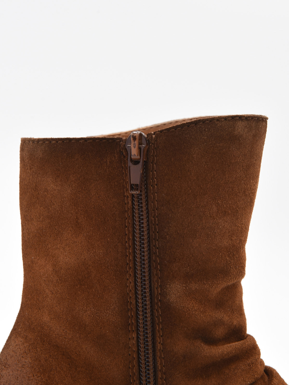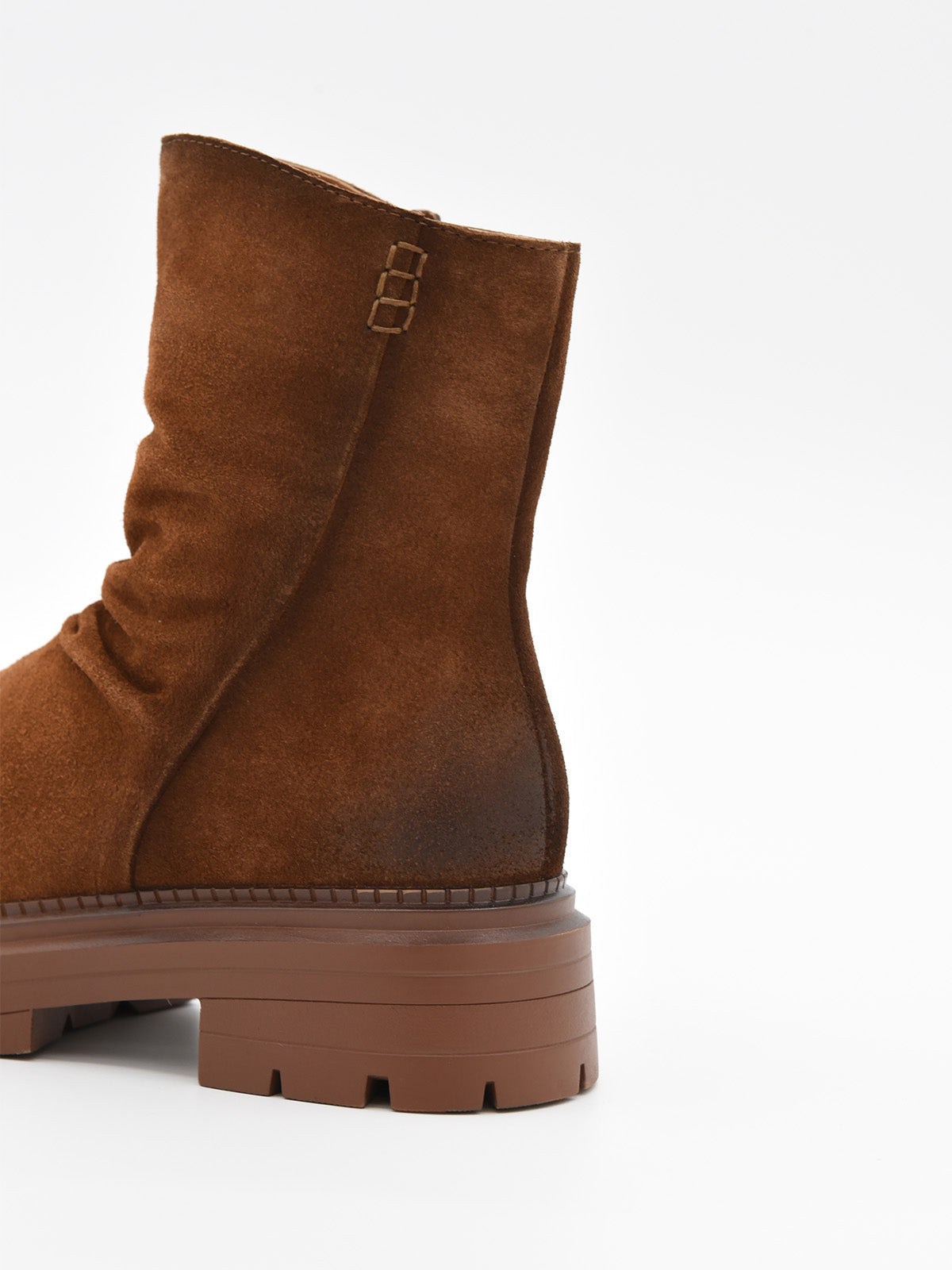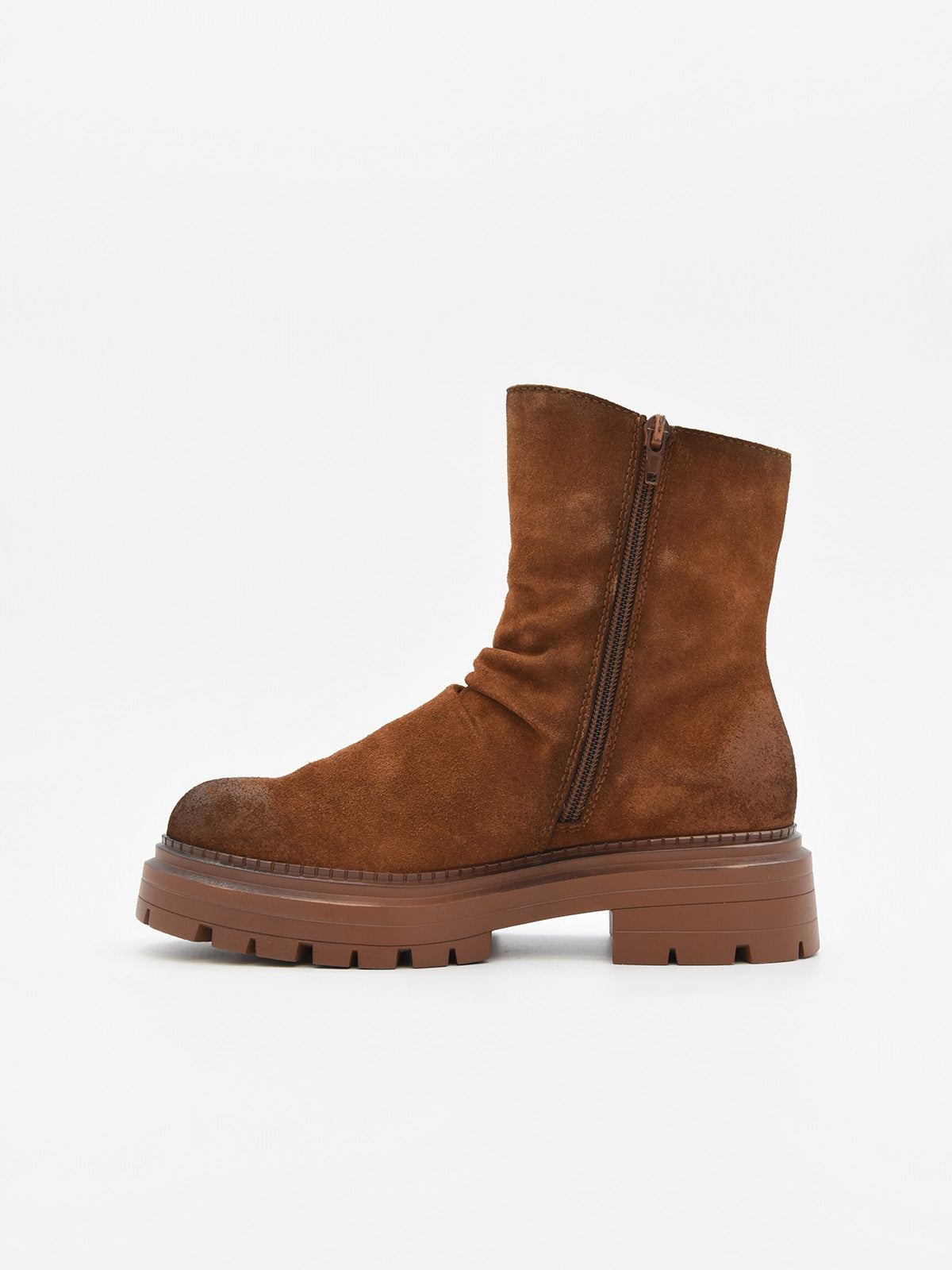 Este botín de mujer en piel serraje color cuero de la marca Nyrex, es la opción perfecta para lucir un estilo urbano, actual y cómodo en los días fríos. Fabricado en piel serraje auténtica, ofrece un acabado suave, resistente y muy fácil de combinar. Su diseño de caña media ligeramente arrugada aporta un aire desenfadado y trendy, mientras que la suela track gruesa de goma asegura máxima estabilidad, agarre y confort en cada paso.