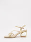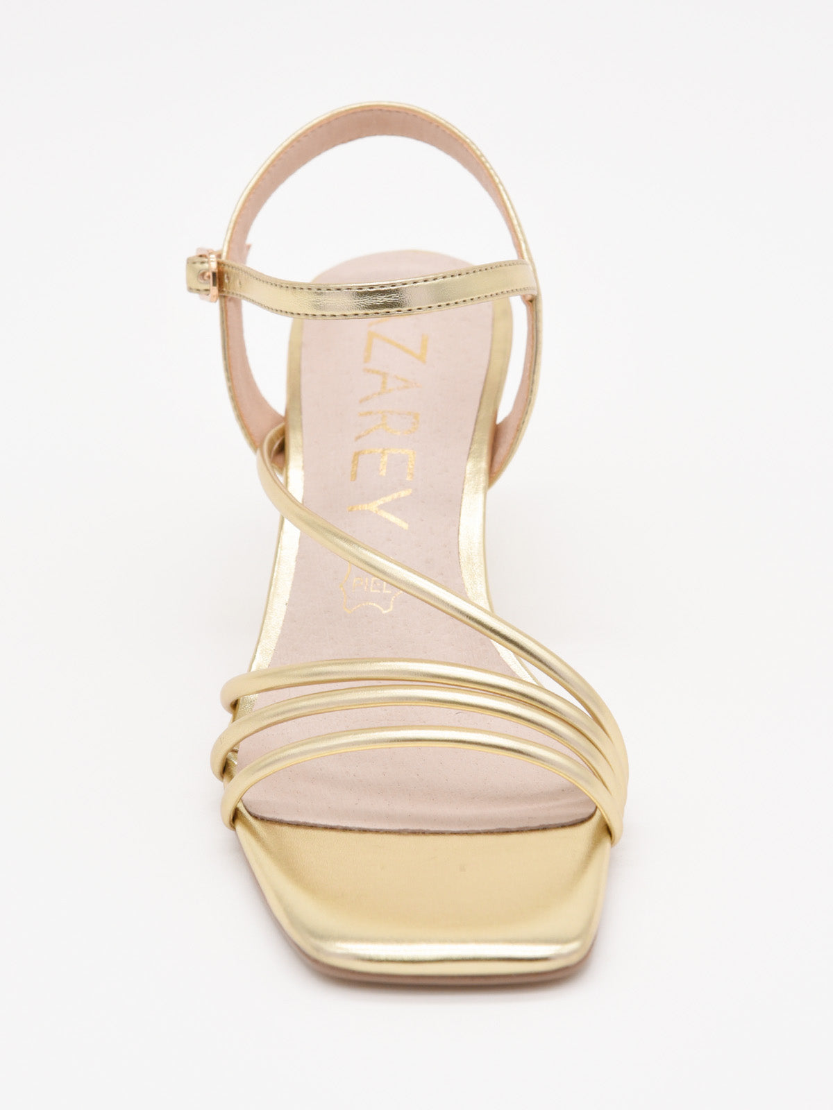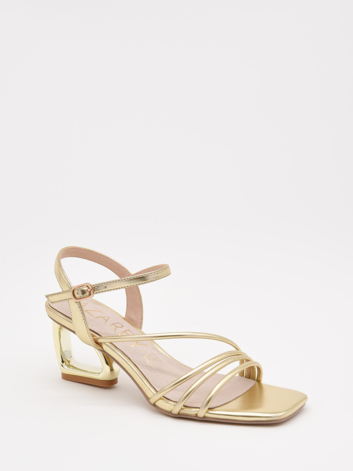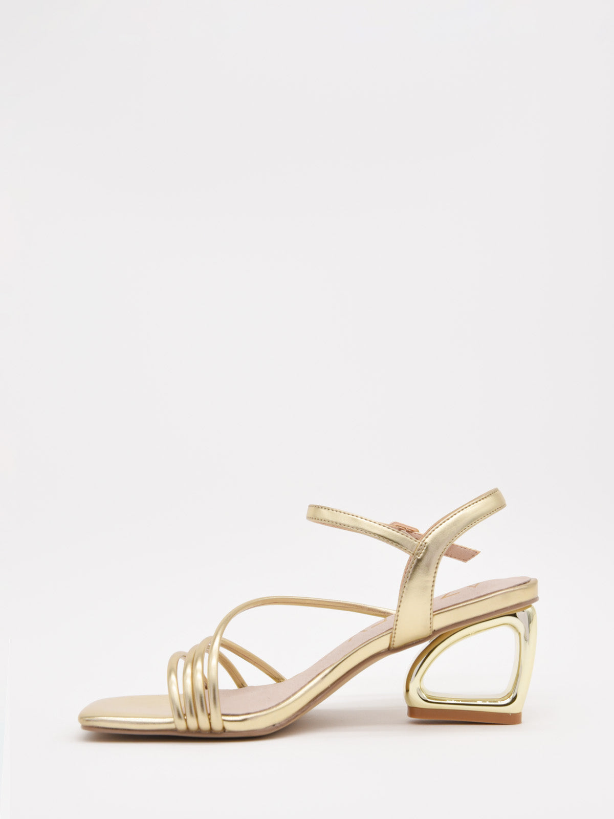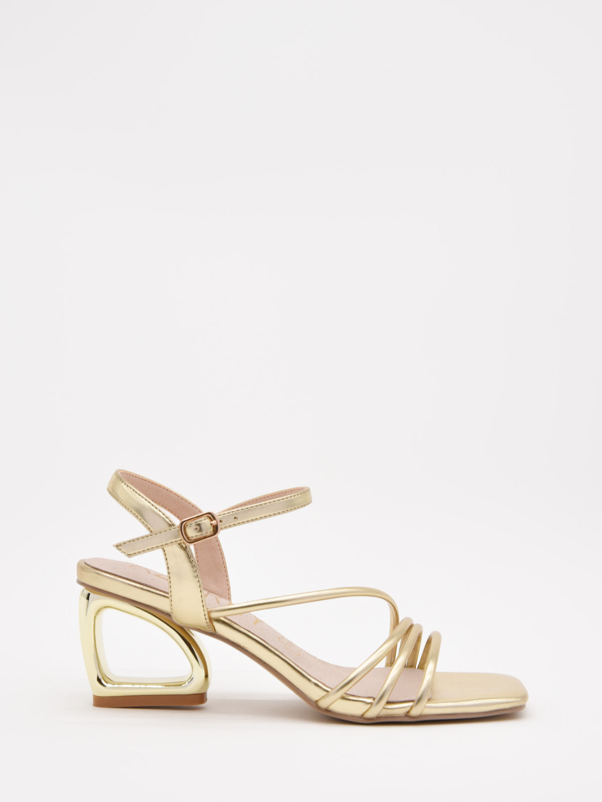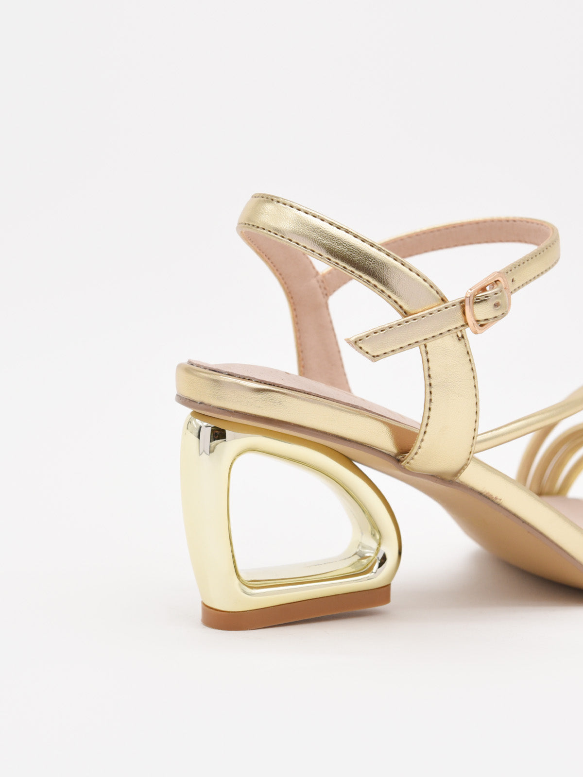 Luce sofisticada con estas sandalias doradas de tacón especial, que combinan un diseño moderno y único con máxima comodidad. Sus tiras finas de acabado metalizado crean un look minimalista y elegante, mientras que el tacón geométrico añade un toque de originalidad. Perfectas para eventos especiales o para elevar tus outfits diarios, estas sandalias cuentan con un cierre ajustable para garantizar un calce cómodo y seguro.