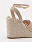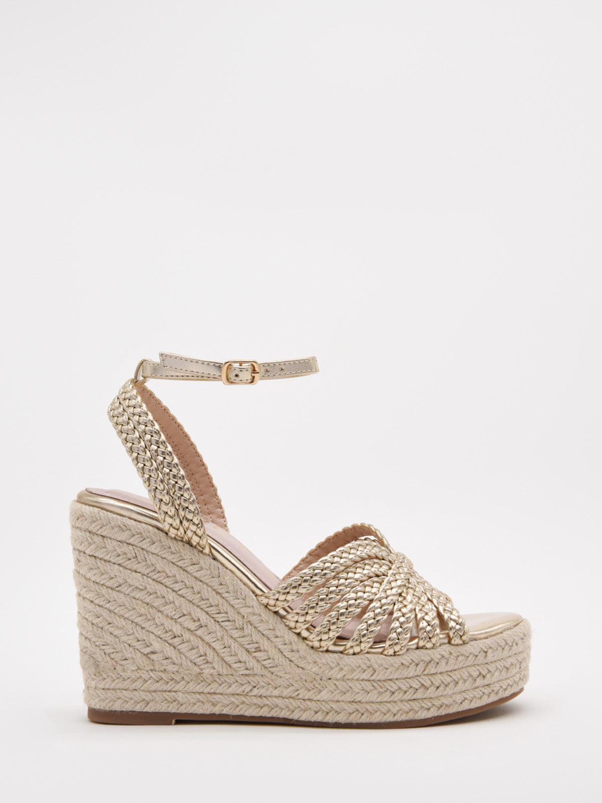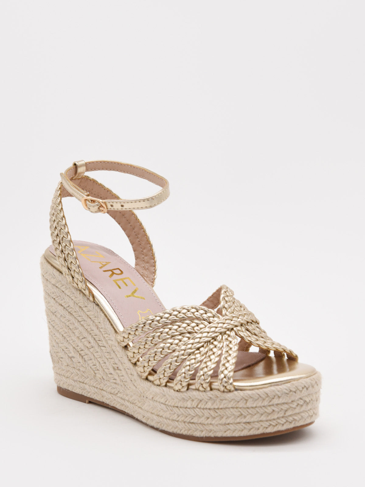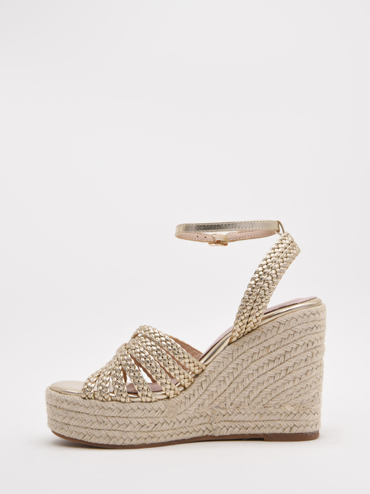 Estas cuñas doradas con plataforma de yute combinan a la perfección estilo y confort. Su diseño trenzado en tono metálico destaca por su elegancia, mientras que la plataforma de yute añade un toque natural y veraniego. Gracias a su tacón de cuña, ofrecen altura y estabilidad, ideal para lucir durante todo el día con comodidad. La tira ajustable asegura un ajuste perfecto, convirtiéndolas en una opción versátil para eventos casuales o más formales.