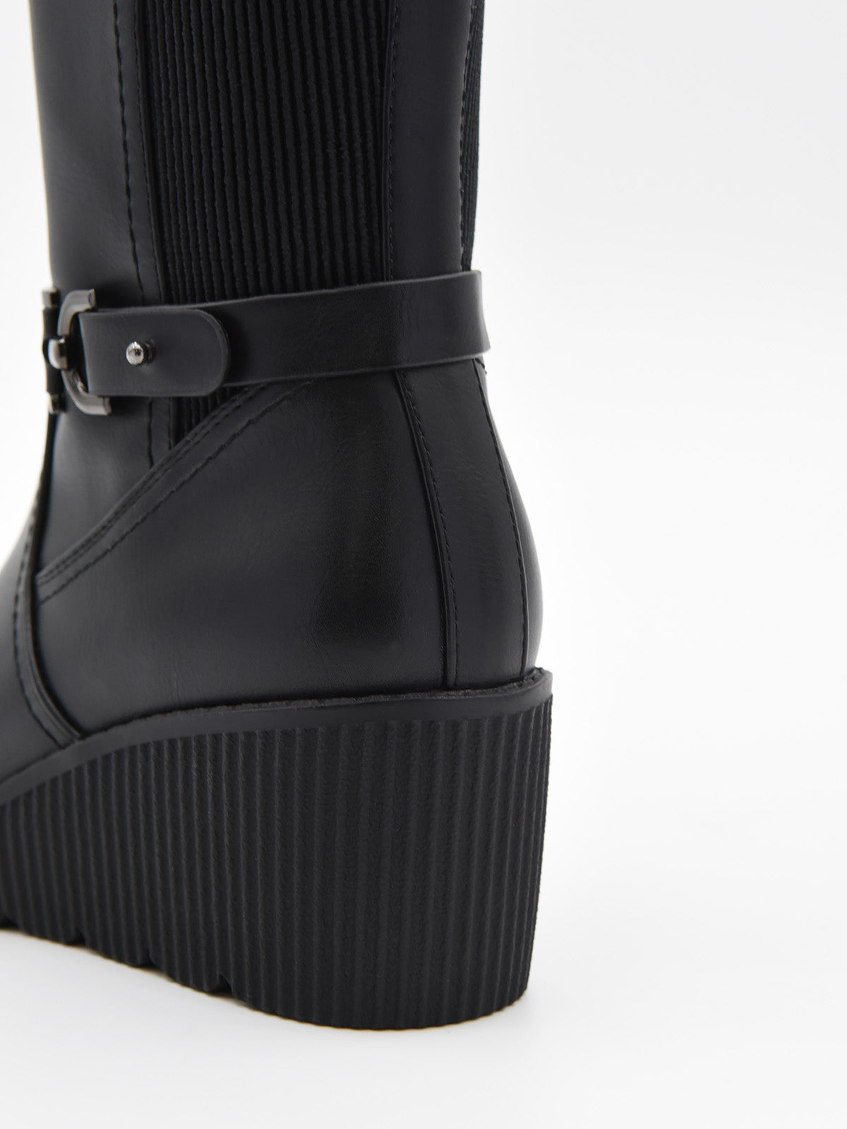 El color negro, atemporal y fácil de combinar, hace de estas botas de cuña un imprescindible en tu armario de otoño-invierno. Son perfectas para llevar con pantalones pitillo y jersey de punto oversize en un look casual, o con vestidos midi y medias tupidas para una opción más femenina y elegante. Para la oficina, funcionan muy bien con una falda lápiz y blazer estructurada, mientras que en tus planes de fin de semana puedes lucirlas con leggins de cuero y chaqueta biker.