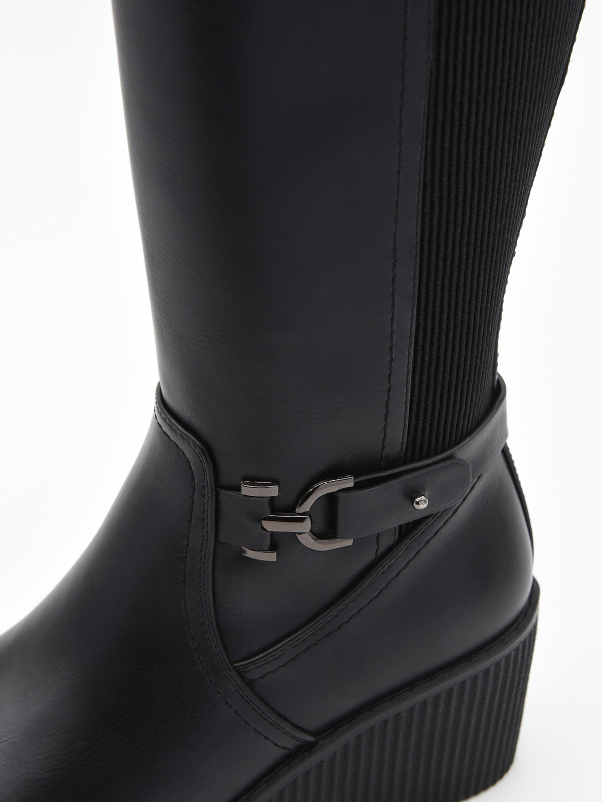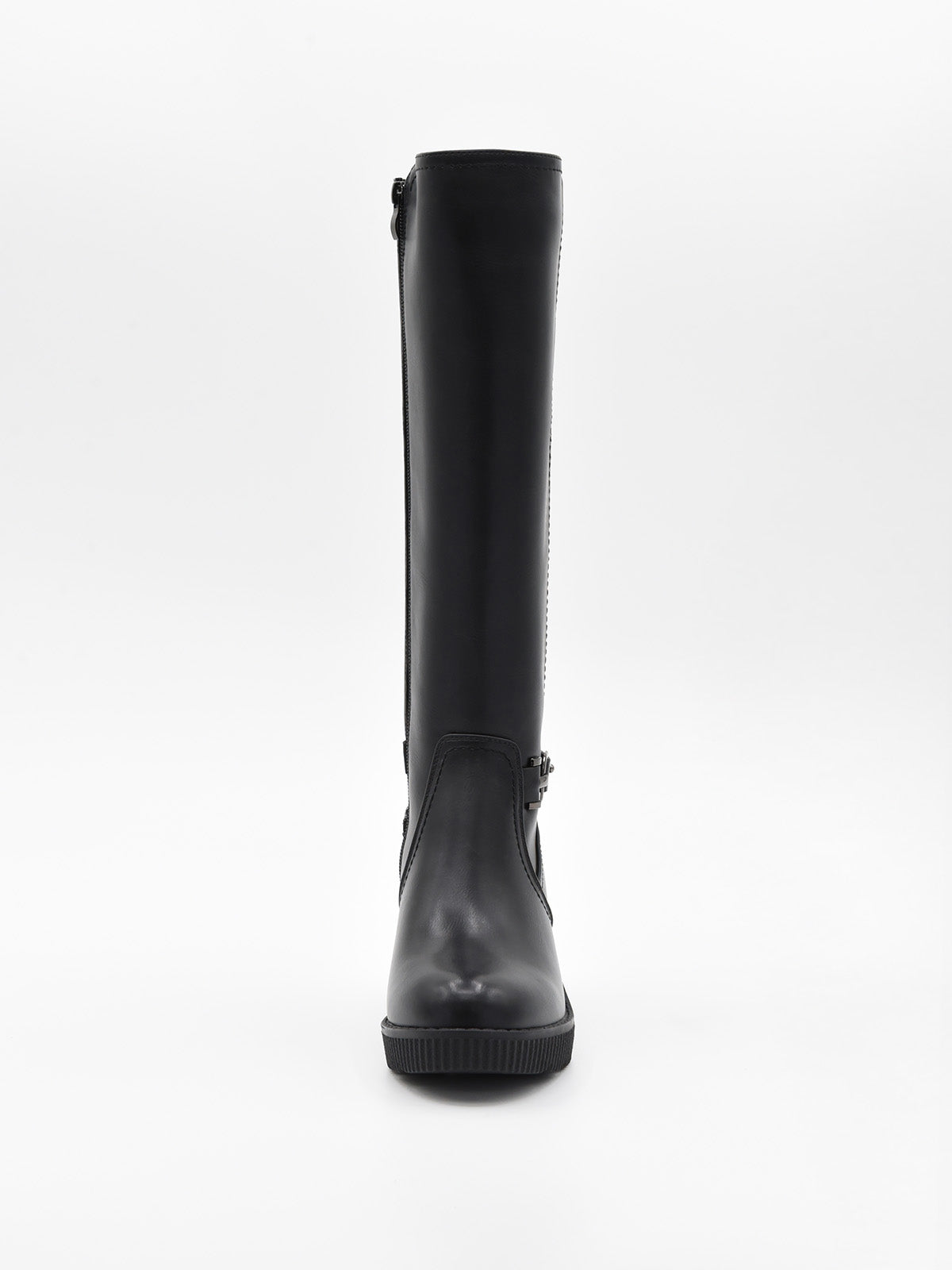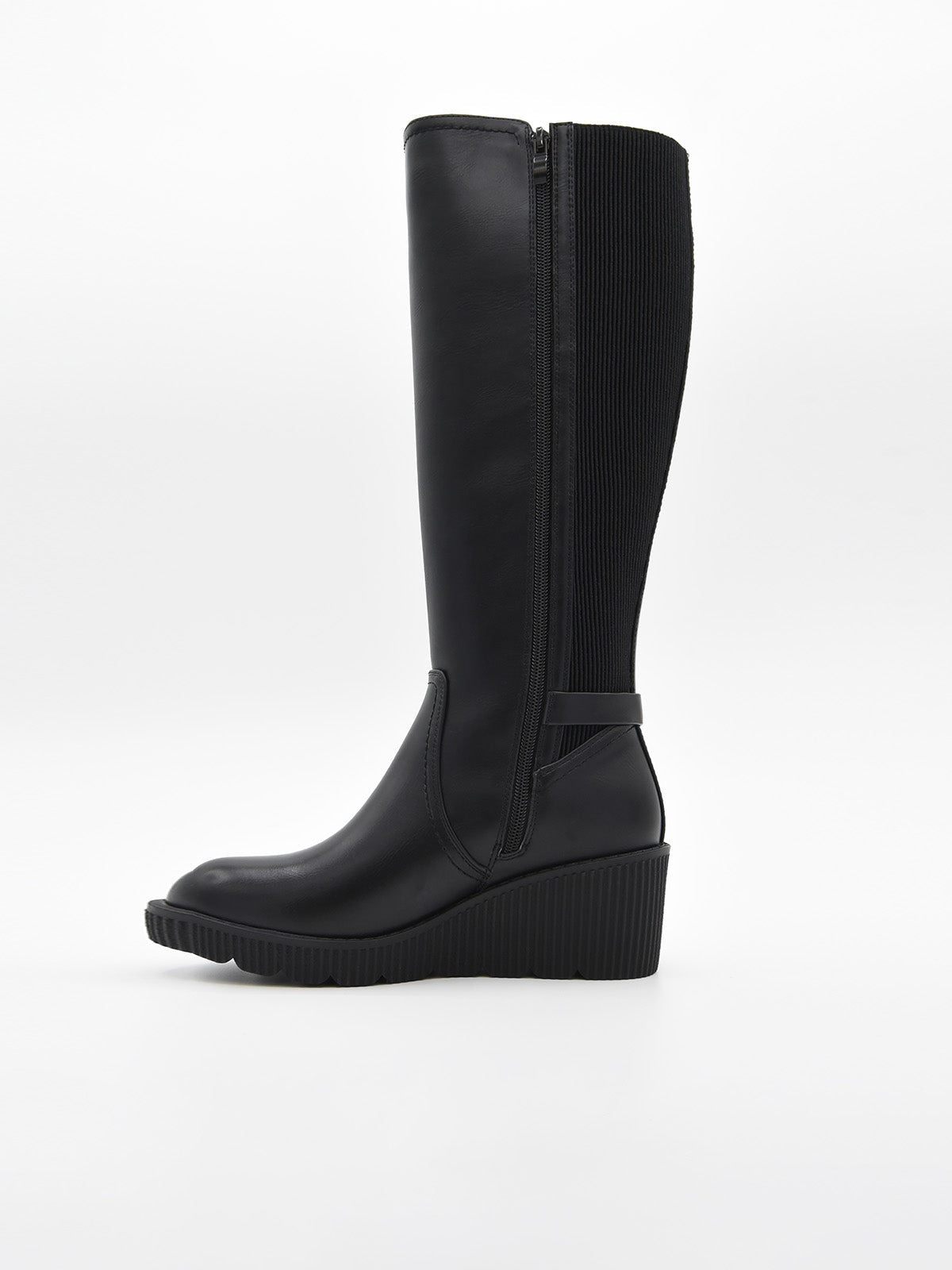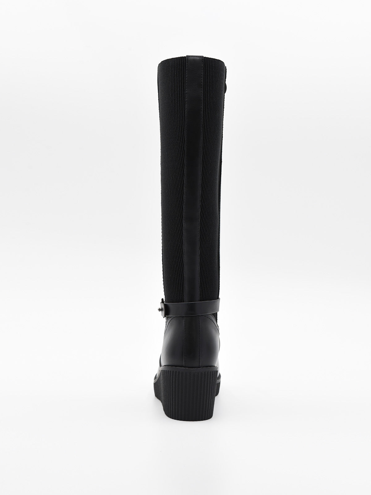 Estas botas negras de caña alta para mujer de la marca Nyrex son la combinación perfecta de sofisticación y comodidad. Con un diseño versátil de cuña media que estiliza la figura sin renunciar al confort. El detalle de hebilla metálica en el tobillo y la parte trasera elástica aportan un ajuste perfecto y un acabado moderno, ideal para elevar cualquier look de temporada.