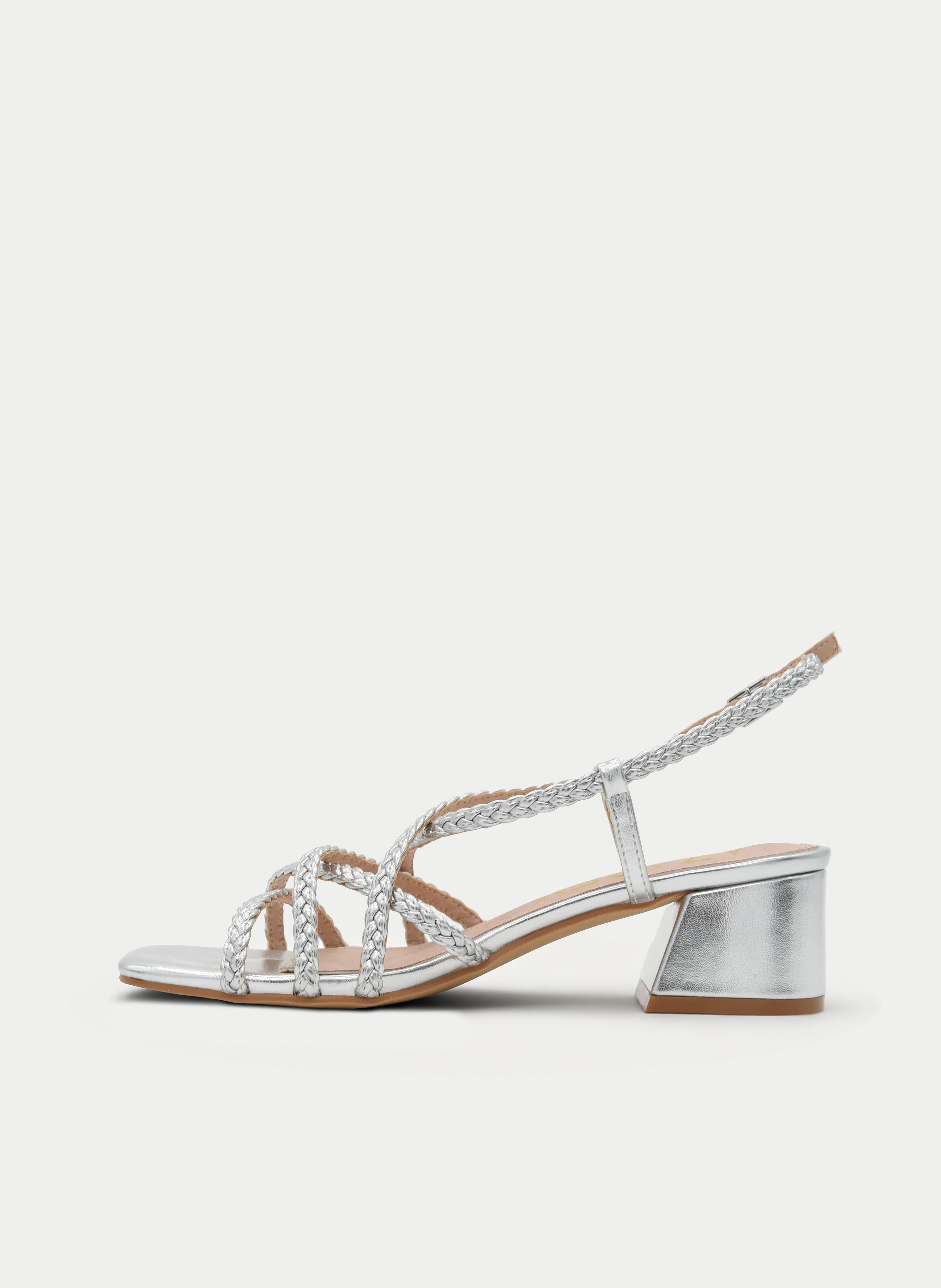 Sandalias plateadas con tiras trenzadas y tacón medio