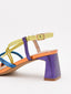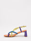 Estas sandalias de tacón bajo multicolor combinan elegancia y comodidad en un diseño único y moderno. Con tiras metálicas en tonos vibrantes como morado, azul, dorado y naranja, estas sandalias aportan un toque de sofisticación a cualquier look. Su tacón cuadrado proporciona estabilidad, mientras que el diseño de tiras entrelazadas asegura un ajuste cómodo y seguro. Ideales para largas jornadas o eventos especiales, están confeccionadas en piel de alta calidad, lo que garantiza durabilidad y estilo.