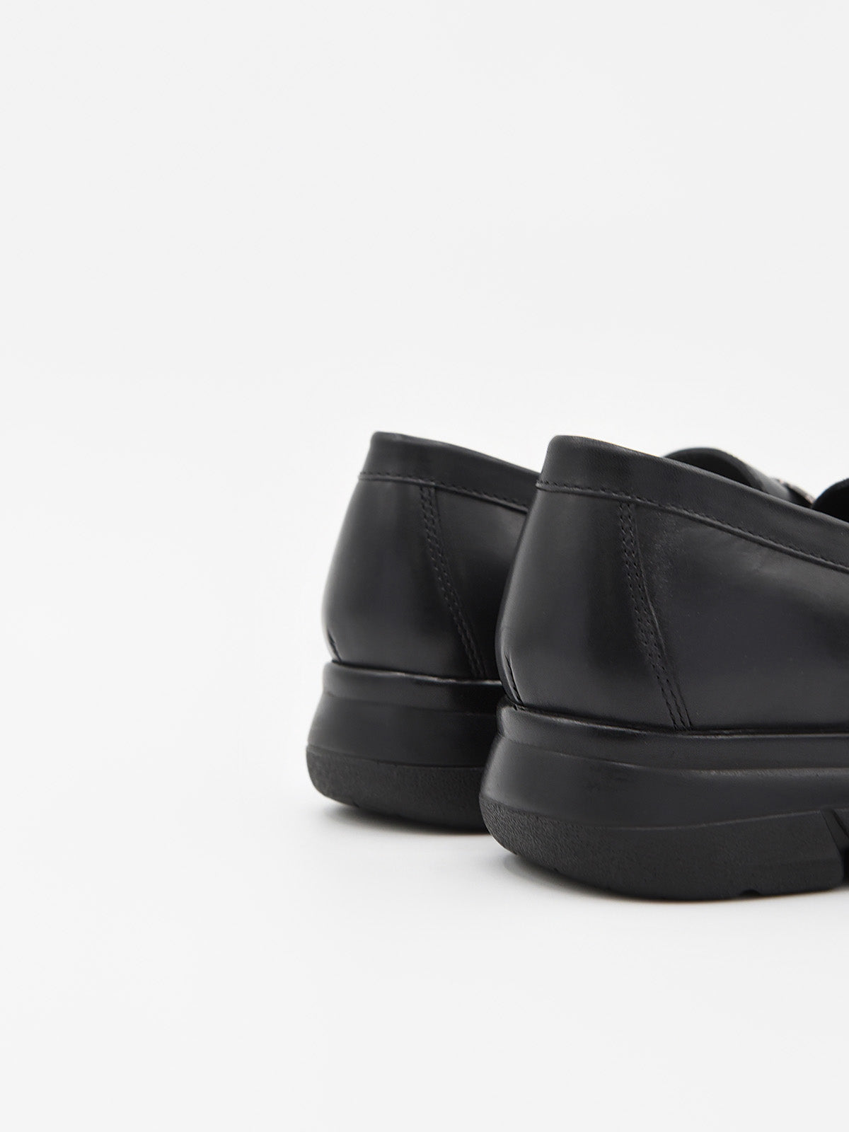 El mocasín de piel negra con suela ergonómica es la elección perfecta para quienes buscan estilo y confort en un solo diseño. Fabricado en piel de alta calidad, incorpora un detalle metálico en el empeine que aporta un toque sofisticado y contemporáneo, diferenciándose del mocasín clásico.