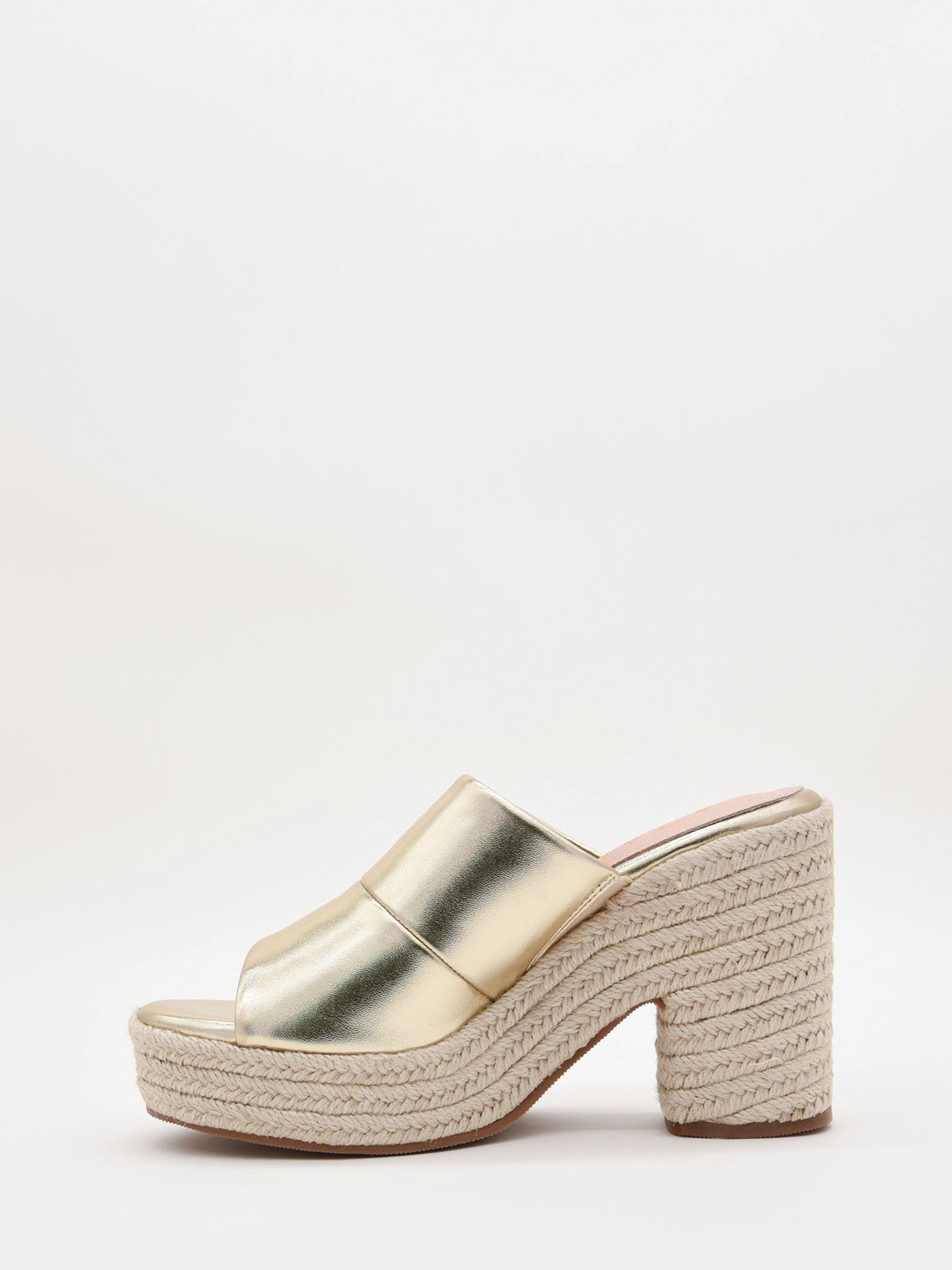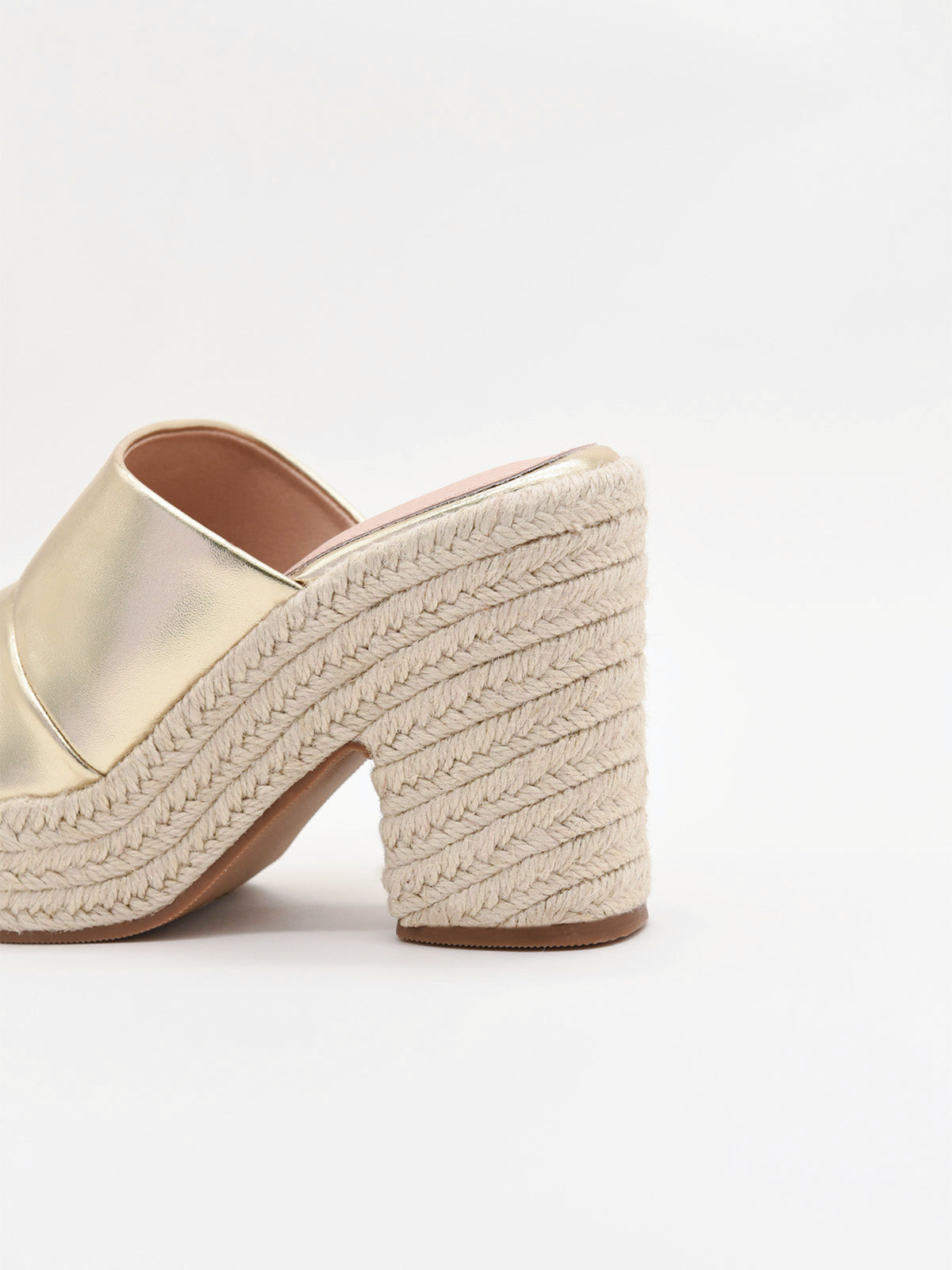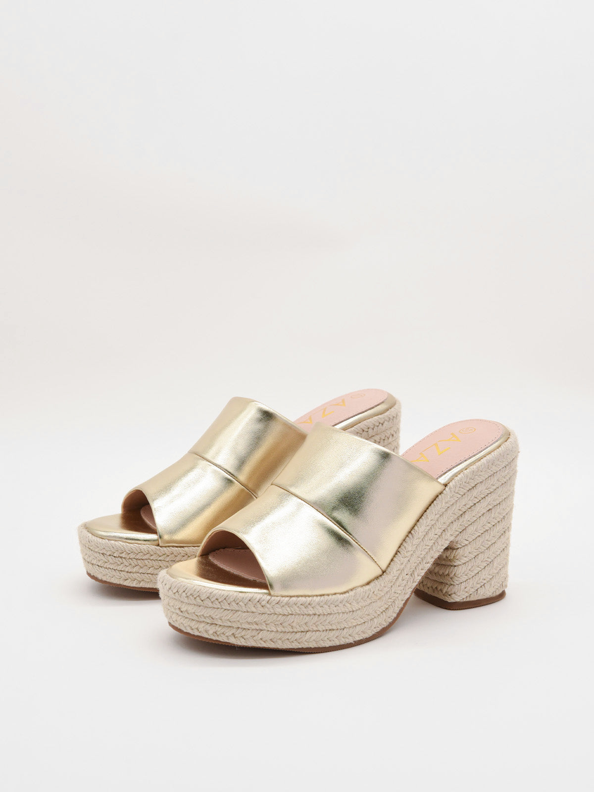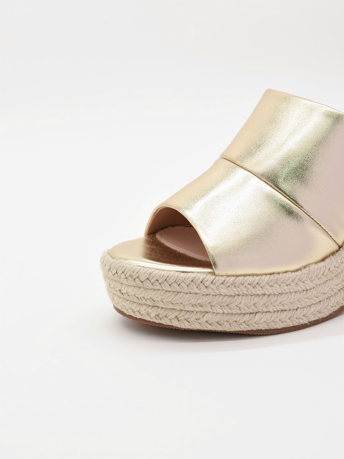 Eleva tu estilo con estas sandalias doradas de plataforma de yute. Su diseño metalizado añade un toque sofisticado, mientras que su tacón ancho brinda estabilidad y comodidad para el día a día. Perfectas para combinar con looks casuales o más elegantes.
