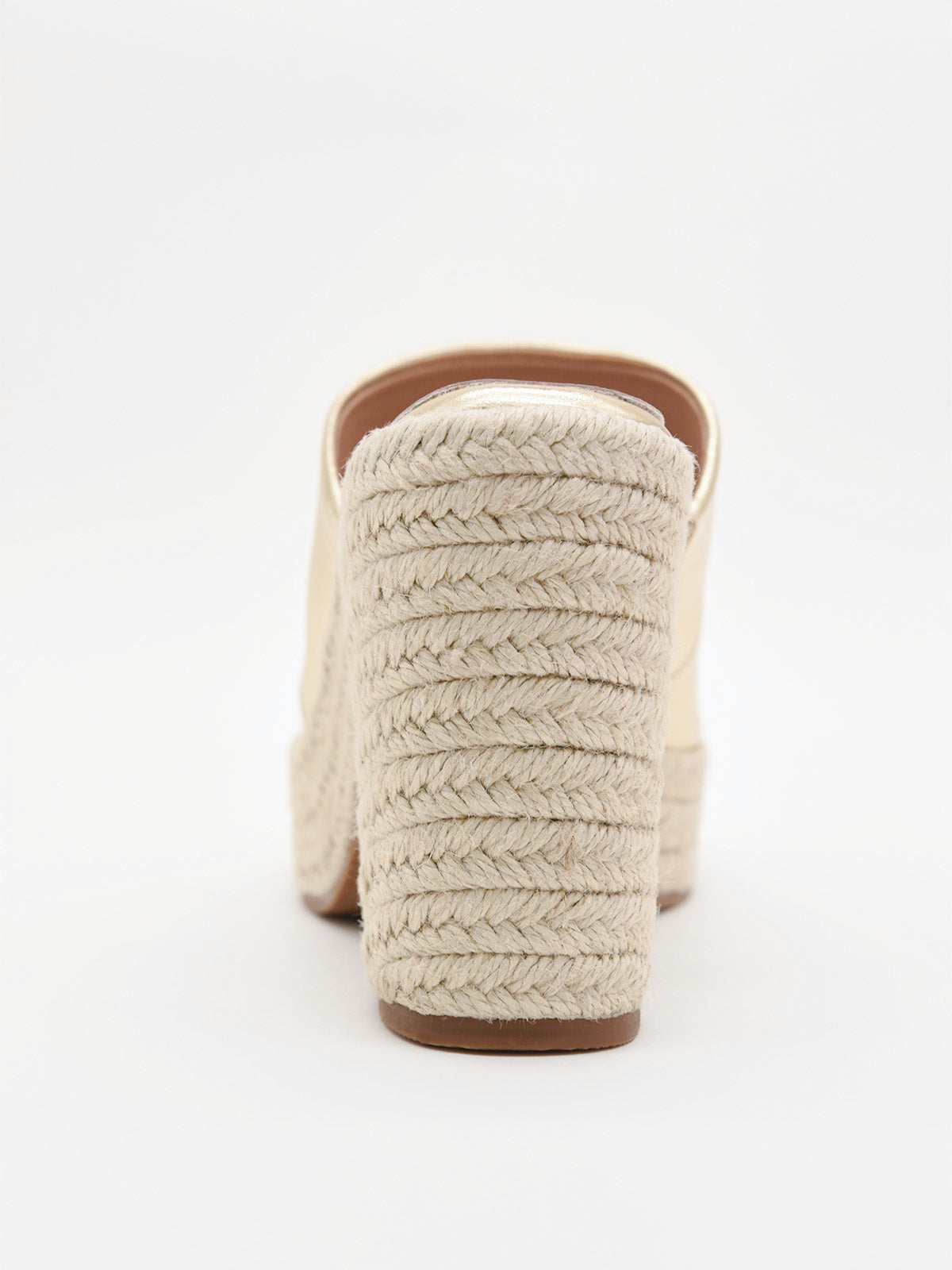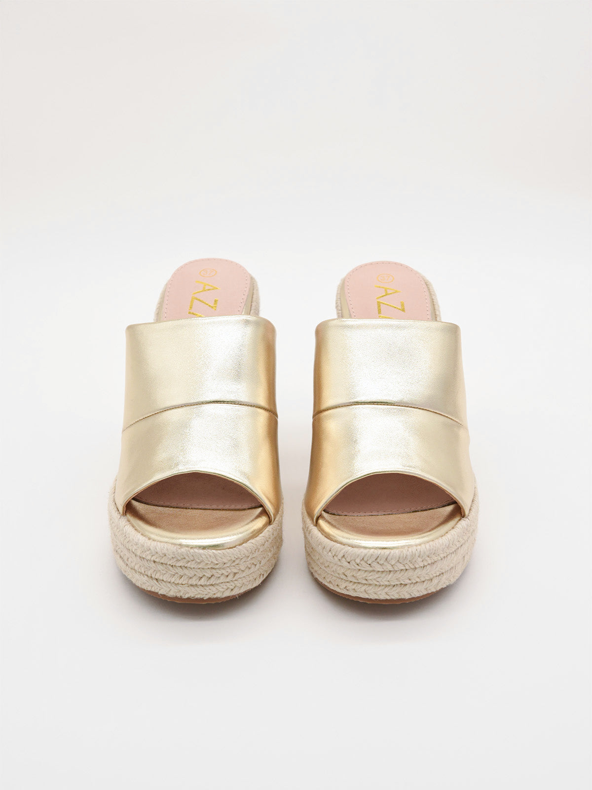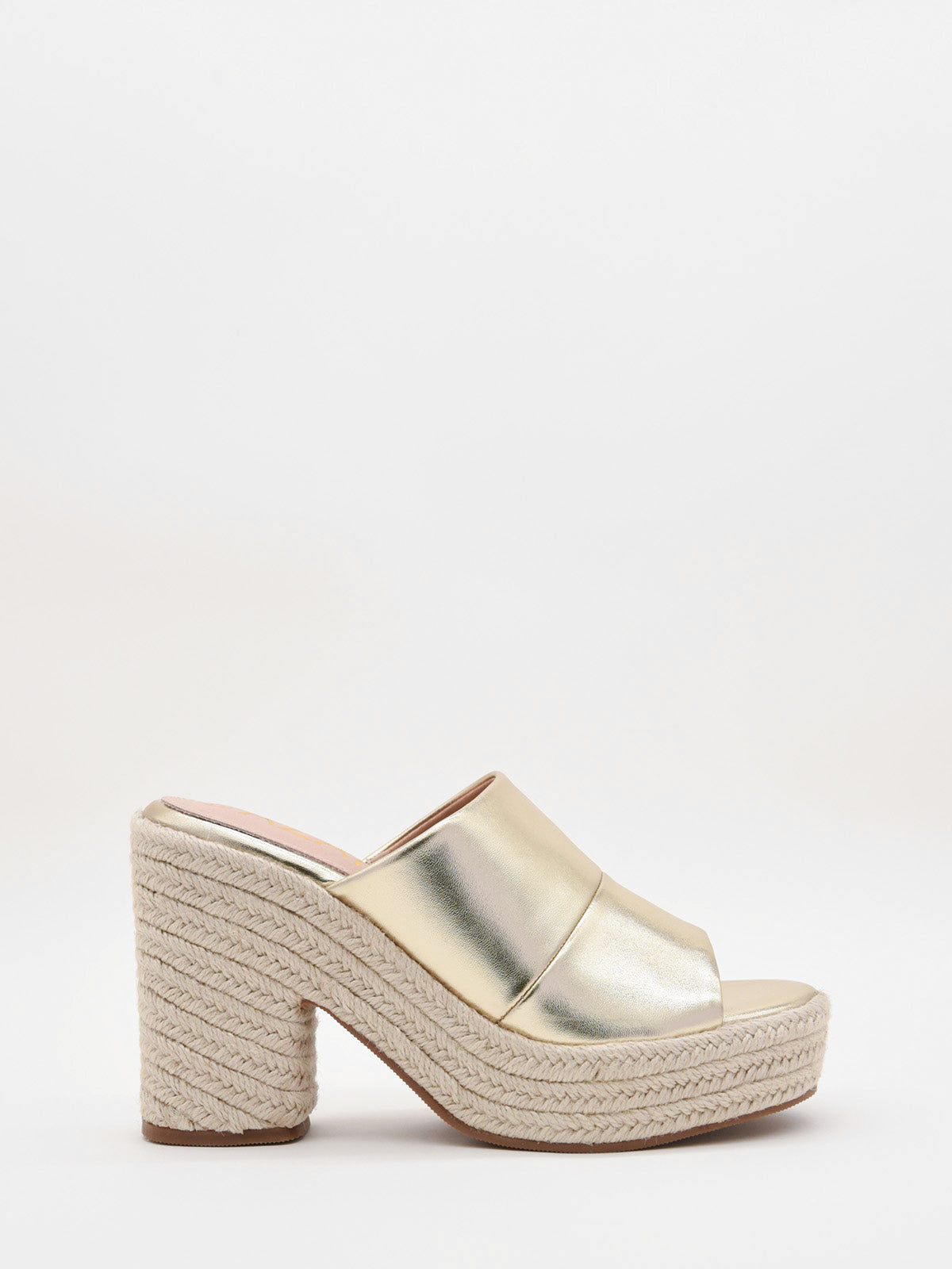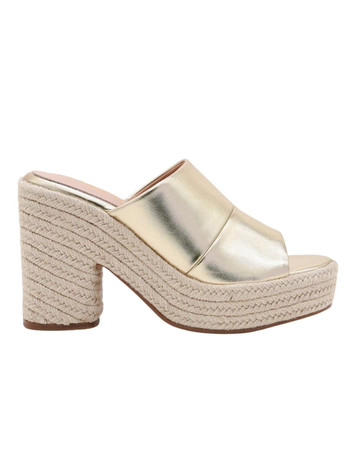 Eleva tu estilo con estas sandalias doradas de plataforma de yute. Su diseño metalizado añade un toque sofisticado, mientras que su tacón ancho brinda estabilidad y comodidad para el día a día. Perfectas para combinar con looks casuales o más elegantes.