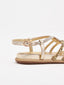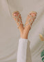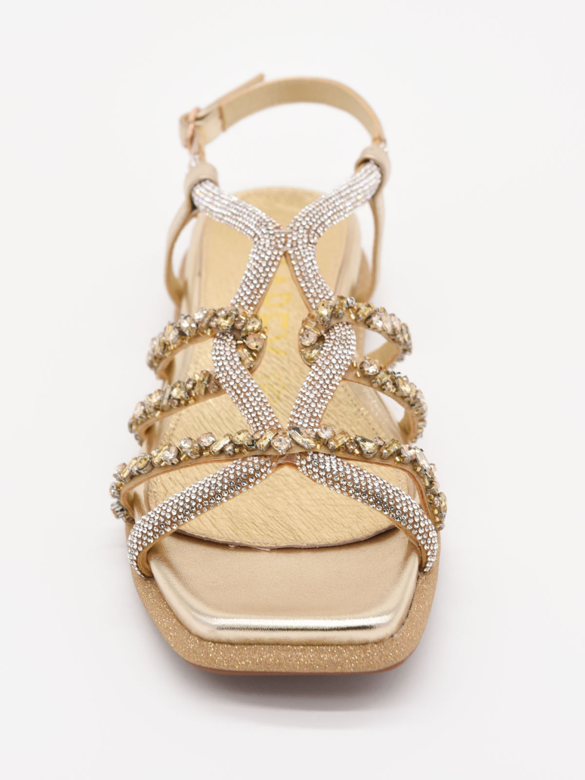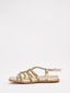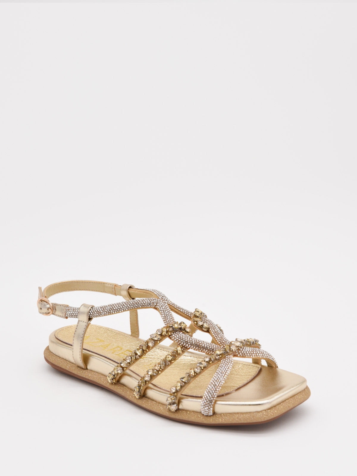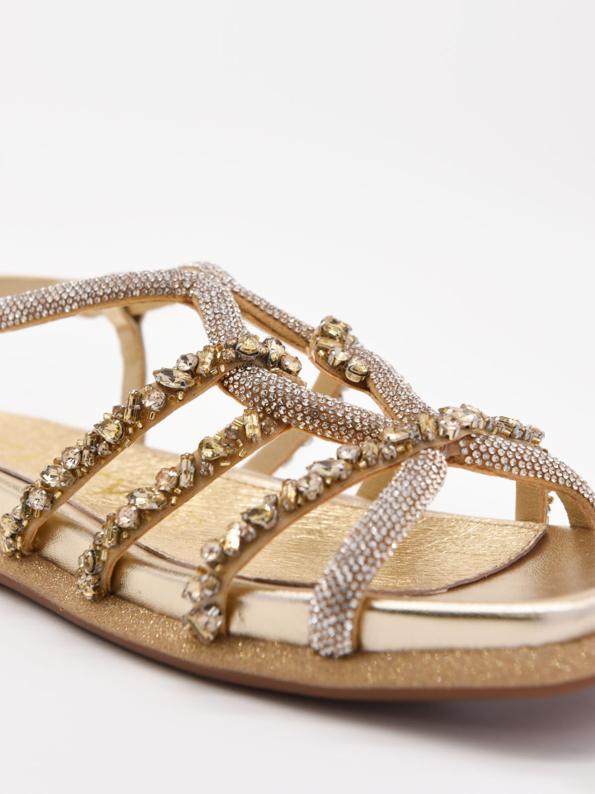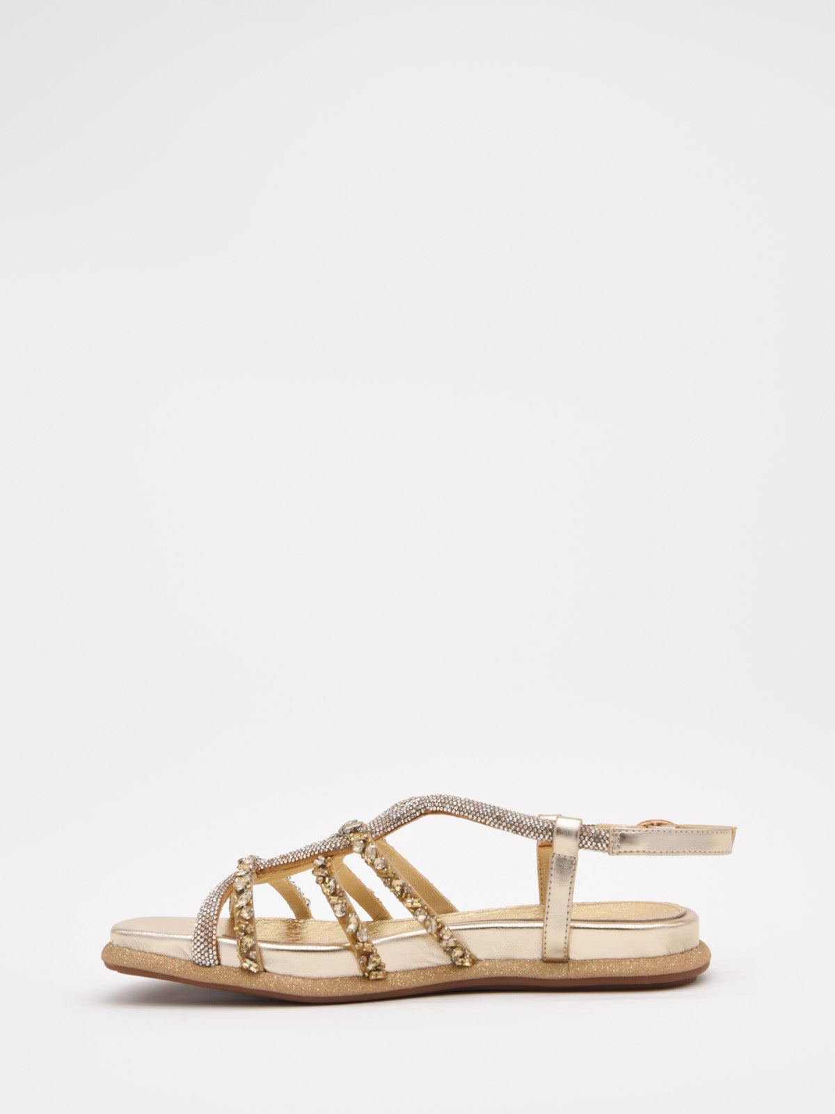 Estas sandalias planas doradas destacan por su diseño sofisticado y detalles brillantes. Las tiras decoradas con pedrería aportan un toque glamuroso, ideal para eventos o para realzar tus looks diarios. La suela acolchada garantiza comodidad en cada paso, mientras que el cierre ajustable en el talón asegura un ajuste perfecto. Perfectas para combinar con vestidos fluidos o atuendos casuales, estas sandalias son un must para esta temporada.