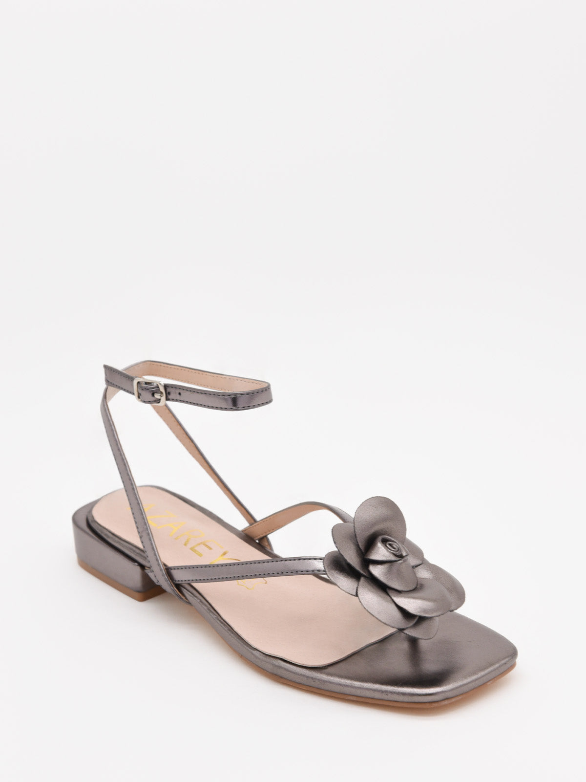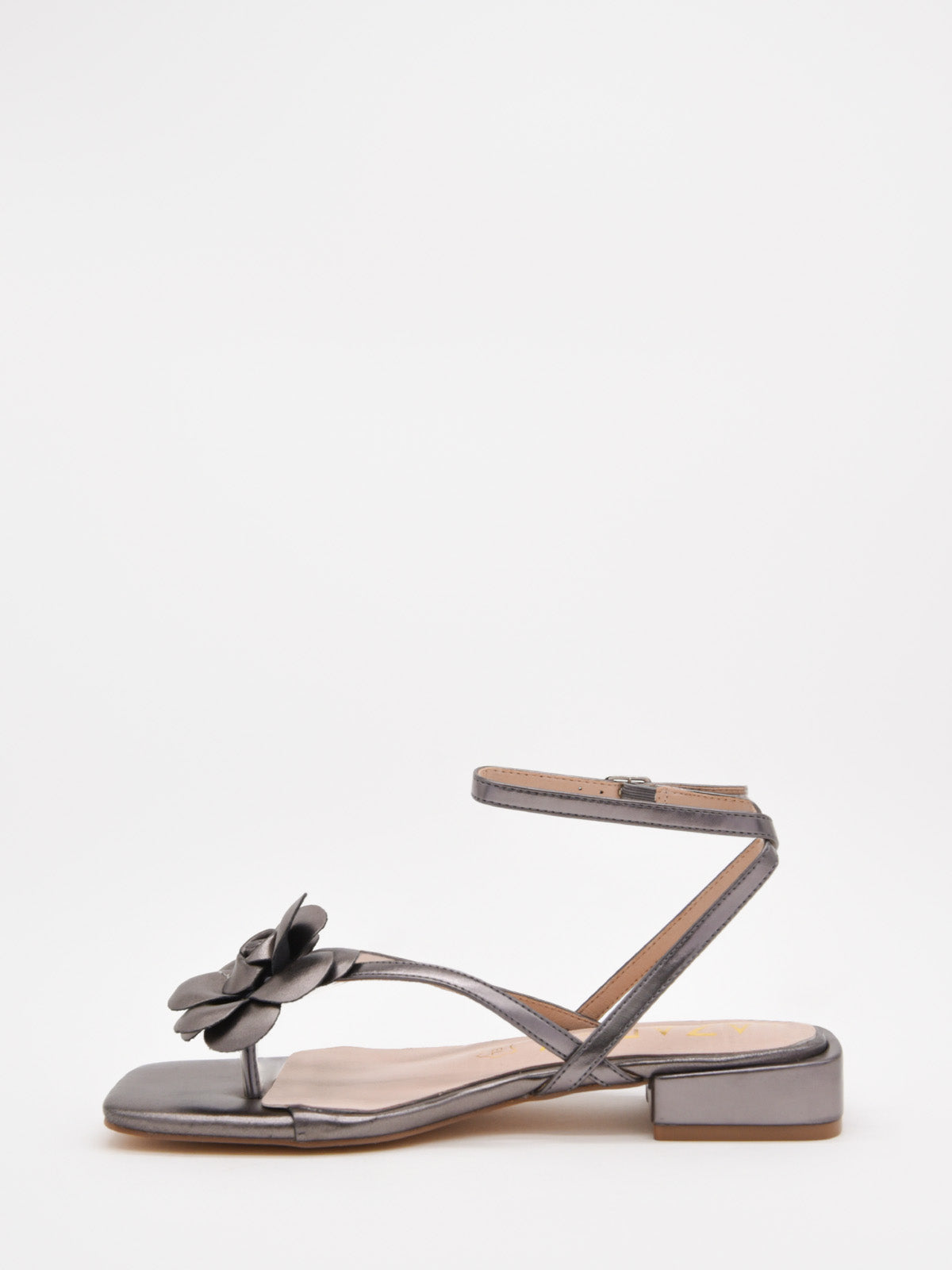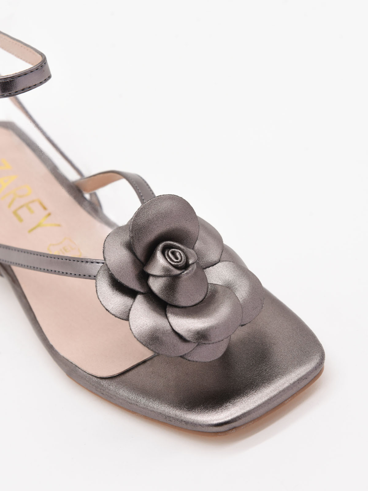 Estas sandalias plomo con detalle de flor son el complemento perfecto para cualquier ocasión, ya sea una cena elegante, un evento especial o una salida casual con estilo. Su diseño sofisticado destaca por la delicada flor en relieve, elaborada en un acabado metálico que aporta un toque de glamour.