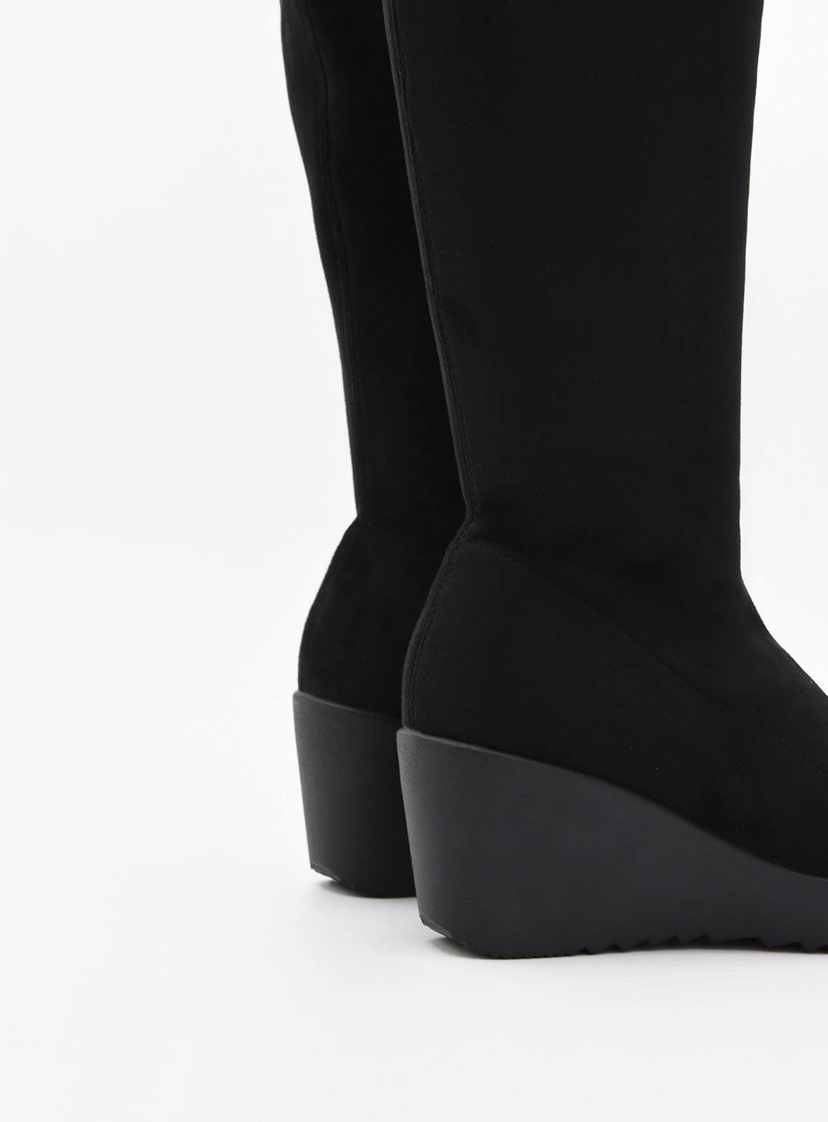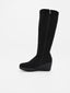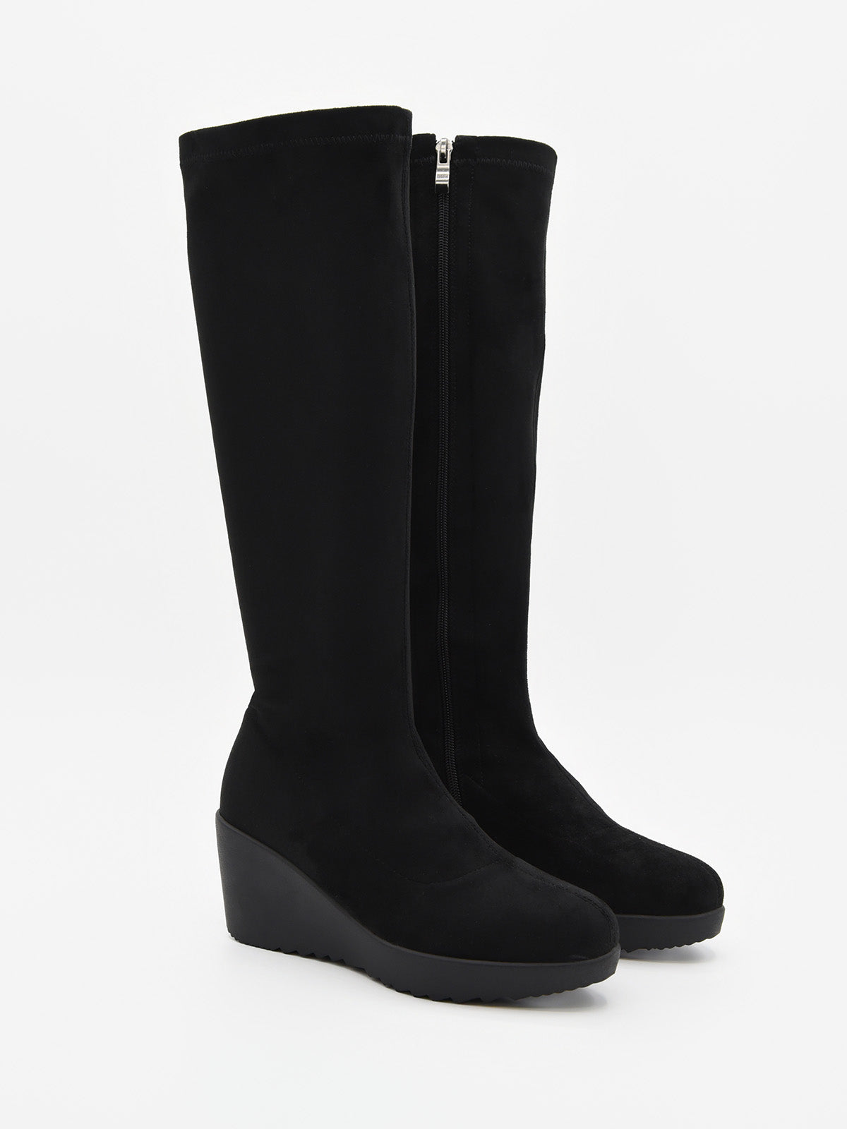Las botas altas negras de cuña en ante elástico son el equilibrio perfecto entre sofisticación y confort. Su diseño estiliza la pierna gracias a la caña alta y ajustada, confeccionada en un material elástico tipo ante que se adapta a la forma natural de la pierna, creando una silueta esbelta y elegante. La cuña negra integrada aporta altura con la máxima comodidad, mientras que la cremallera lateral facilita el calce sin perder estética minimalista.