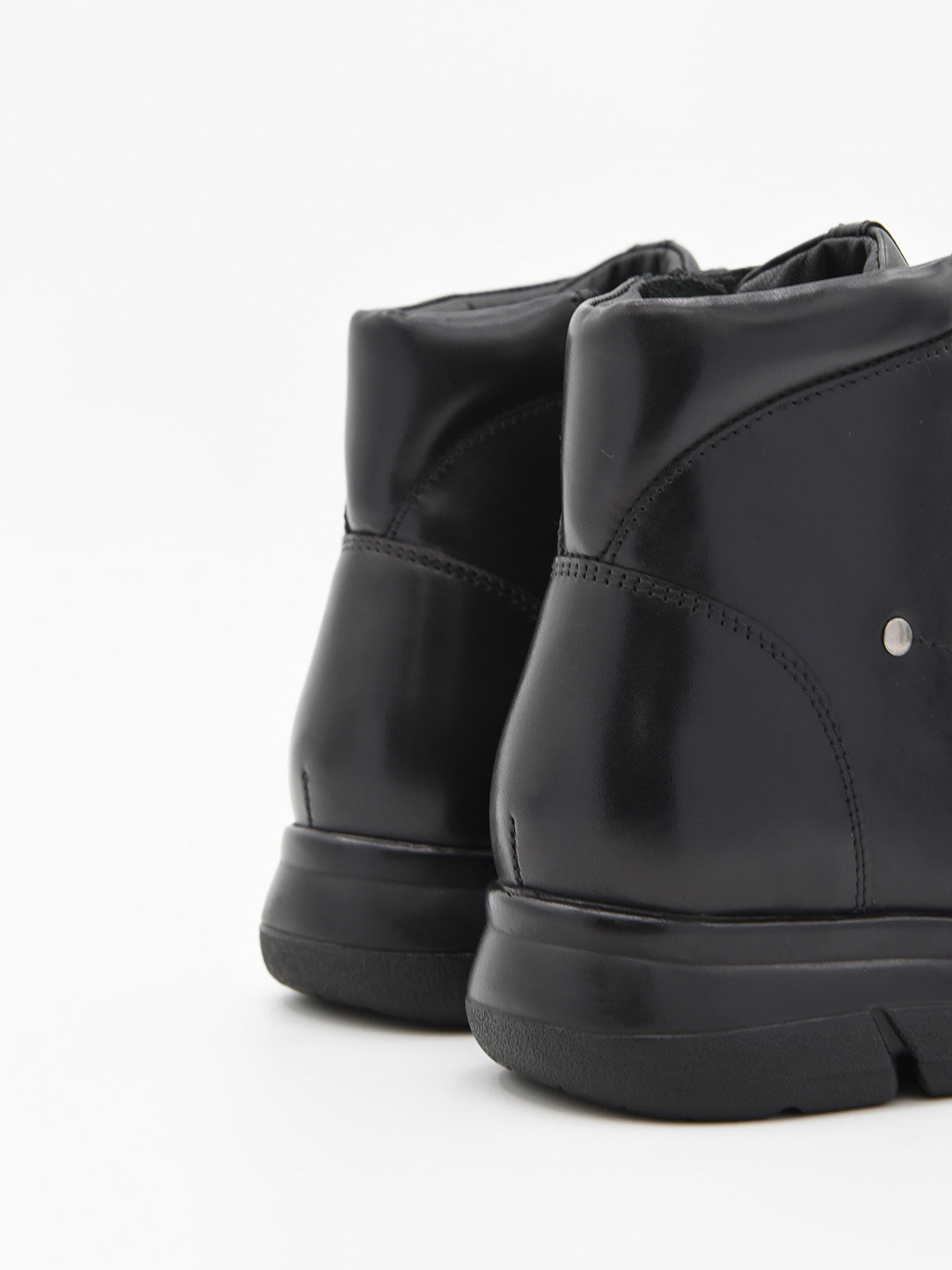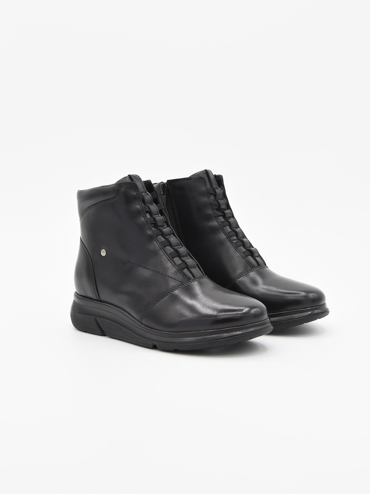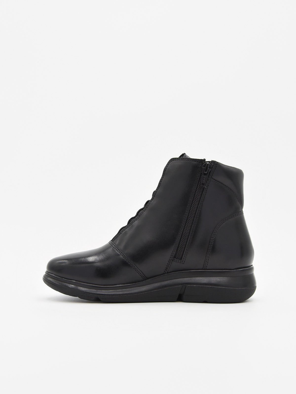 Botines de mujer color negro de alta calidad que combina elegancia, confort y resistencia. Su diseño minimalista con cierre de cremallera lateral y cordones elásticos aporta un toque moderno y práctico, ideal para un uso diario. La suela ligera y ergonómica proporciona comodidad durante todo el día, mientras que su acabado en piel garantiza durabilidad y fácil mantenimiento. Son los botines de mujer perfectos para combinar con cualquier look casual o elegante, convirtiéndose en un básico imprescindible para tu armario esta temporada.