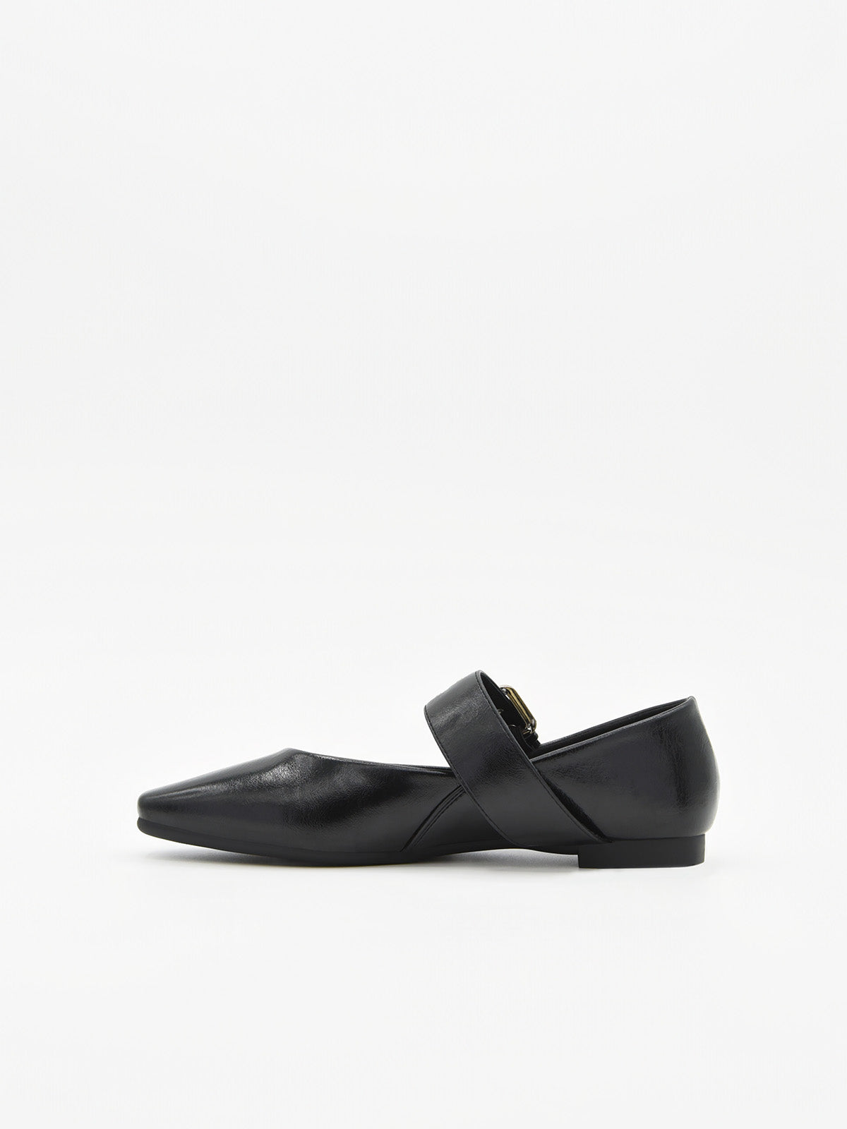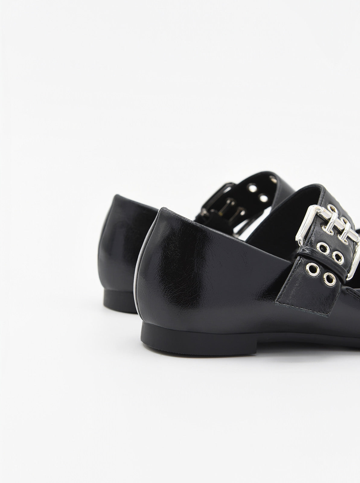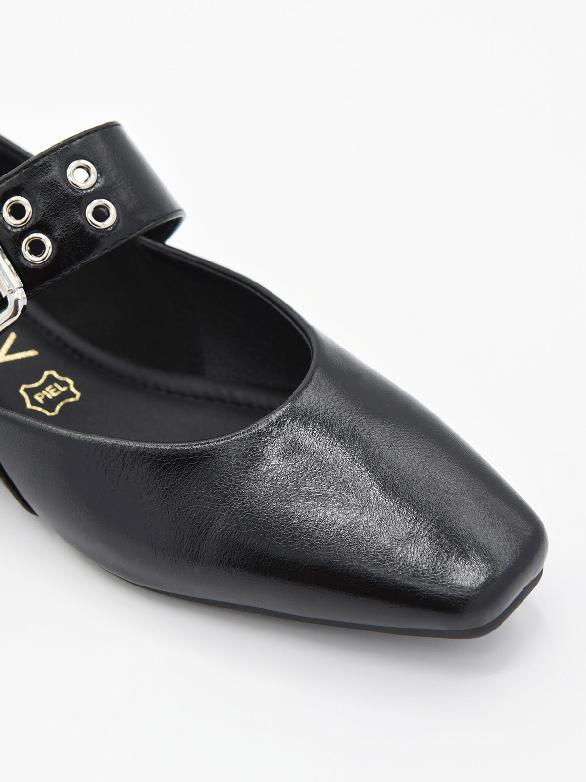 Minimalismo con grinta. Questa ballerina nera con punta quadrata è la prova che il semplice può avere un grande impatto. Realizzata in materiale sintetico con finitura lucida, il suo design pulito è esaltato da una cintura larga con doppia fibbia argentata e occhielli metallici, che le conferisce quel tocco urbano e audace che trasforma qualsiasi look in una dichiarazione di stile.