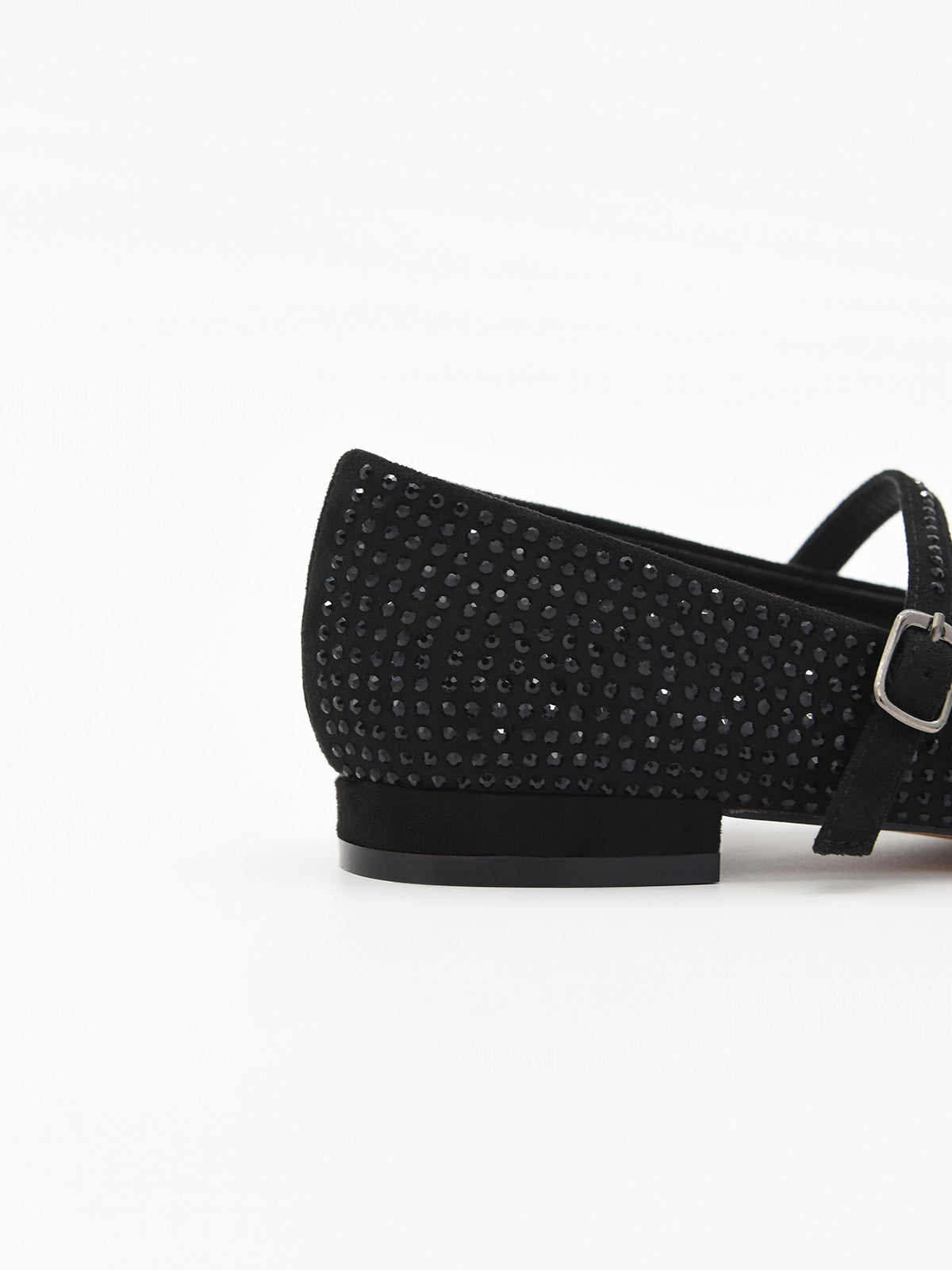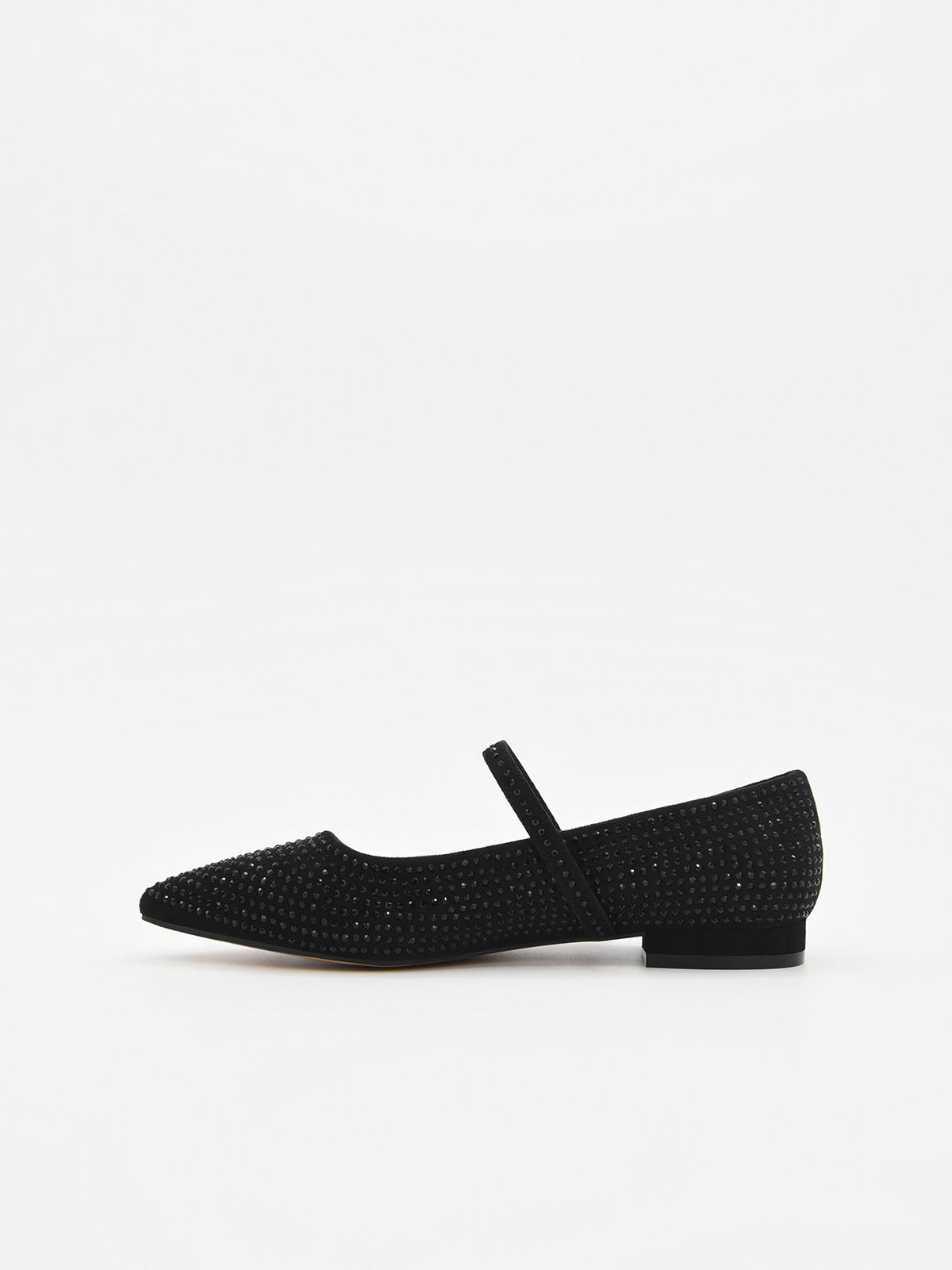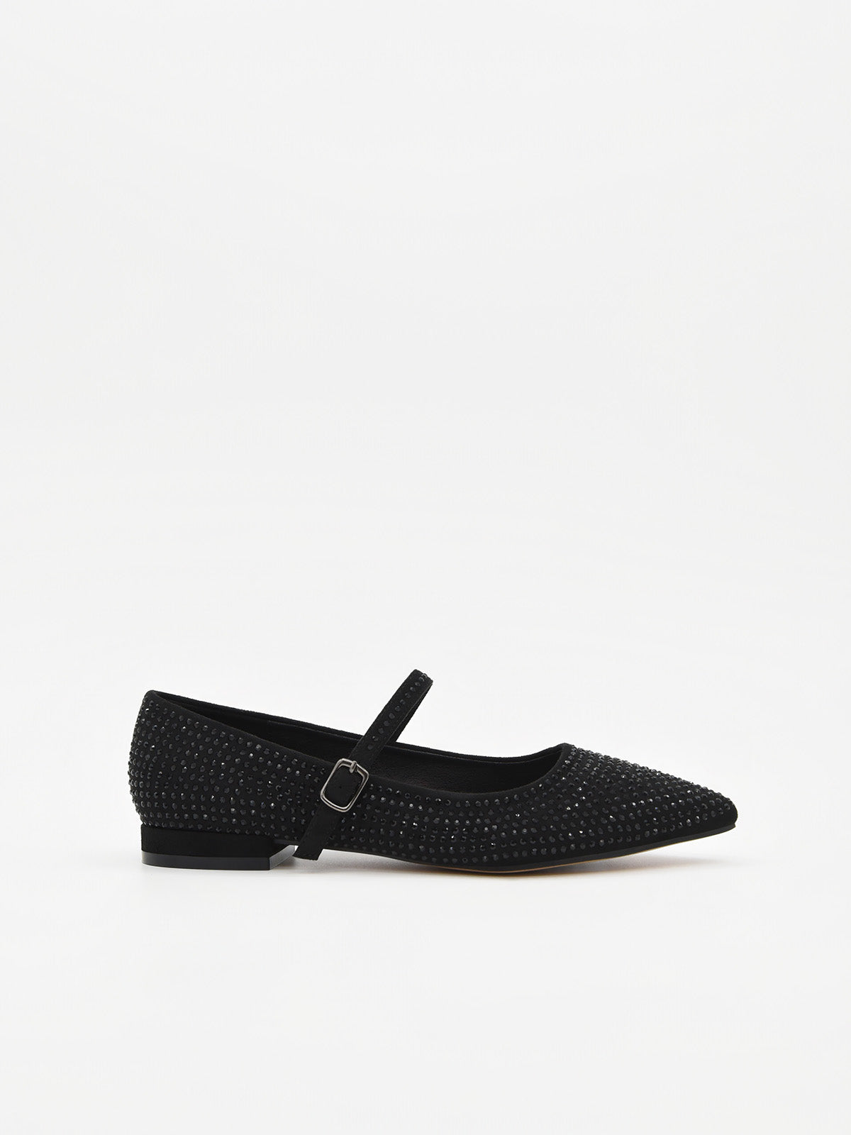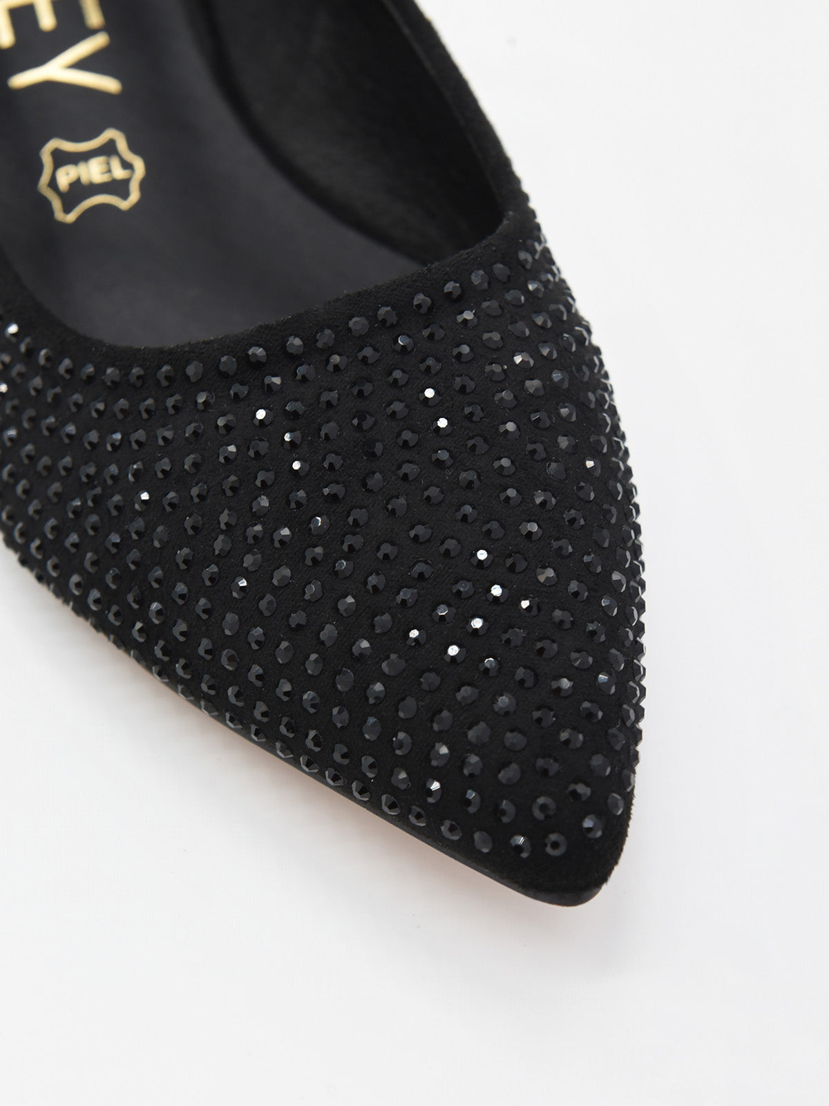 Un basic con anima festiva: questa ballerina nera con punta fine è tutto ciò di cui hai bisogno per aggiungere eleganza e comfort ai tuoi look quotidiani o serali. Realizzata in materiale tessile, si distingue per la finitura con applicazioni di strass che catturano la luce ad ogni passo.