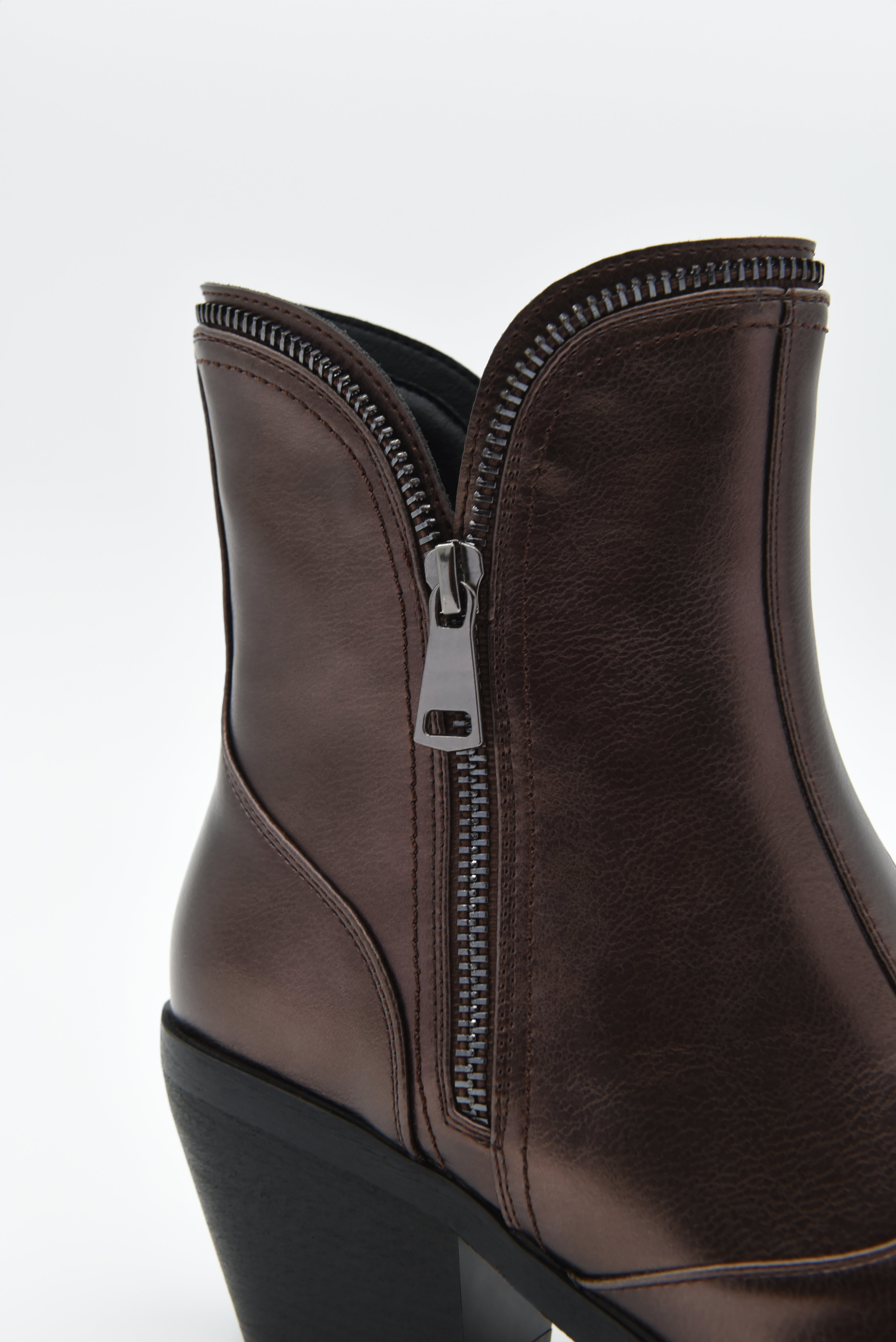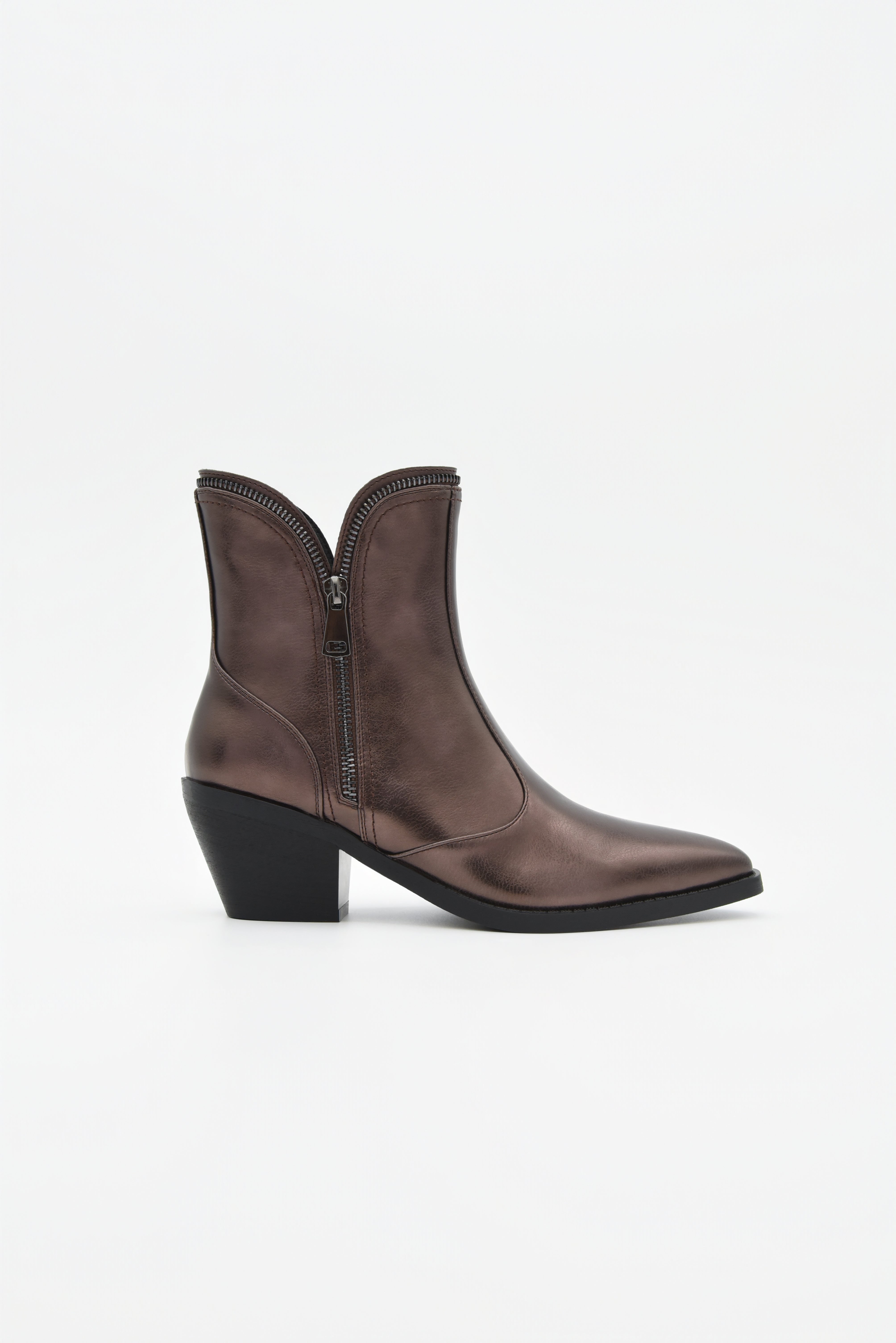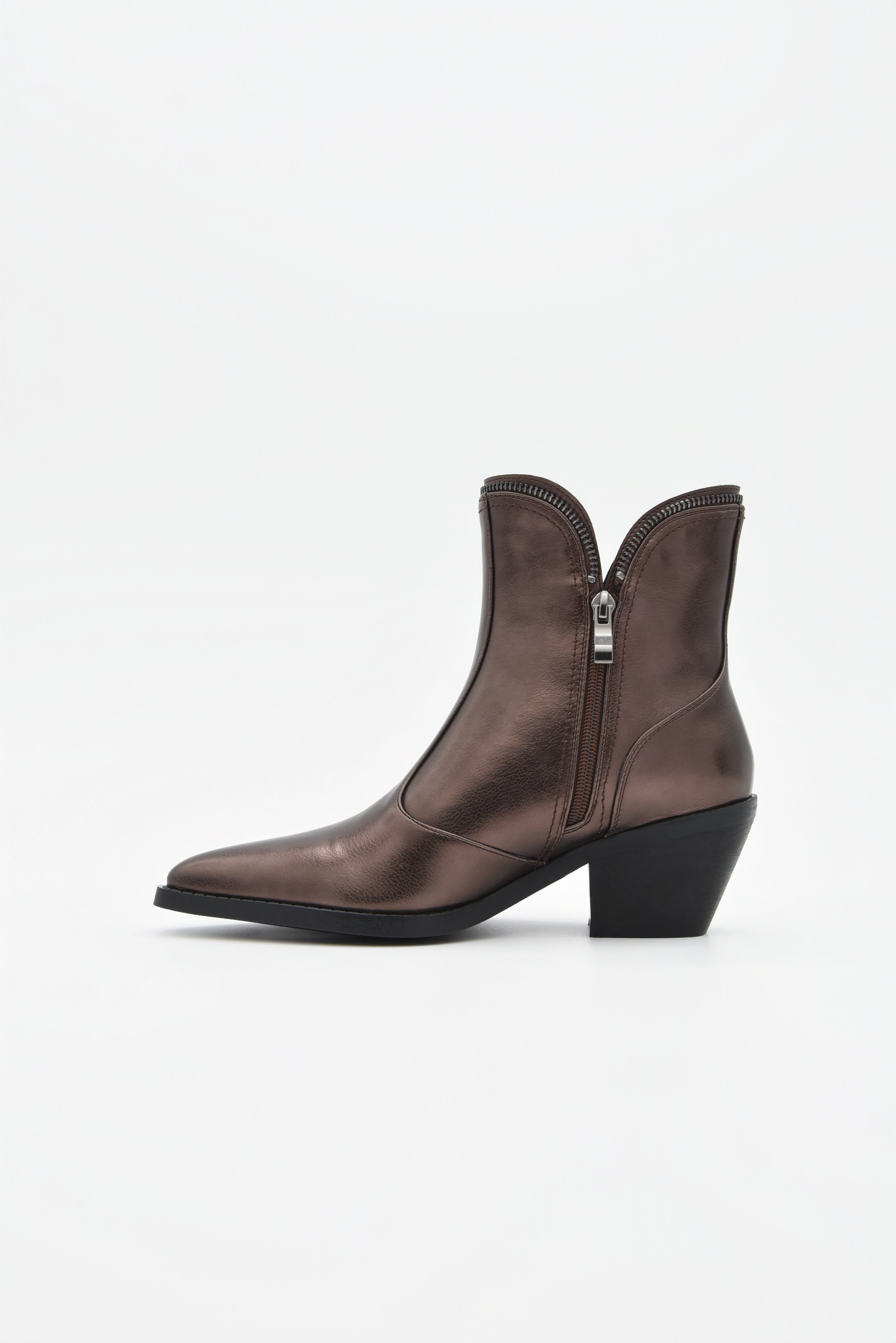 Il tocco perfetto per elevare qualsiasi look: la finitura bronzo metalizzato di questi stivaletti cowboy conferisce una luminosità sofisticata che non passa inosservata. Il loro design combina forza e femminilità, con linee pulite e una punta affilata che snellisce la silhouette con personalità.