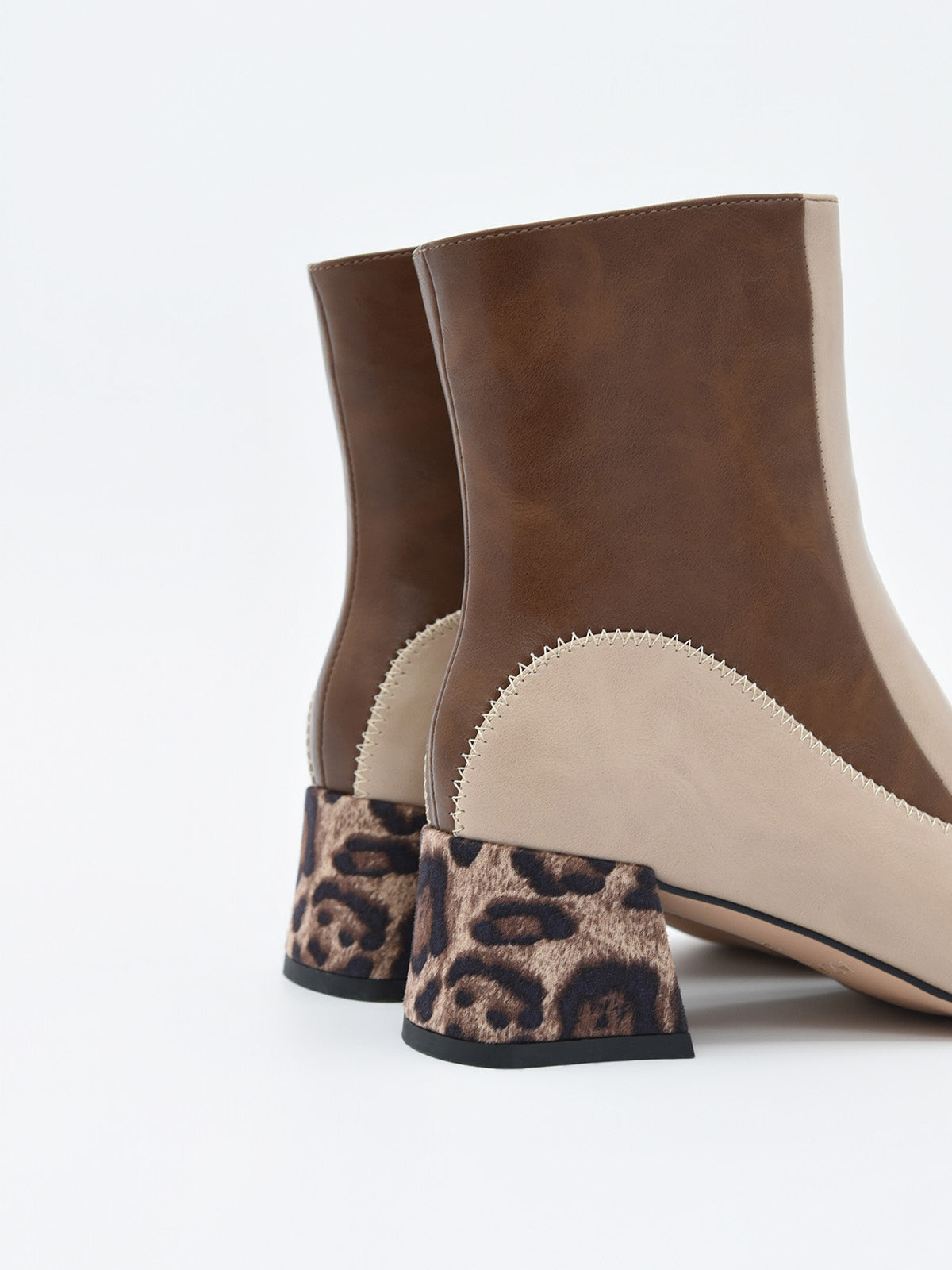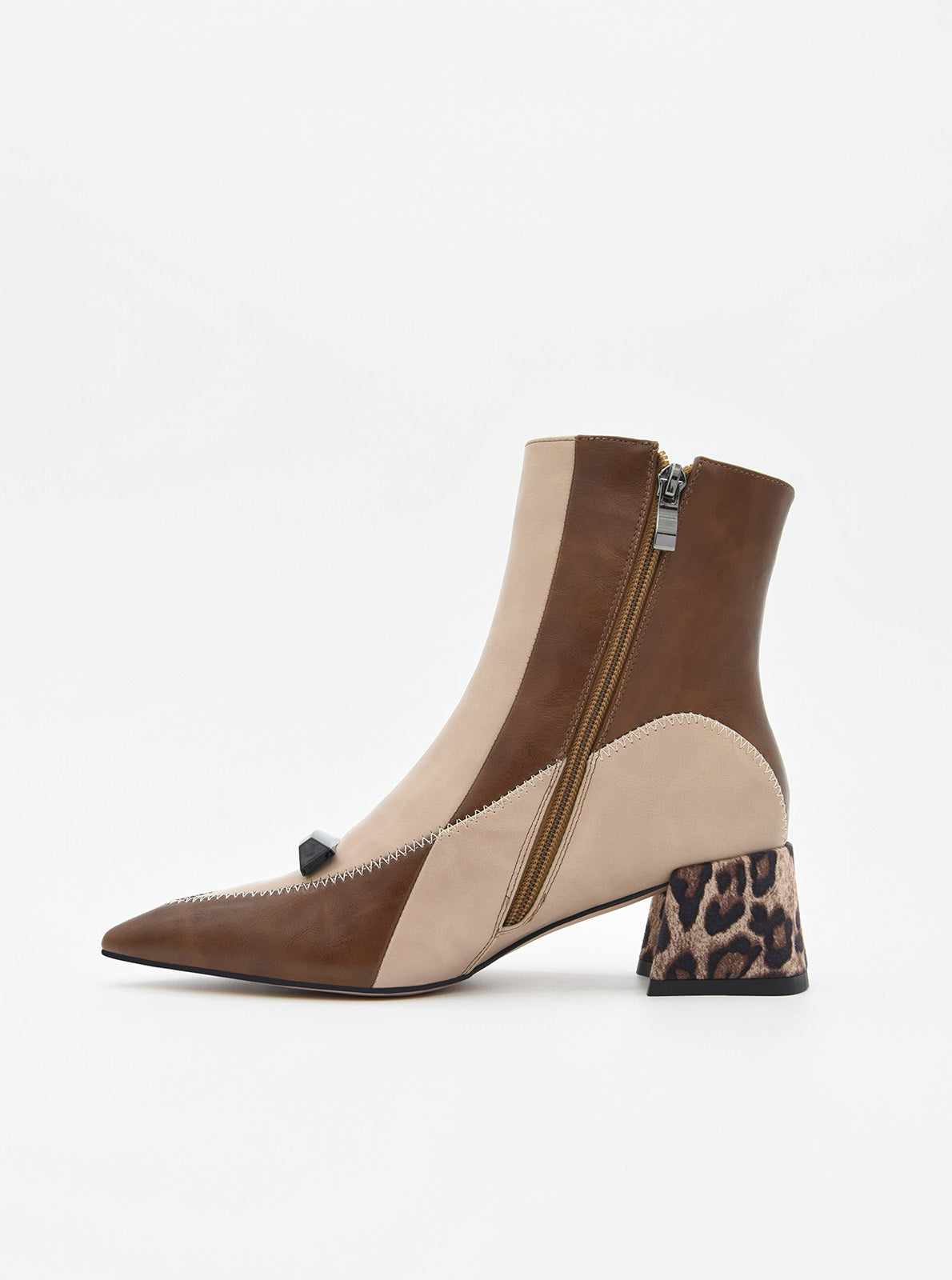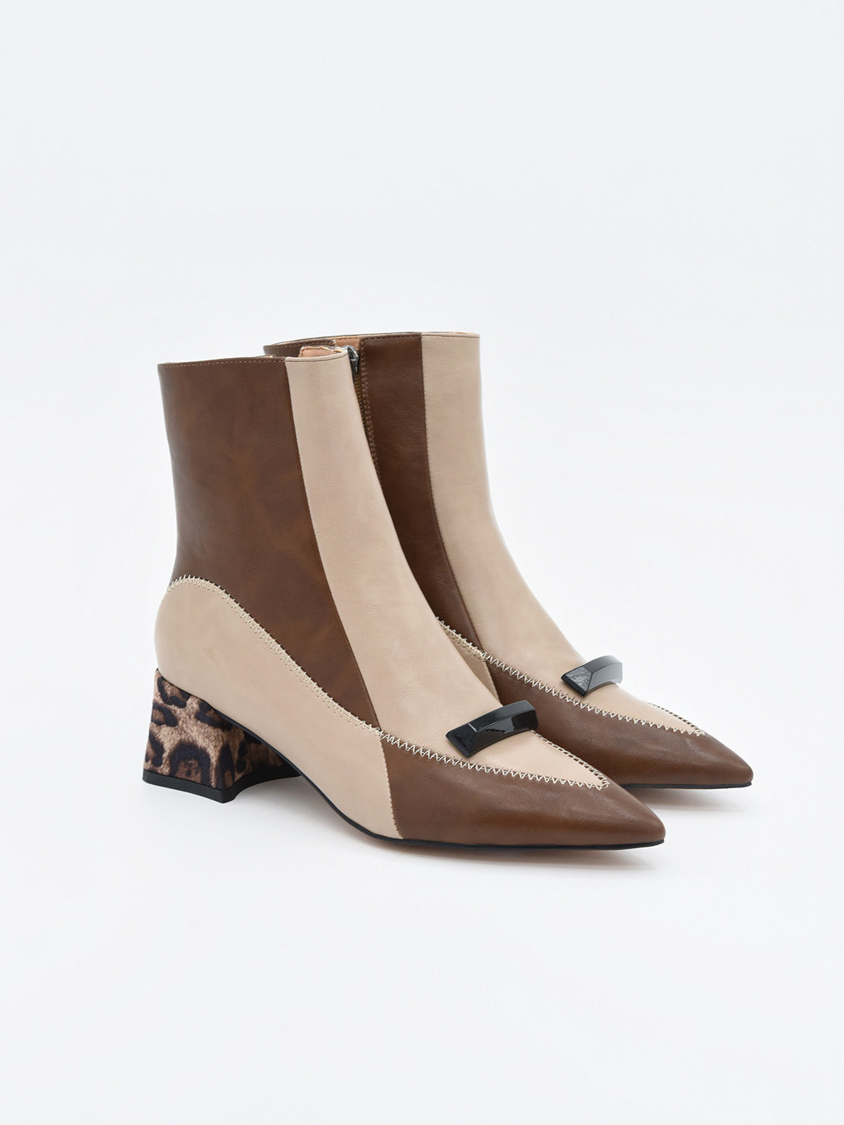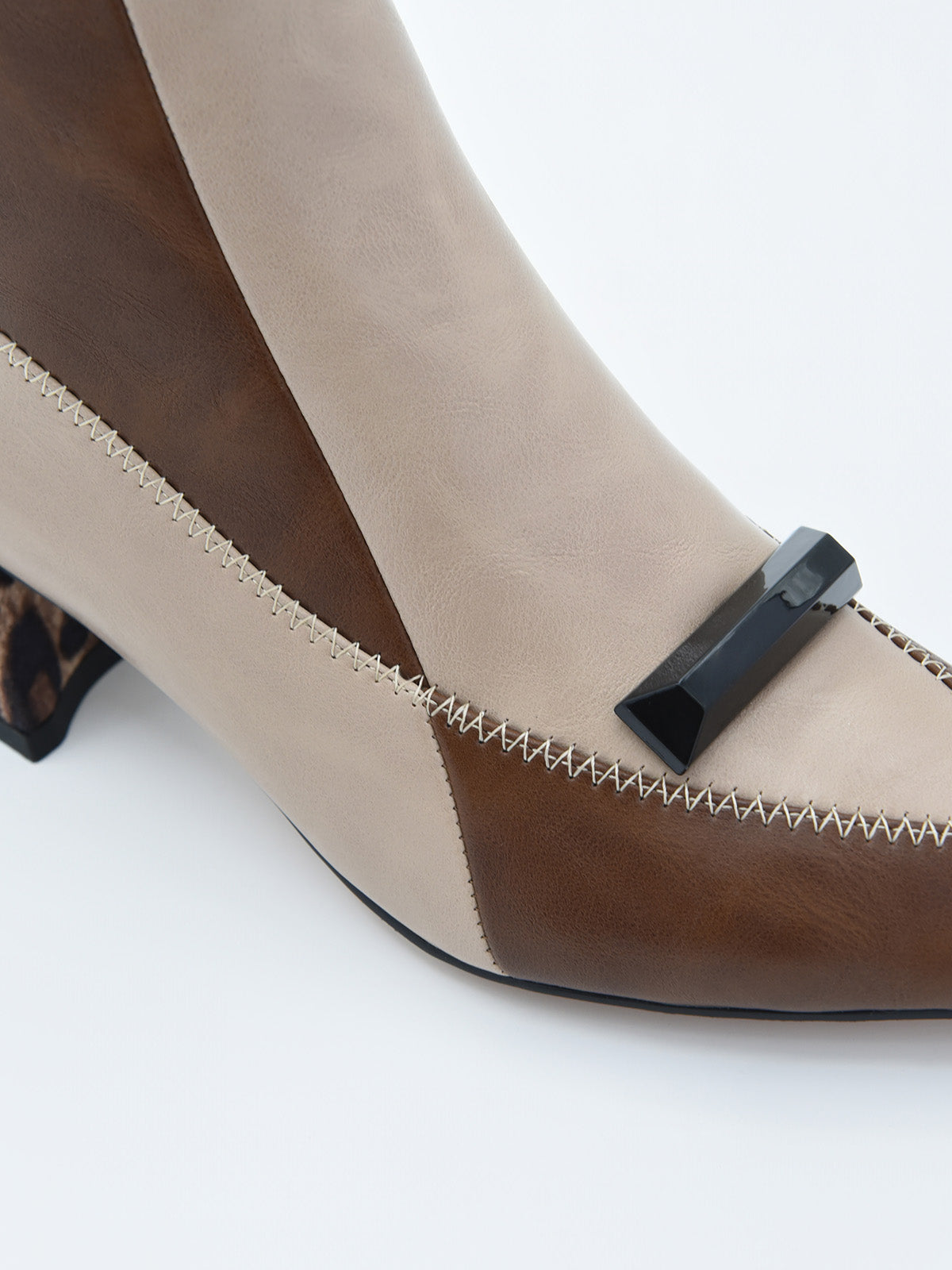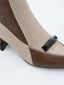 Questo stivaletto bicolore in tonalità beige e marrone è pura espressione di stile e carattere. Con un design geometrico che alterna pannelli in materiale sintetico effetto pelle, incorpora un elegante dettaglio sulla tomaia: un pezzo decorativo nero che aggiunge un tocco sofisticato e moderno.