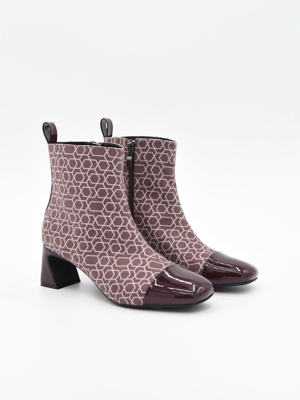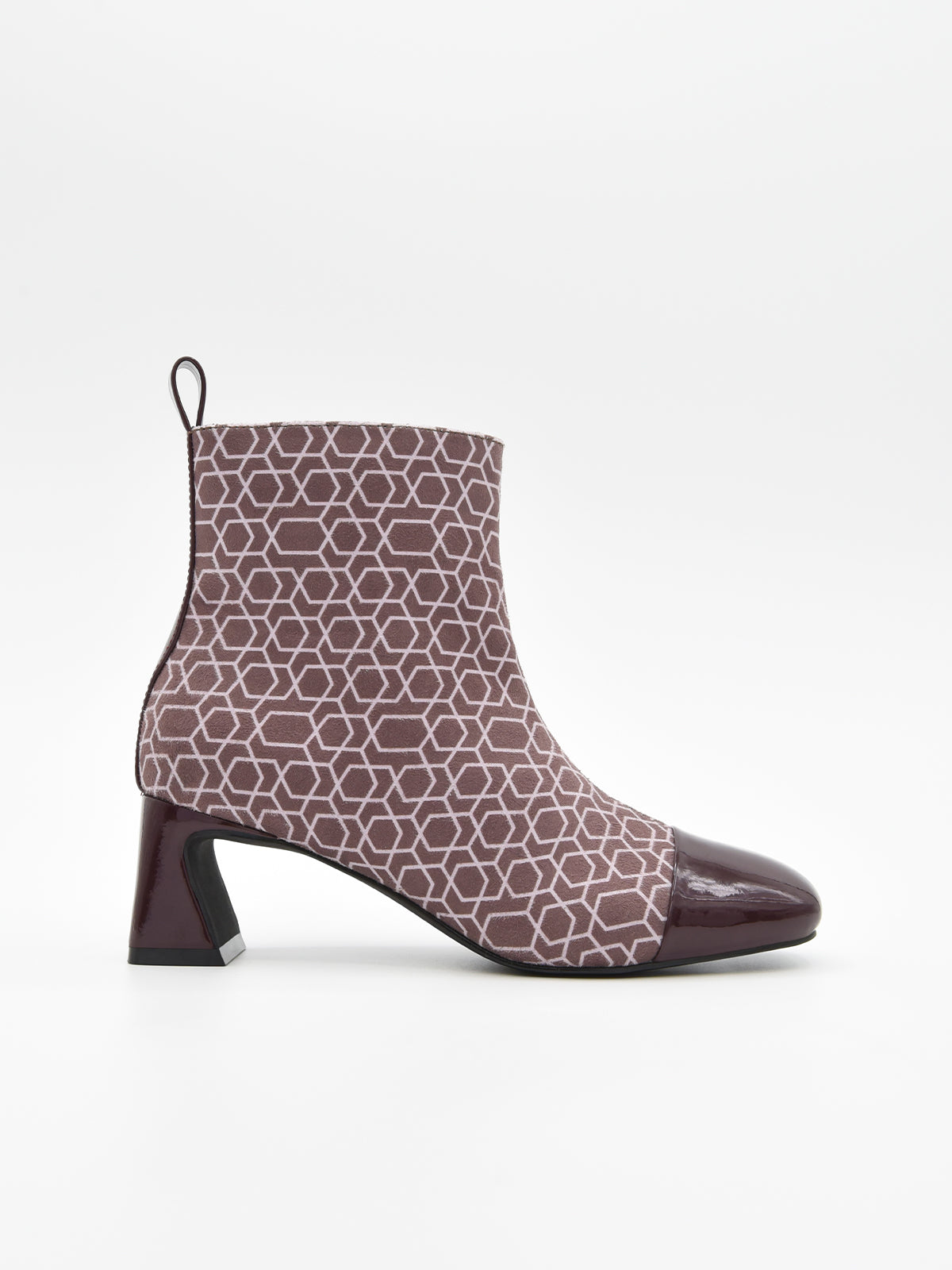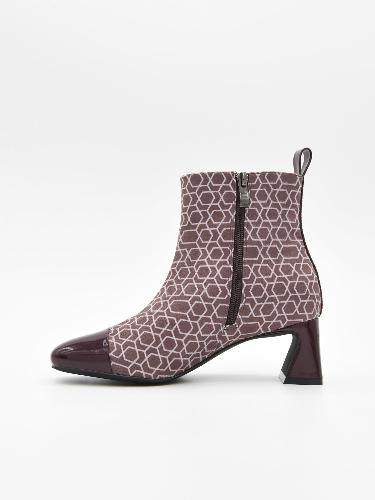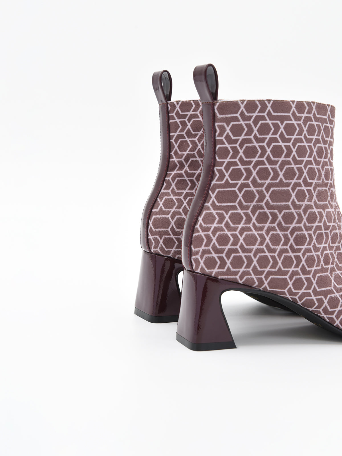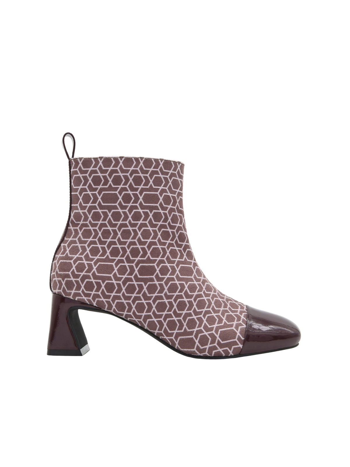 Design e stile si incontrano in questo stivaletto bordeaux con stampa geometrica esagonale, una proposta audace e femminile per fare la differenza questa stagione. Il contrasto tra il tessuto in tonalità terra con disegno bianco e la punta in vernice bordeaux lucida crea una silhouette originale, elegante e piena di personalità.