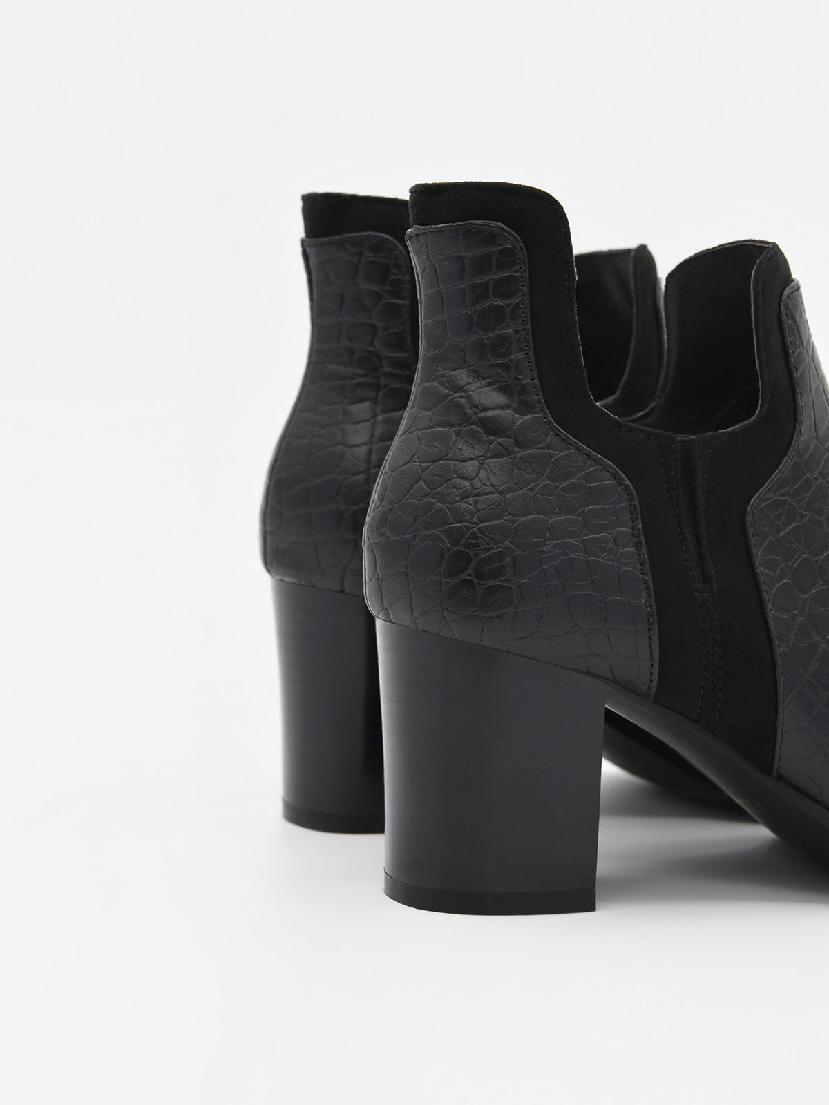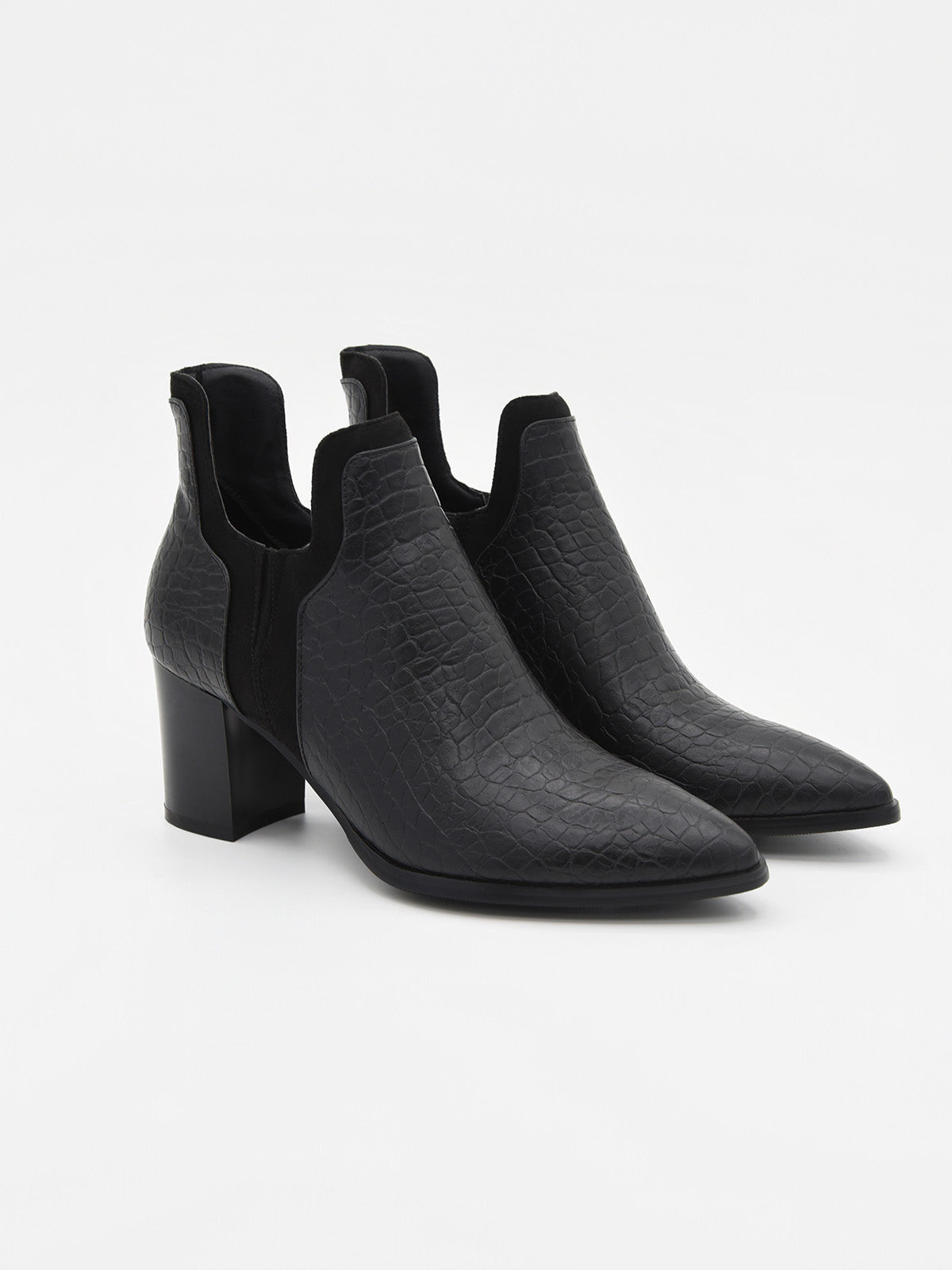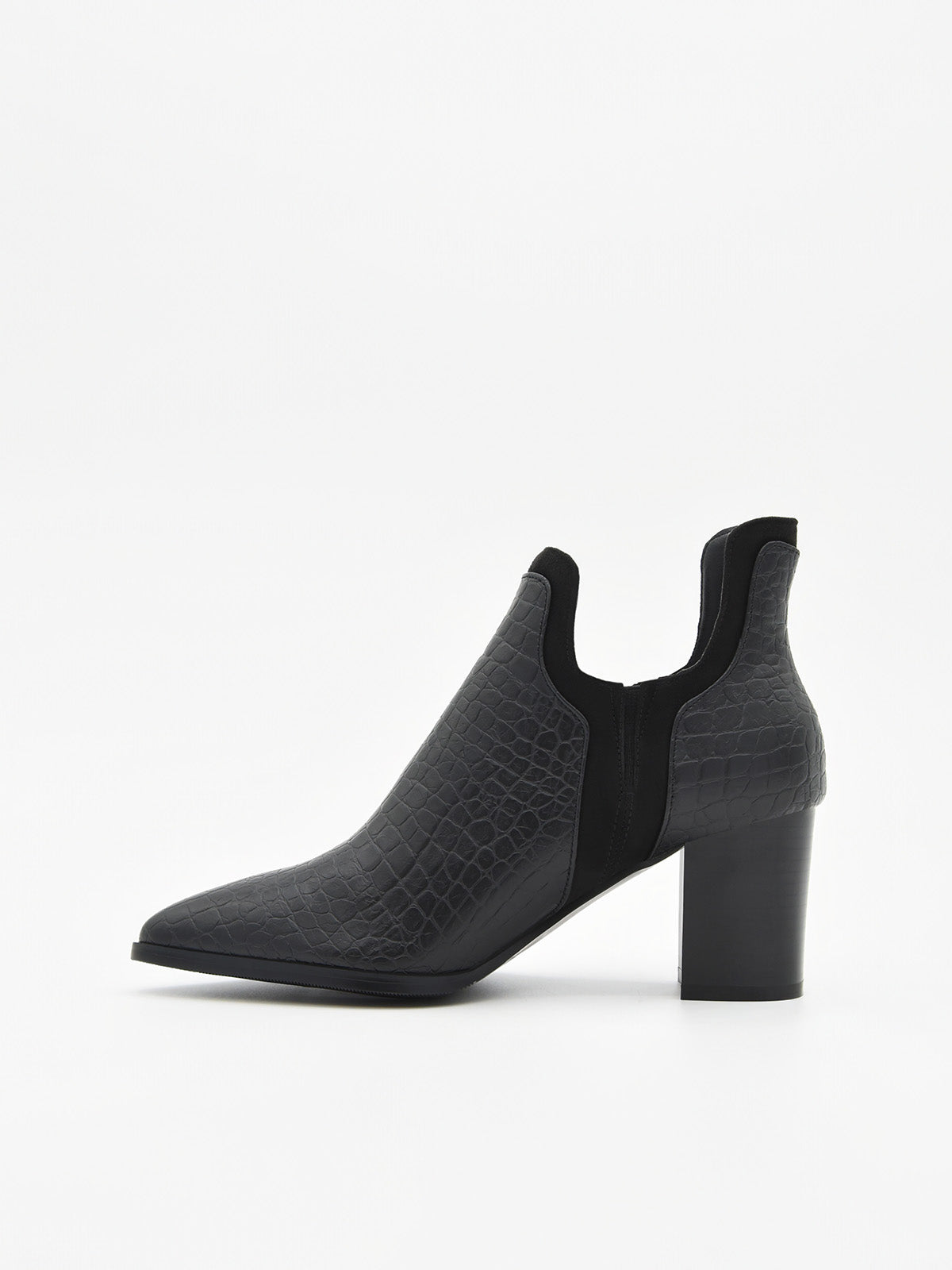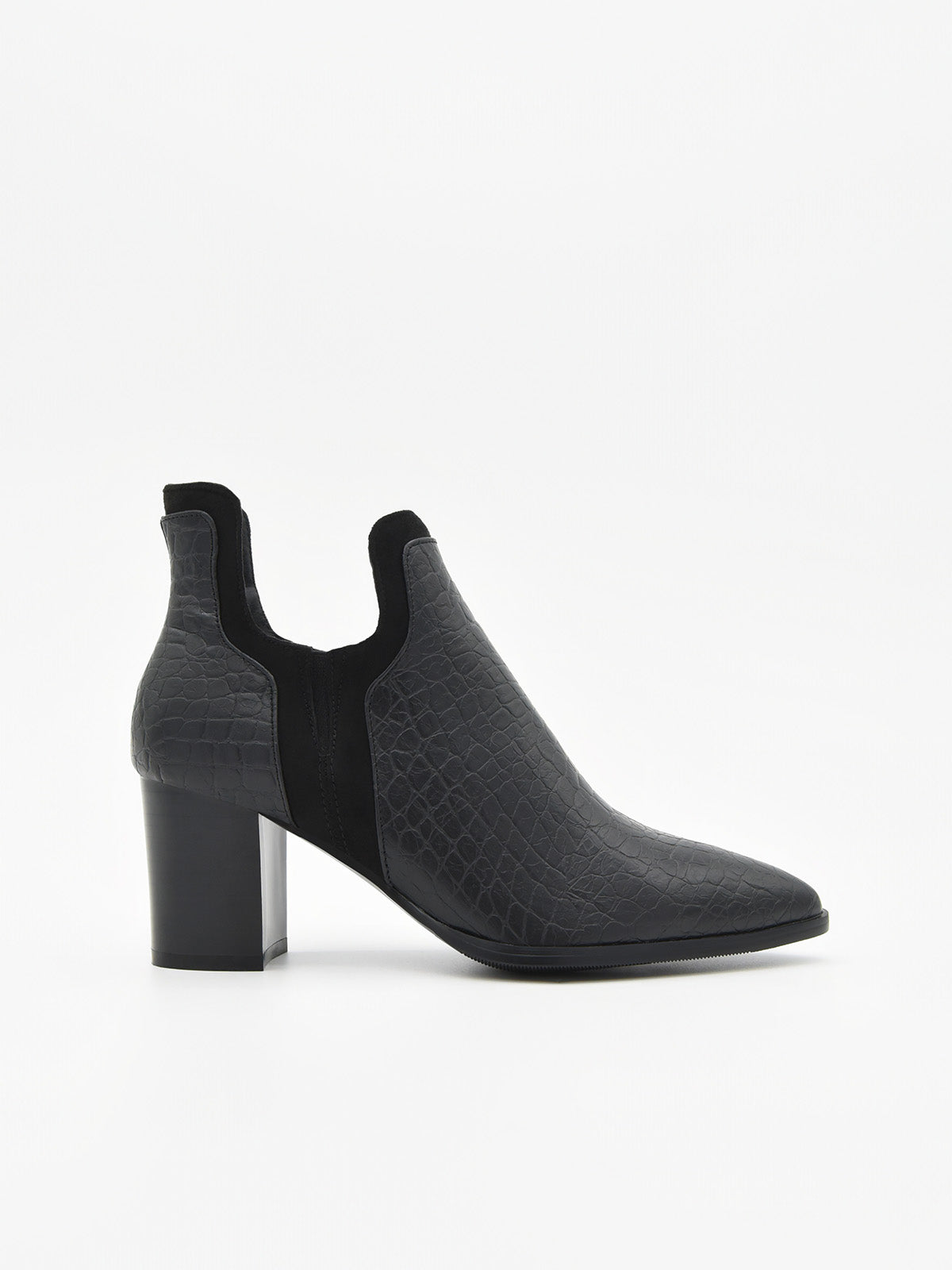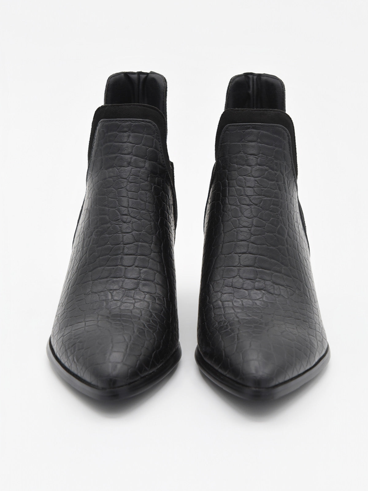Con un'aria urbana e sofisticata, questo stivaletto nero combina texture effetto pelle stampata con dettagli in effetto camoscio nero sul bordo e sui lati, creando un contrasto sottile ed elegante. Il suo design tipo chelsea con laterali elastici assicura una calzata rapida e comoda, adattandosi perfettamente al piede.