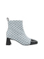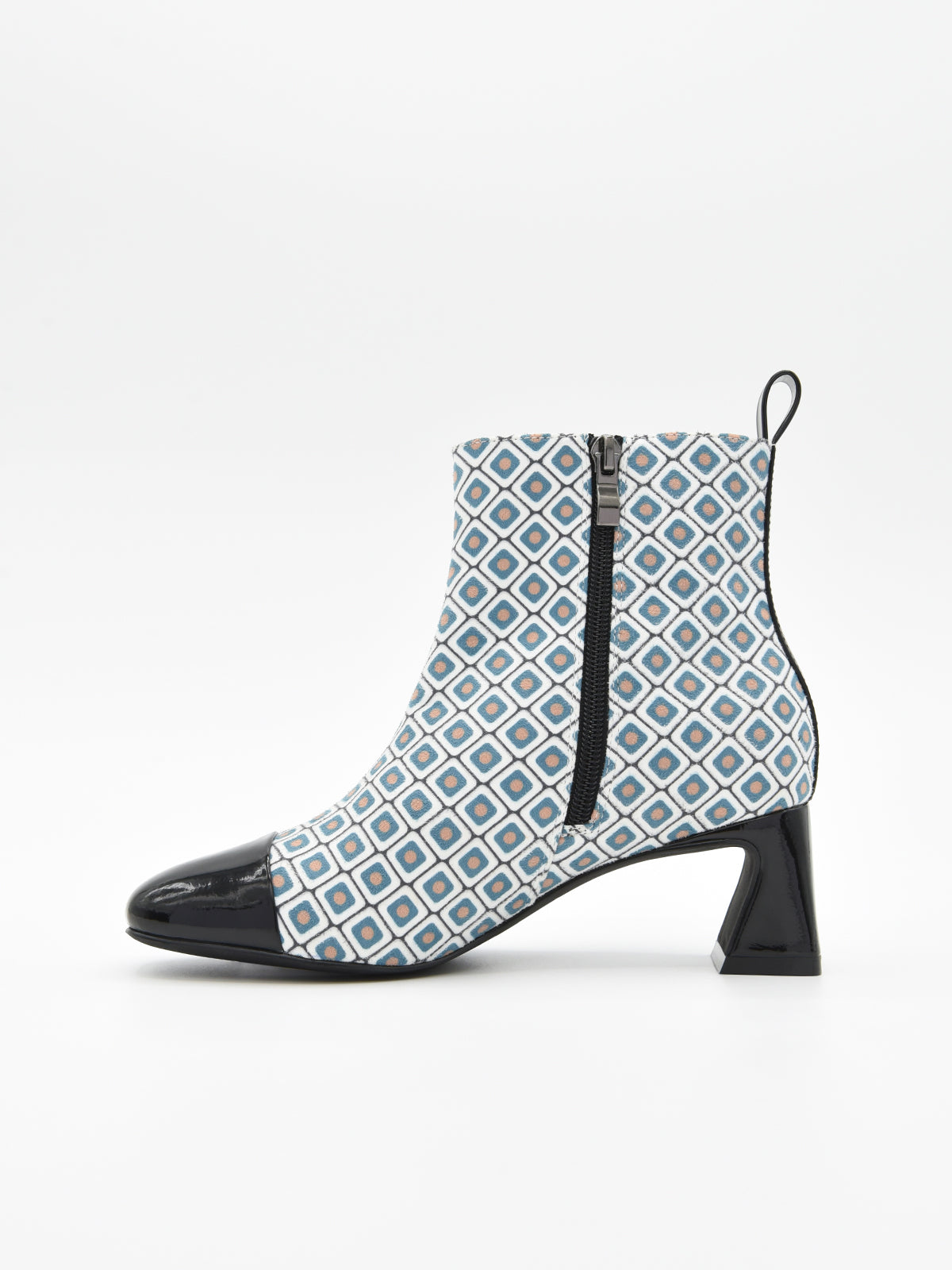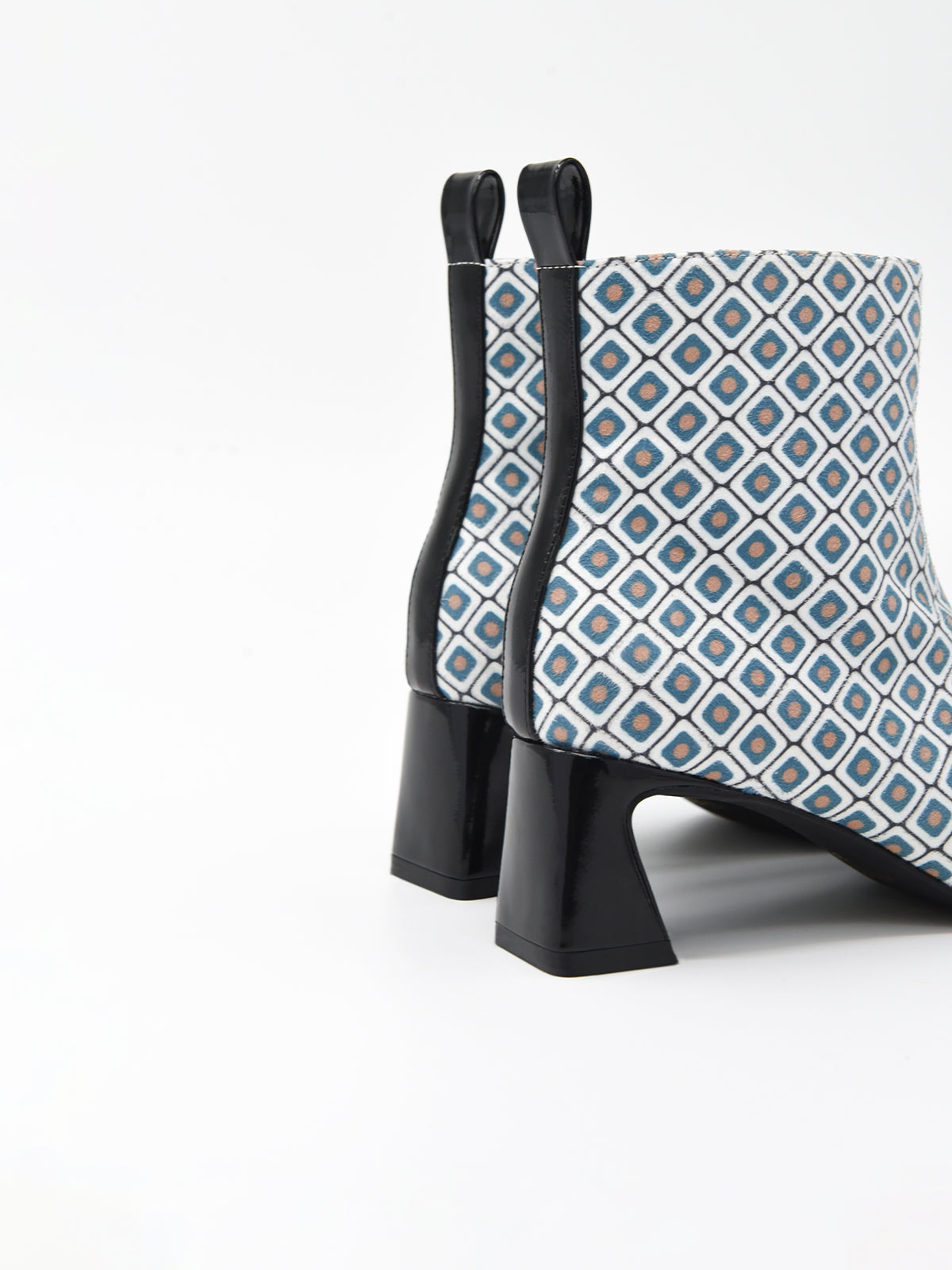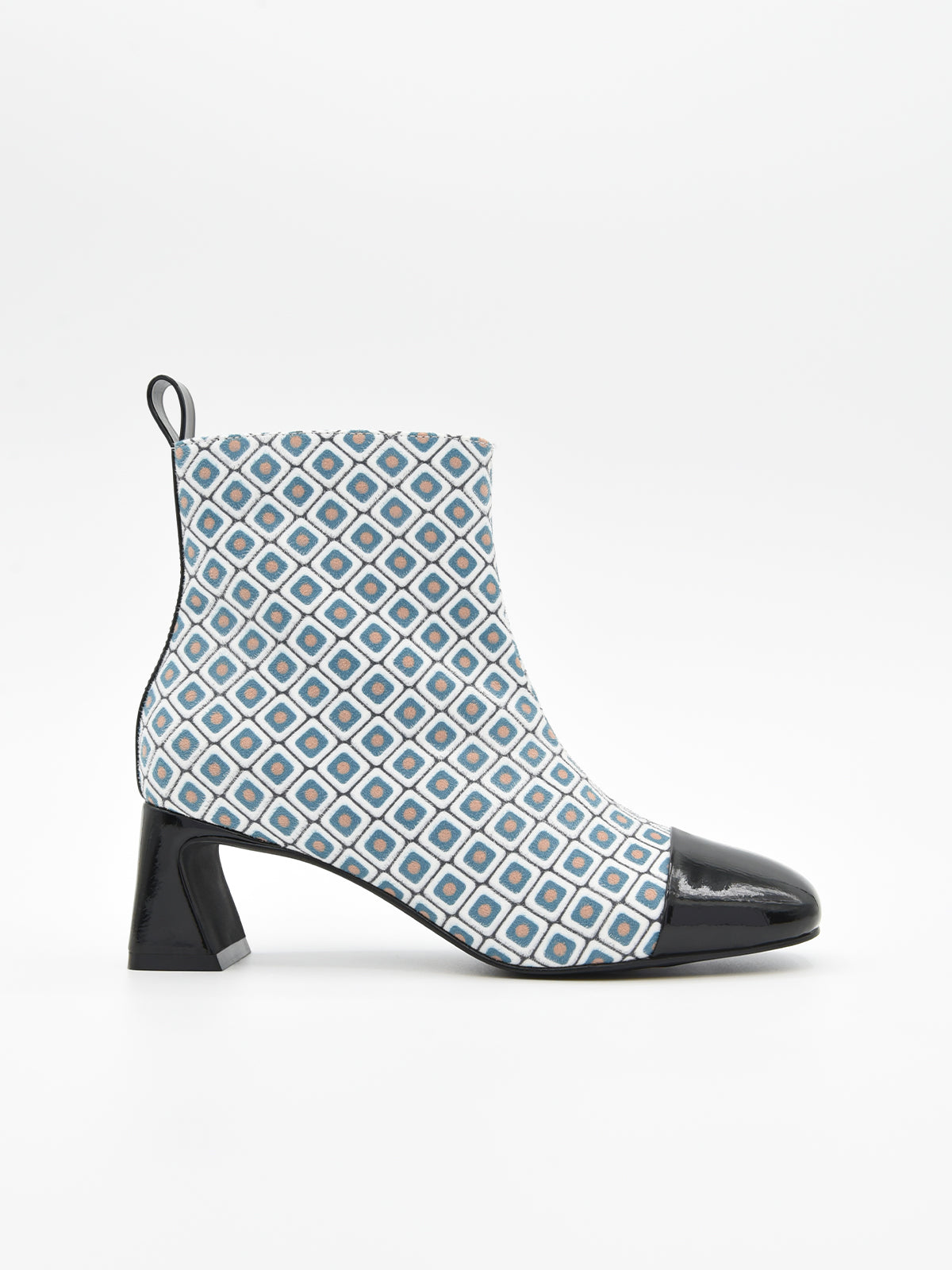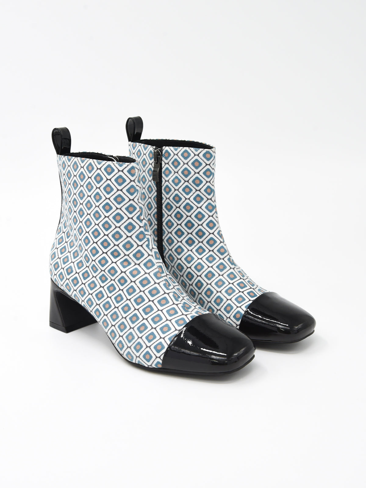 Osate a fare la differenza con questo stivaletto di design geometrico multicolore, una proposta vibrante e ultrafemminile che non passa inosservata. L'esterno combina un tessuto stampato con rombi in tonalità blu, bianco e corallo con una sofisticata punta in vernice nera che apporta contrasto ed eleganza.
