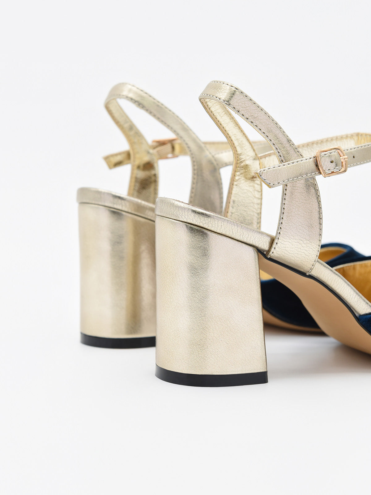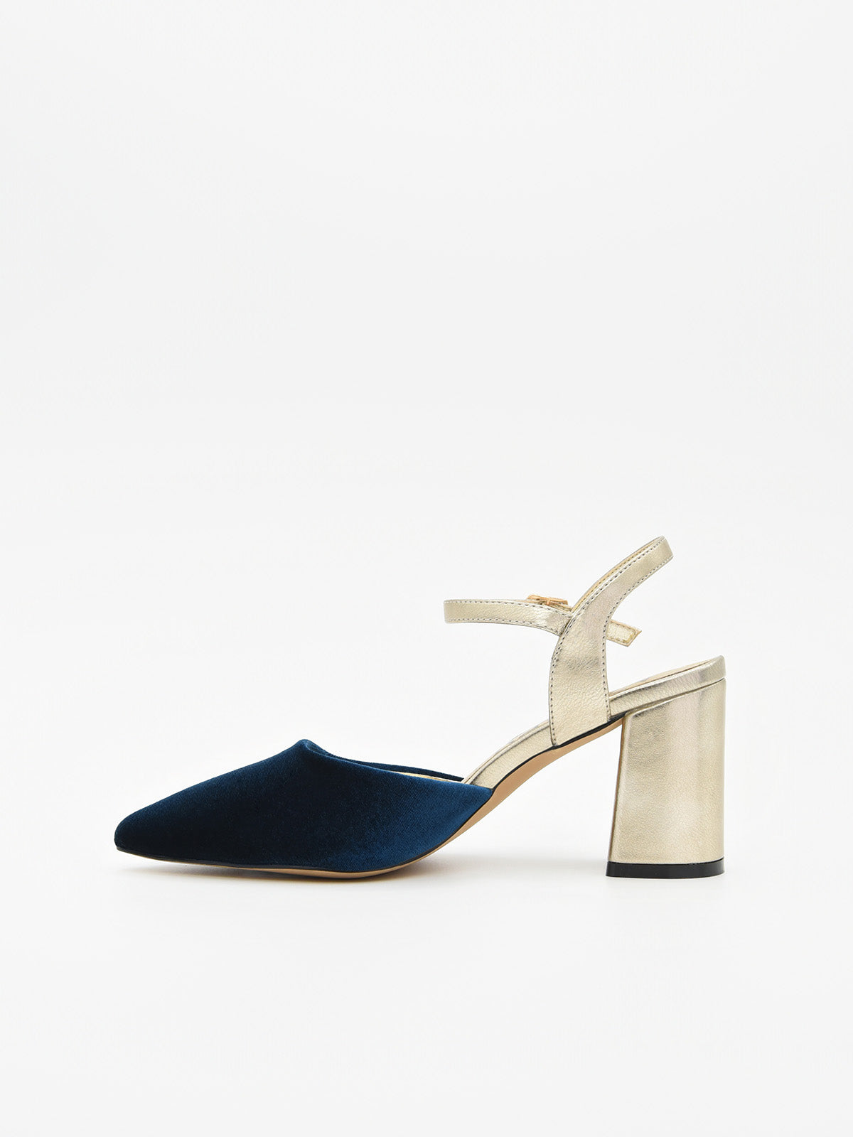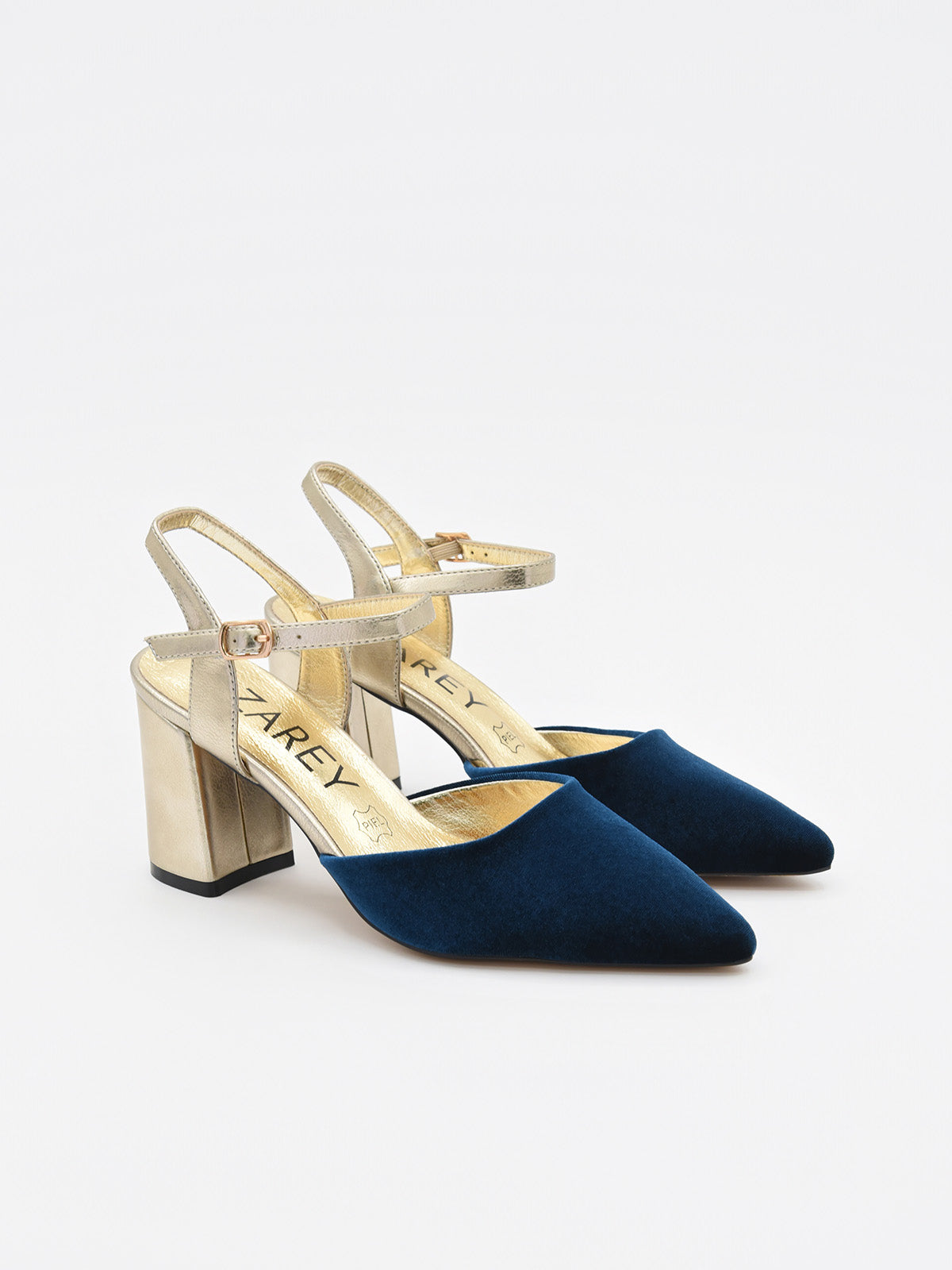 Le sandali in velluto blu dorato si distinguono per la loro superiore comodità, grazie alla suola in pelle imbottita che accoglie il piede con delicatezza. Il velluto blu scuro conferisce un'eleganza sofisticata, mentre il tacco largo finito in oro aggiunge un tocco lussuoso e moderno. La chiusura alla caviglia offre un supporto sicuro, pensato per farti godere con stile tutto il giorno o la notte.