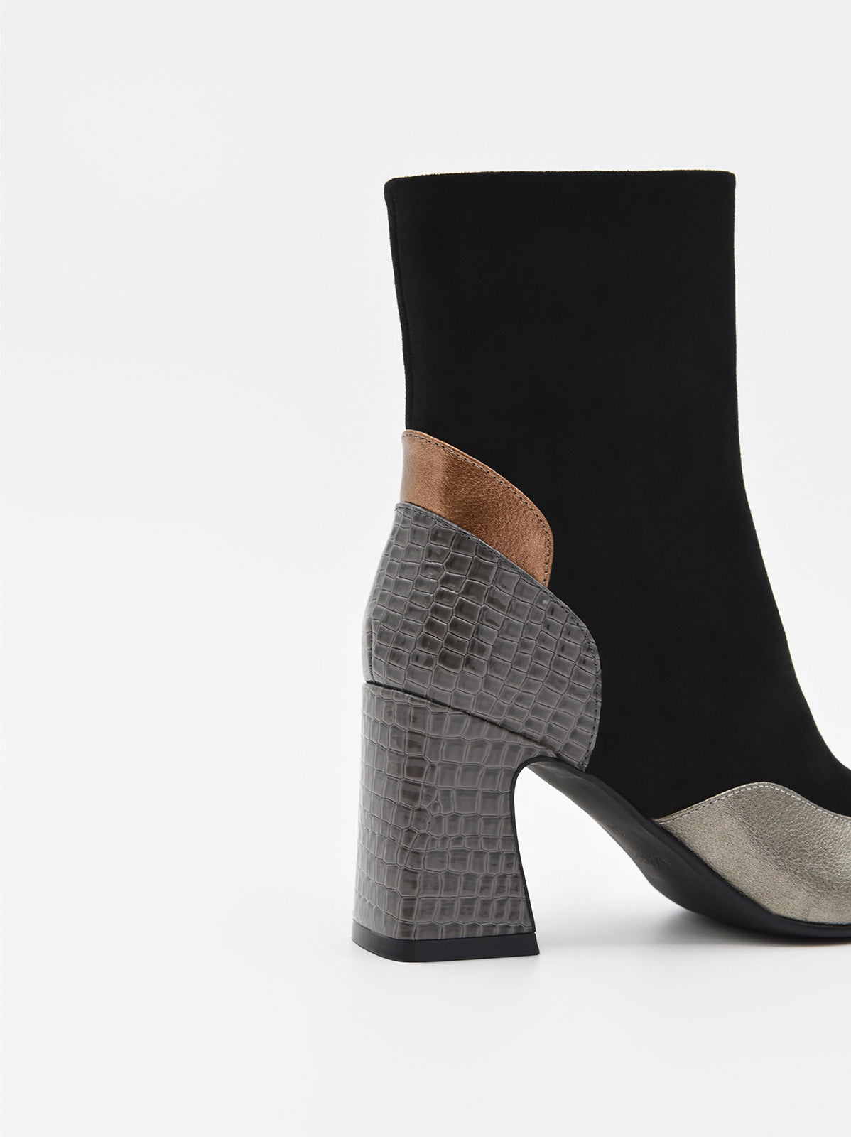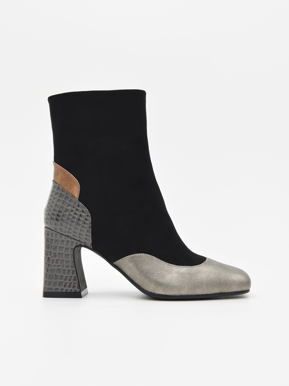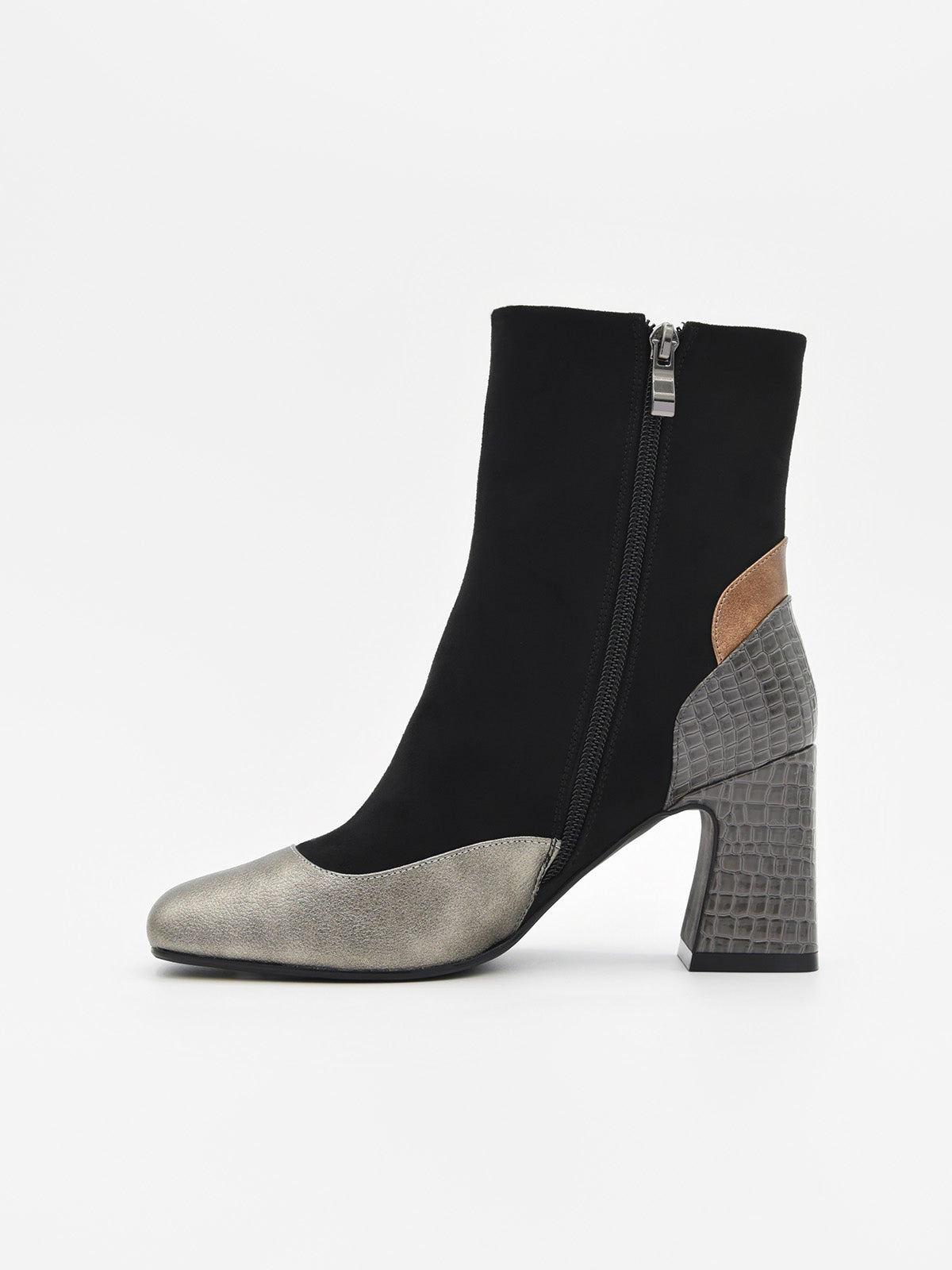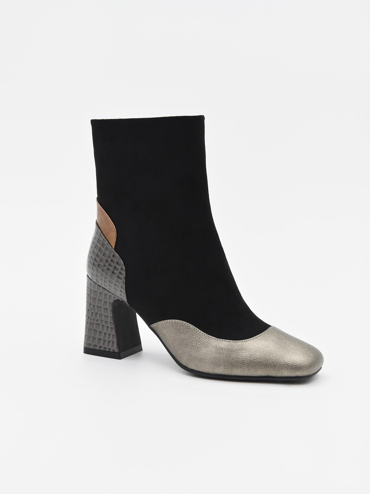 Questo stivaletto a metà gamba combina con maestria texture e colori neutri, creando un pezzo tanto versatile quanto sofisticato. La base in scamosciato nero è valorizzata da una punta metallizzata in tono platino e da un retro in incisione effetto coccodrillo grigia, mentre il piccolo dettaglio laterale in cuoio marrone apporta calore e armonia al design.