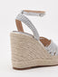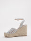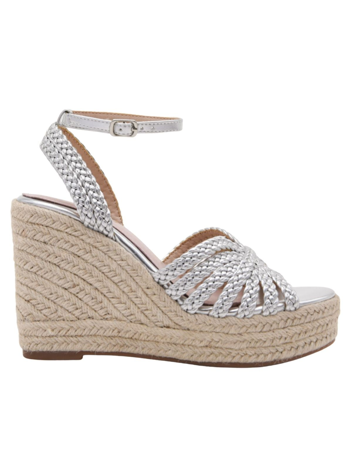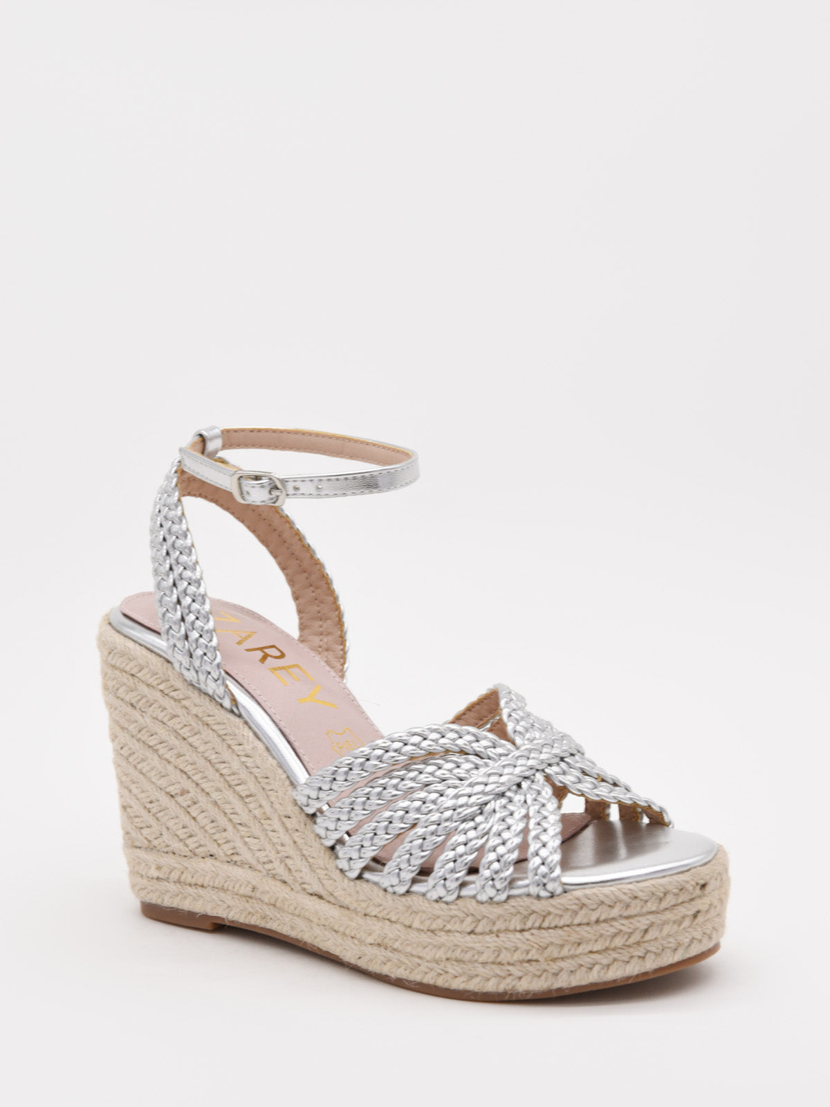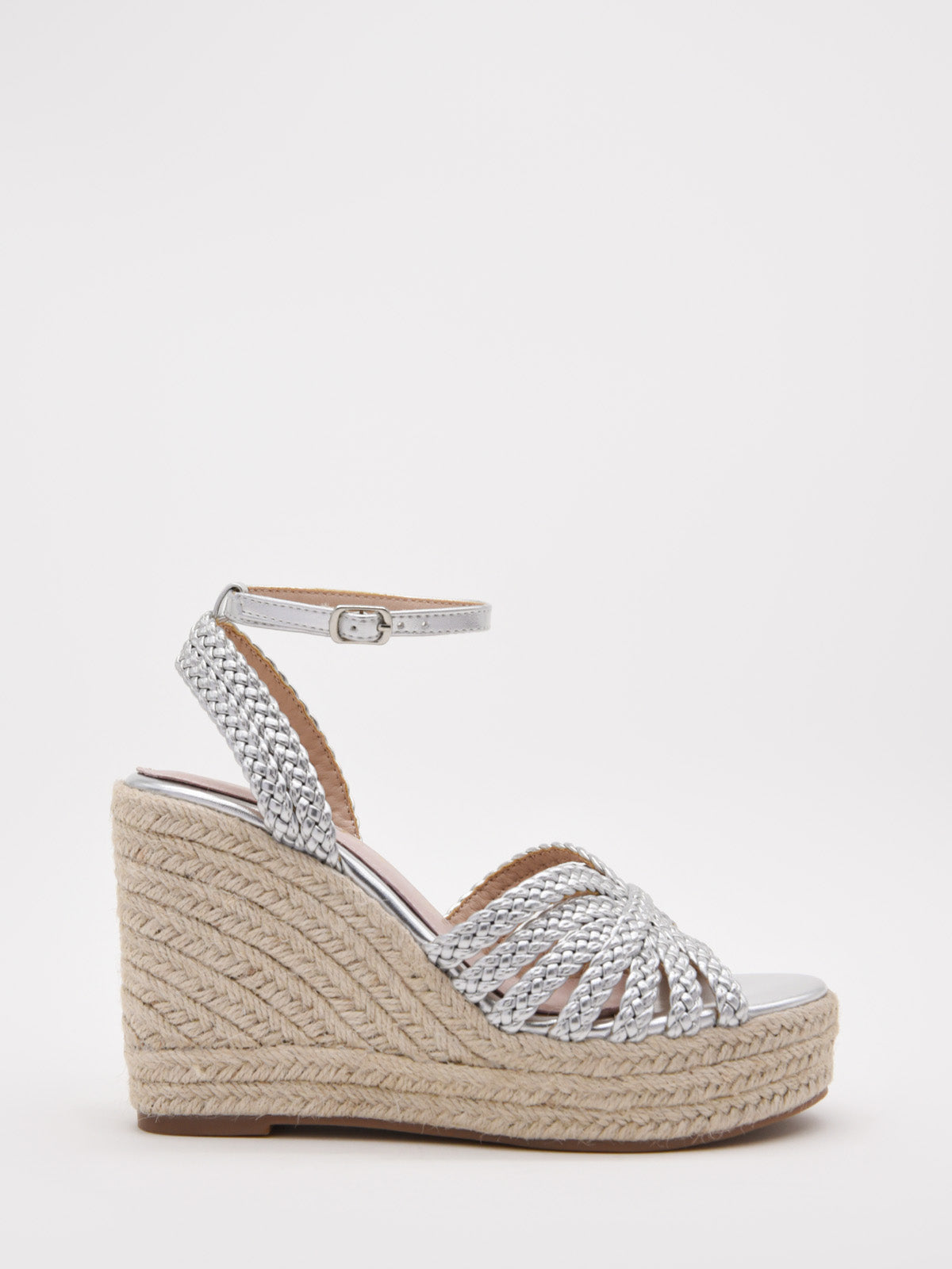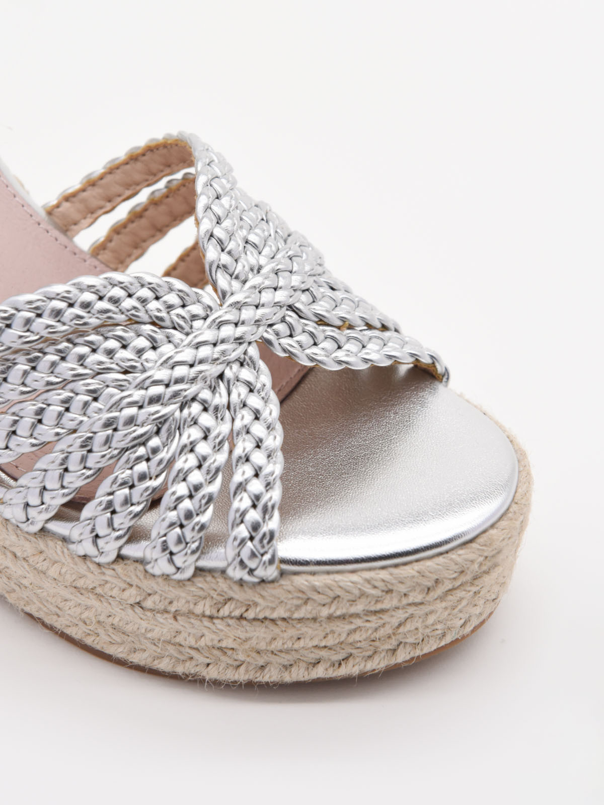 Sandalias plateadas de cuña alta con tiras trenzadas