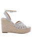 Estas sandalias plateadas de cuña alta combinan un diseño moderno con la frescura del verano. Sus tiras trenzadas en acabado metalizado añaden un toque sofisticado, mientras que la plataforma de yute natural aporta ligereza y estilo. El cierre ajustable en el tobillo asegura un ajuste cómodo y seguro, perfecto para lucir durante todo el día. Ideales para eventos casuales o más formales, estas sandalias ofrecen altura y comodidad sin renunciar al estilo.