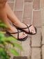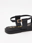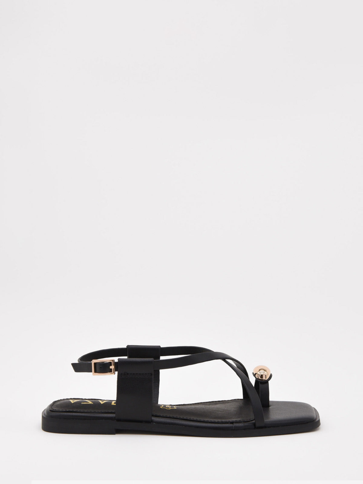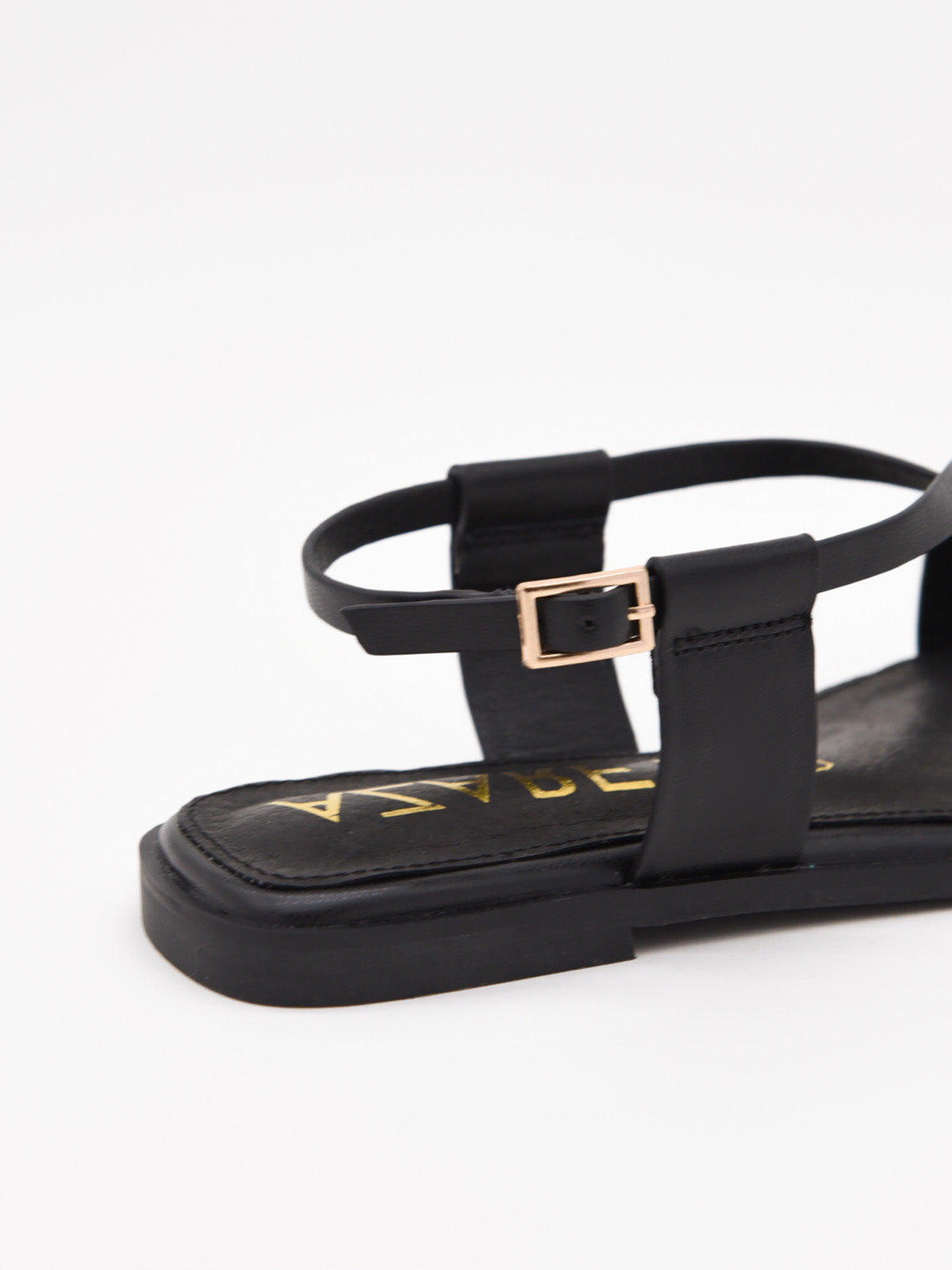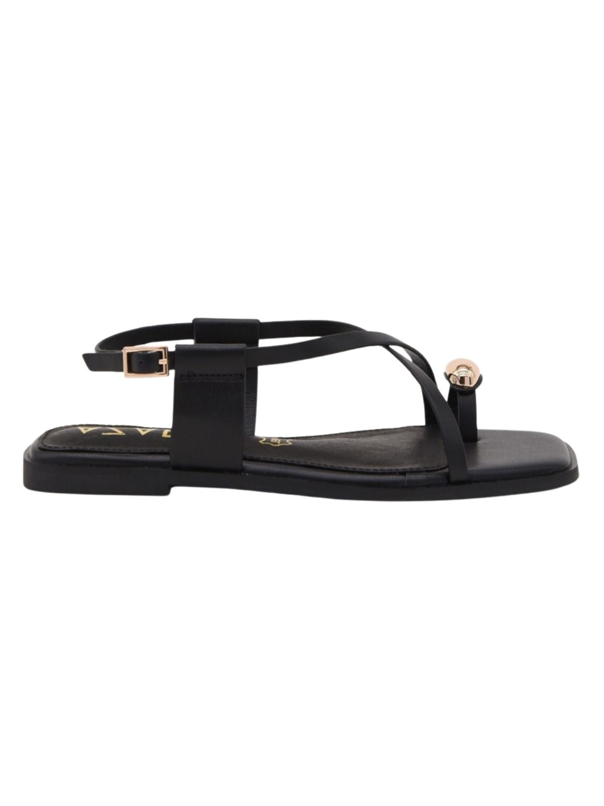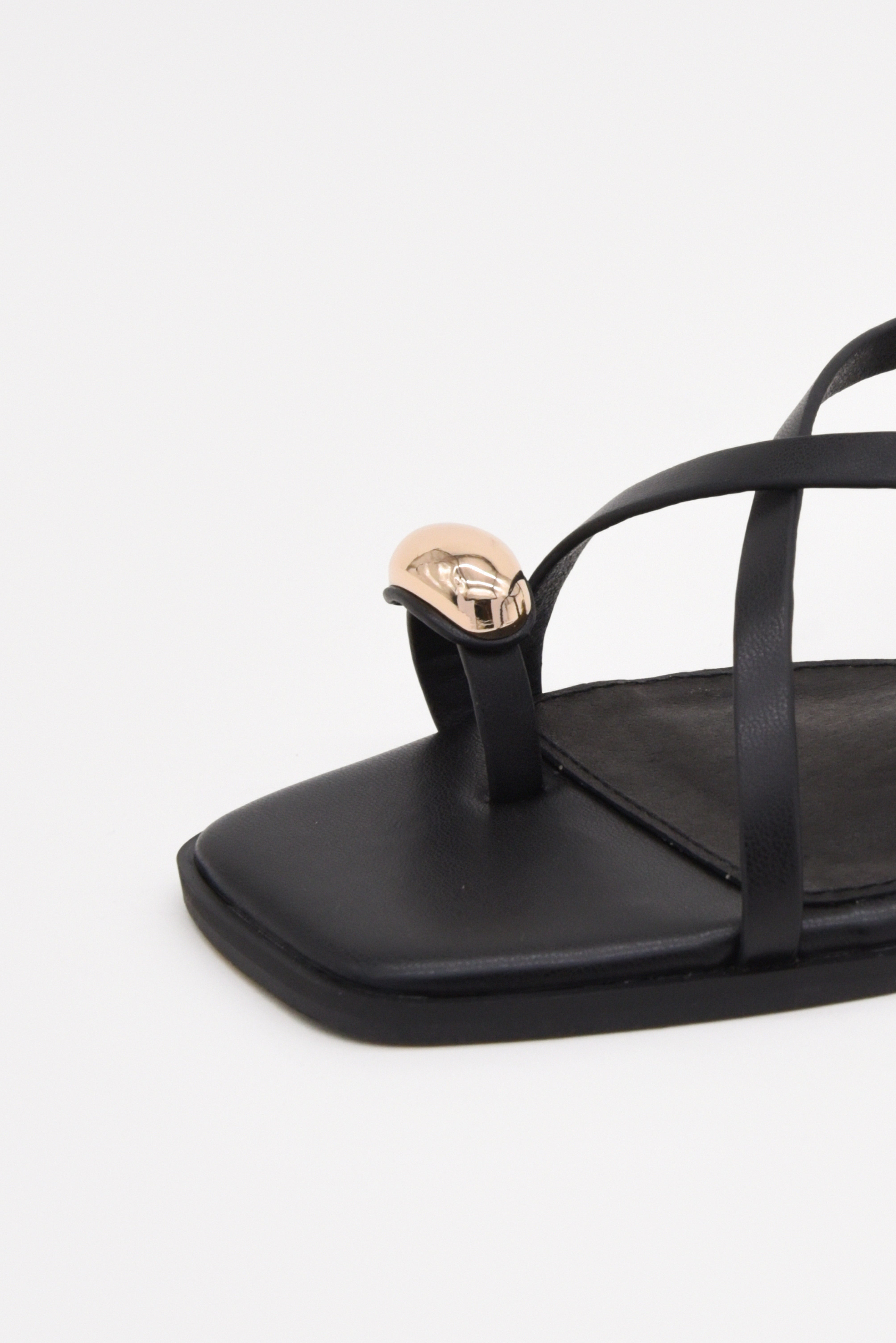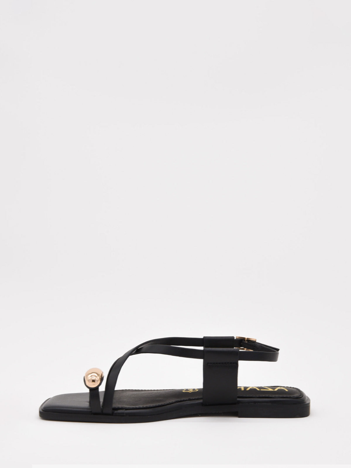 Estas sandalias planas negras combinan diseño minimalista y sofisticación con un detalle dorado elegante en el dedo. Con una suela acolchada para mayor comodidad durante todo el día. Su diseño de tiras ajustables asegura un ajuste perfecto, mientras que su estilo versátil las convierte en una opción ideal para complementar desde atuendos casuales hasta looks más formales.