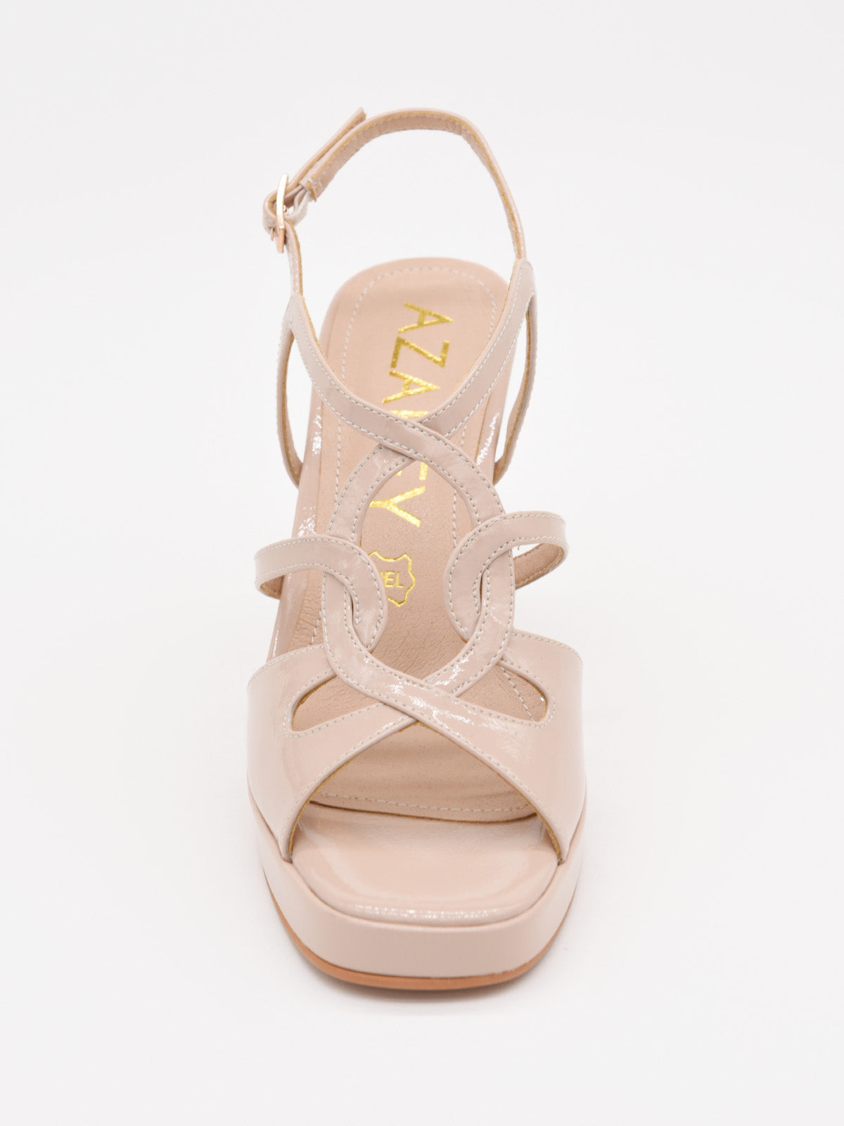 Estas sandalias nude de charol son la combinación perfecta de sofisticación y comodidad. Su diseño de tiras entrelazadas estiliza el pie, mientras que la correa ajustable en el tobillo brinda un ajuste seguro y elegante. La plataforma delantera reduce la inclinación del pie, proporcionando un extra de confort sin renunciar a la altura del tacón alto estilizado. Un calzado ideal para eventos especiales, cenas o cualquier ocasión en la que quieras destacar con elegancia.