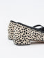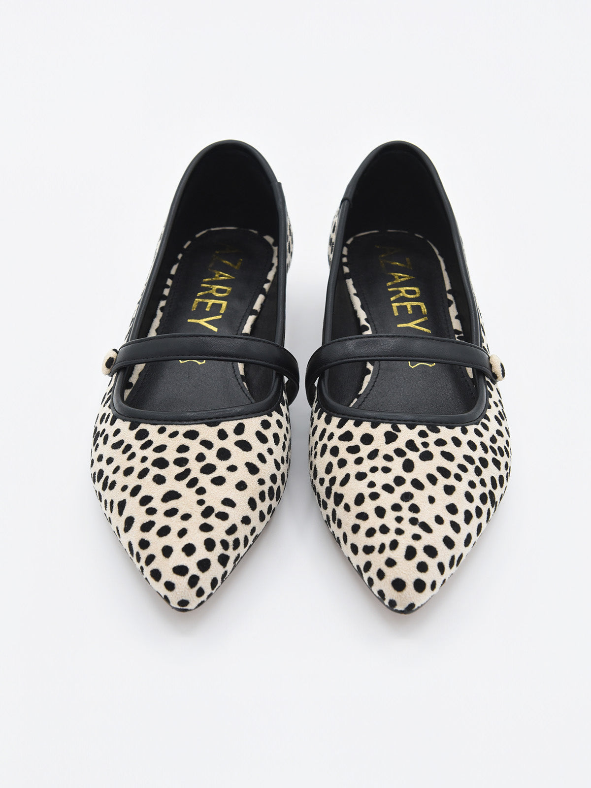 Una bailarina que combina dulzura y carácter sin esfuerzo. El estampado animal sobre fondo beige aporta esa energía salvaje que transforma un look básico en algo especial, mientras que la tira fina negra añade un toque sutil y femenino. El detalle más inesperado está en el tacón bajo con forma geométrica, tan cómodo como único.