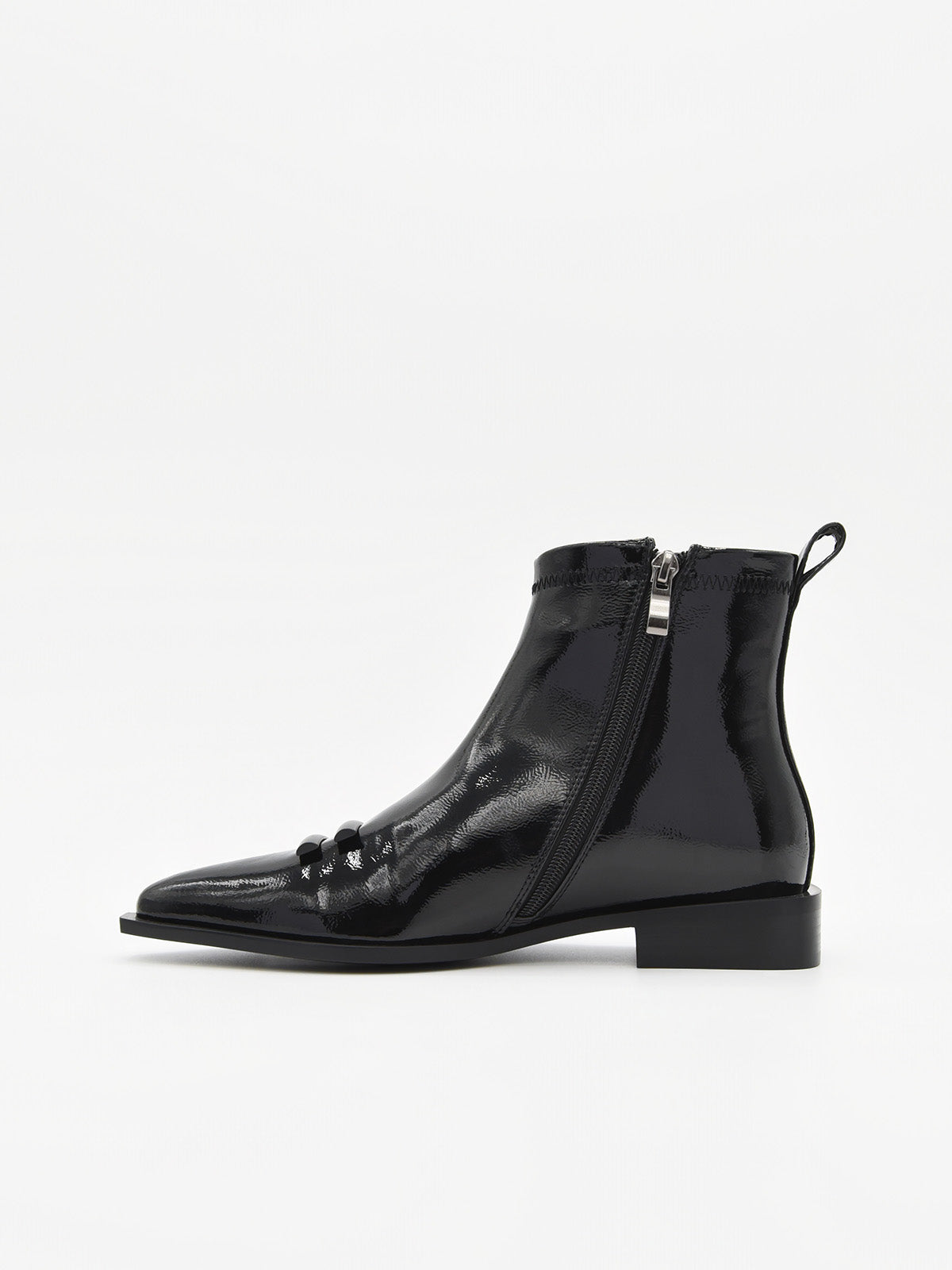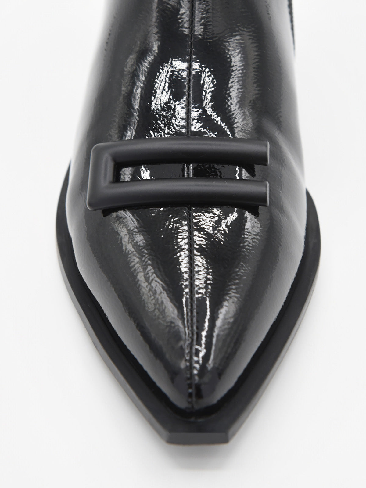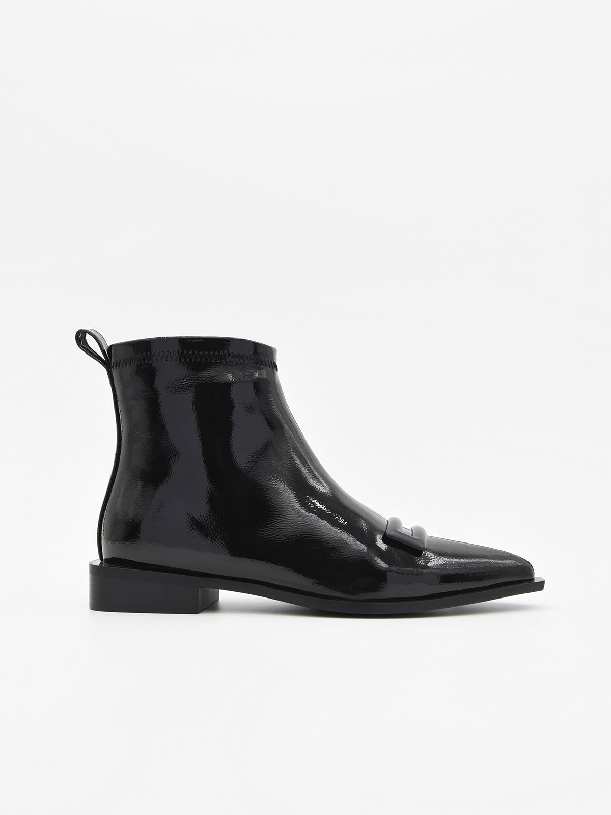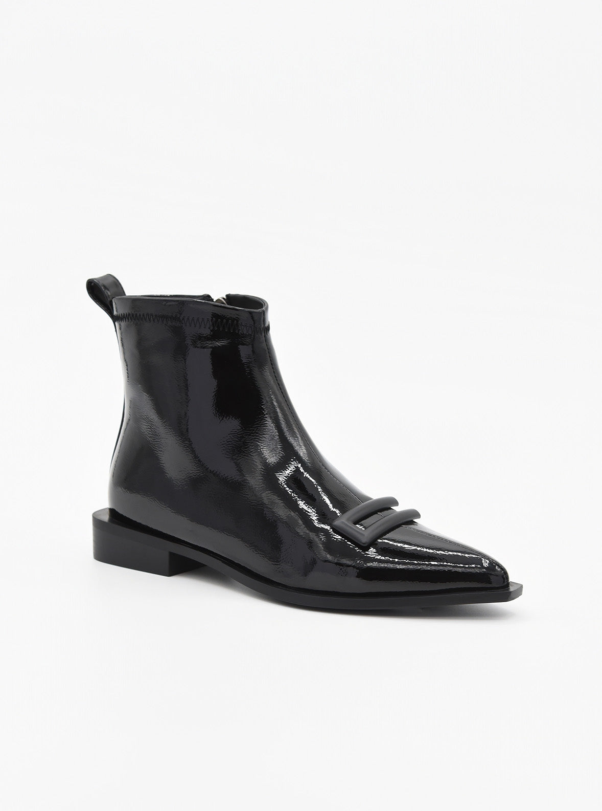 Diseñado para aportar un toque de sofisticación al día a día, este botín plano en charol negro combina practicidad y elegancia a partes iguales. La punta afilada estiliza la figura del pie, mientras que la hebilla decorativa en tono mate añade un detalle moderno y minimalista.