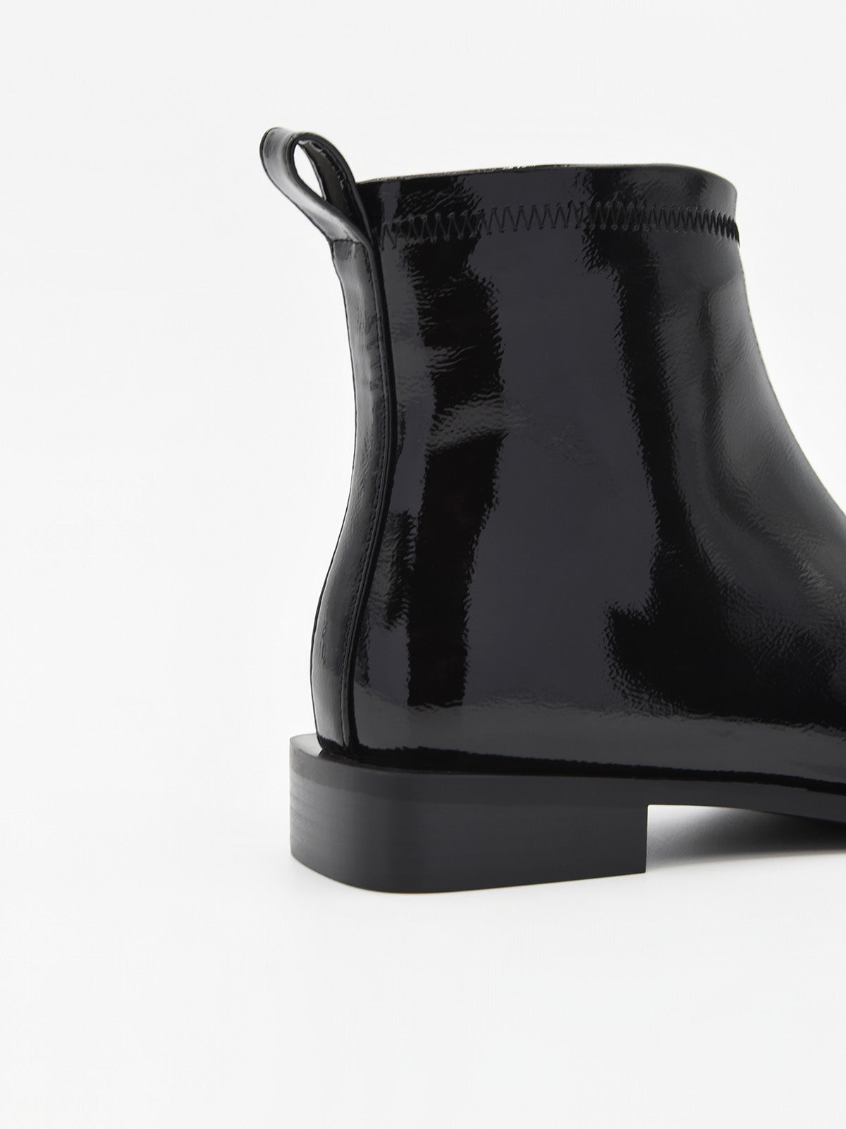 Su suela plana y ligera ofrece confort durante todo el día, y el cierre interior con cremallera garantiza un ajuste rápido y seguro. El acabado en charol brillante refleja la luz, elevando incluso los conjuntos más sencillos.