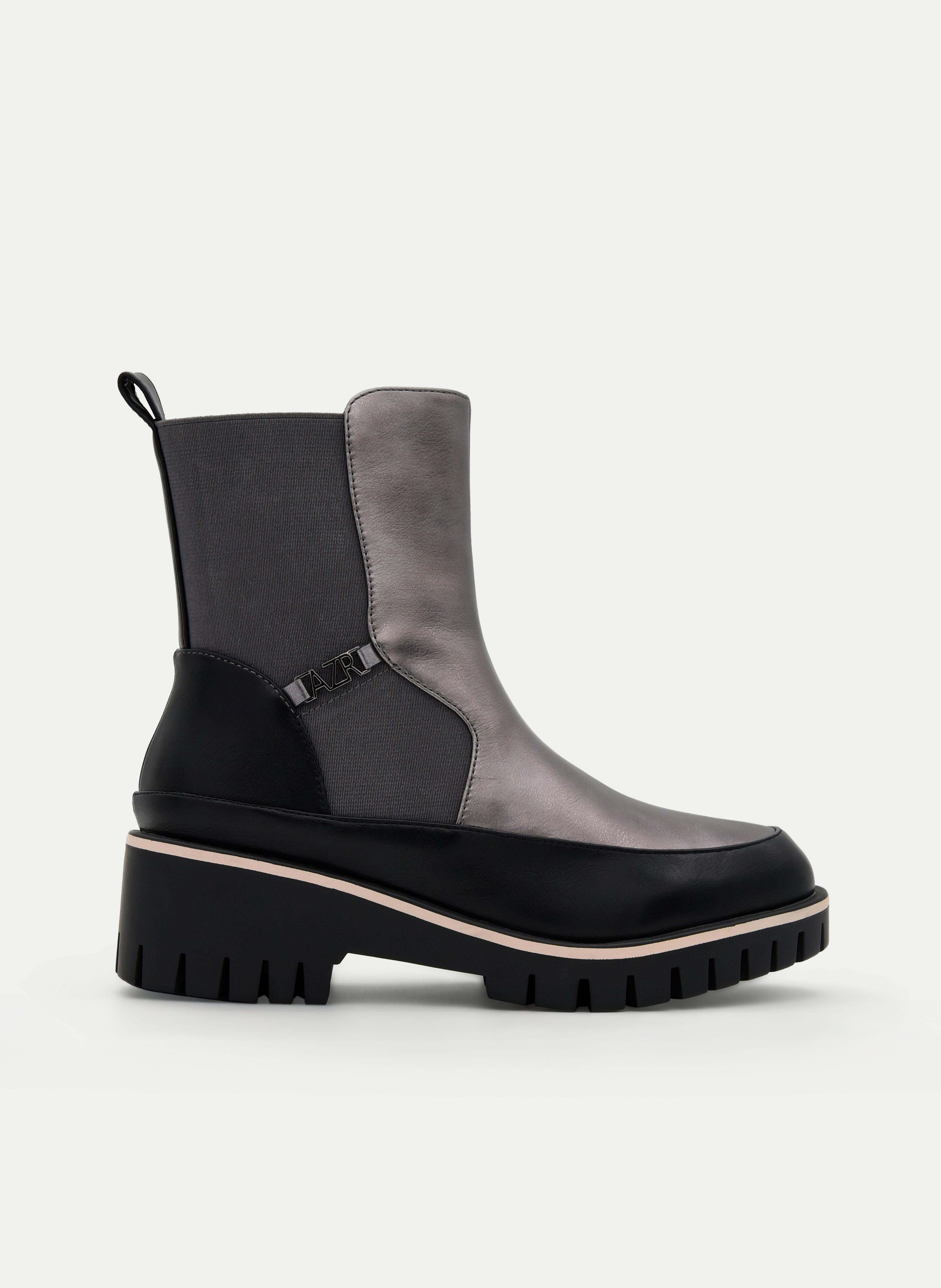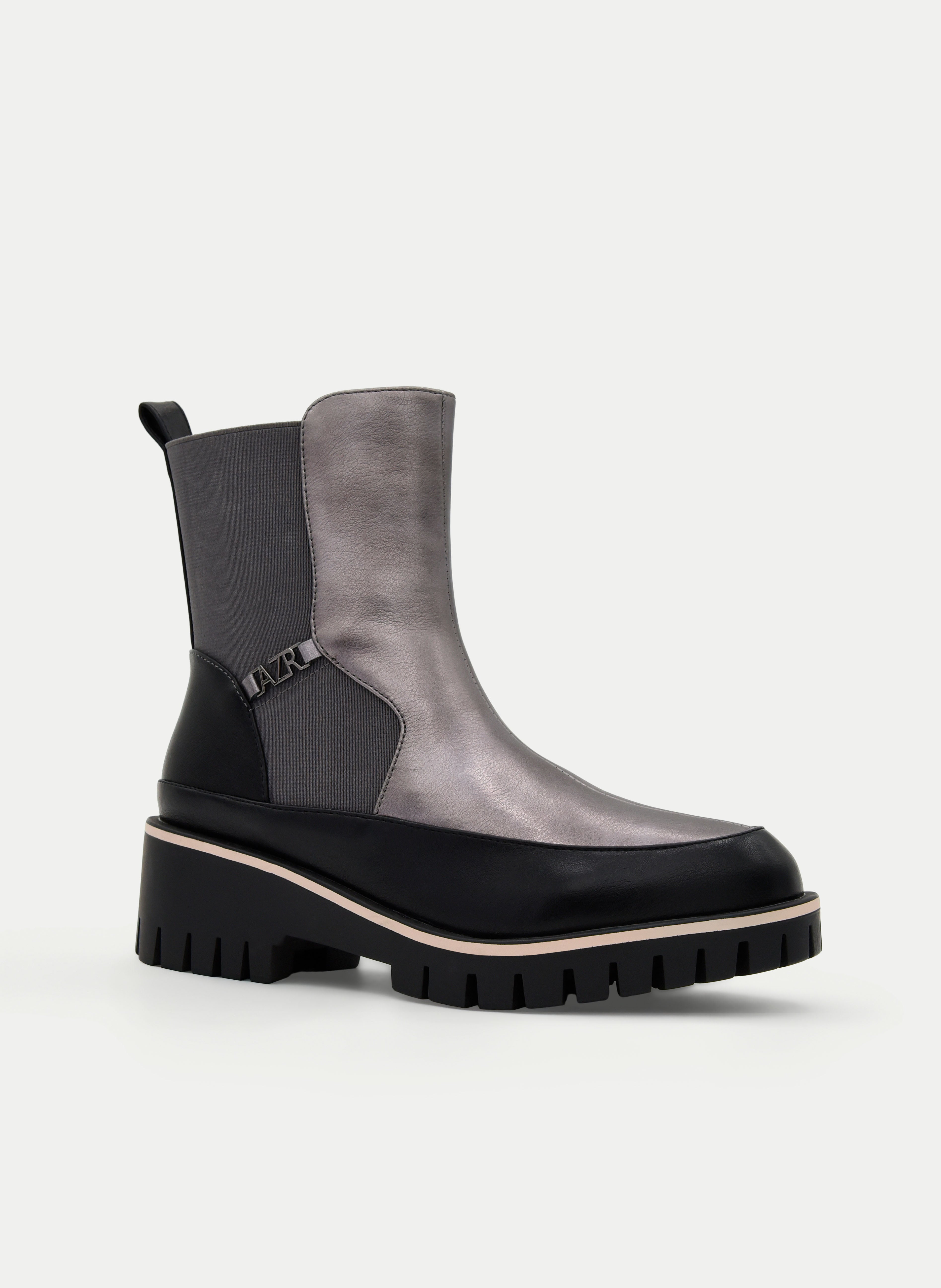 Estos botines color plomo son la mezcla perfecta entre modernidad, estilo urbano y sofisticación. Su acabado en tono plomo aporta un brillo sutil y elegante que transforma cualquier look, mientras que el contraste con el negro realza su carácter contemporáneo. La suela track dentada y el tacón ancho cómodo garantizan una pisada estable y un estilo potente, ideal para mujeres que buscan tendencias sin renunciar a la comodidad.