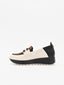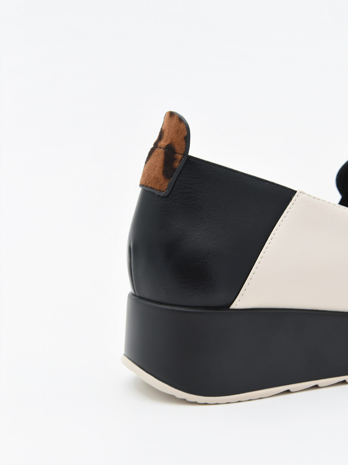 El mocasín que rompe esquemas. Una versión moderna y con carácter de un clásico que no pasa de moda. Este diseño mezcla materiales y texturas con maestría: piel sintética beige, puntera de animal print en ante, y un adorno geométrico XL en negro mate que le da ese punto arquitectónico y actual que marca la diferencia.