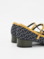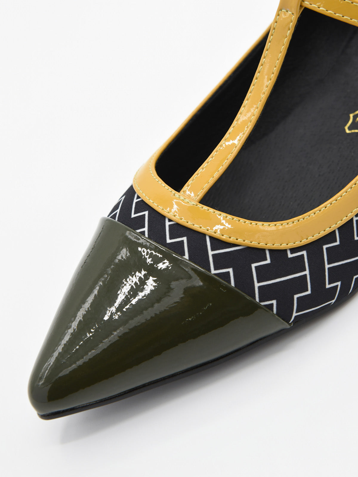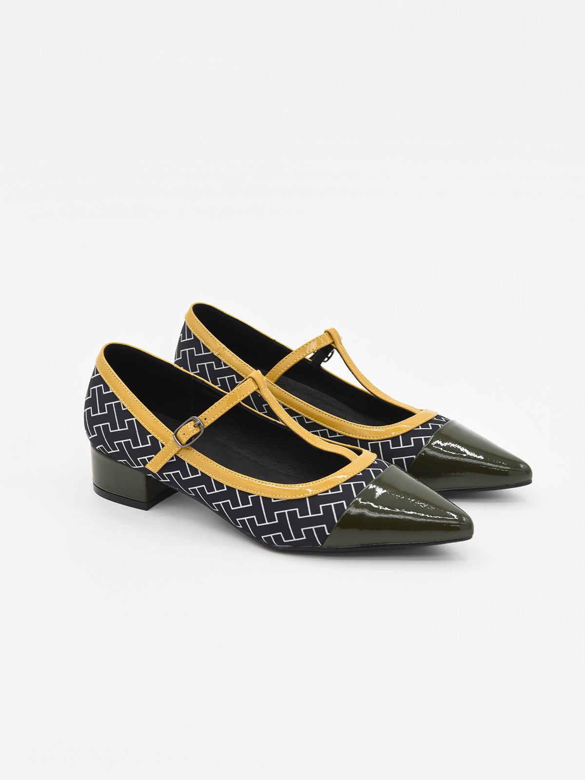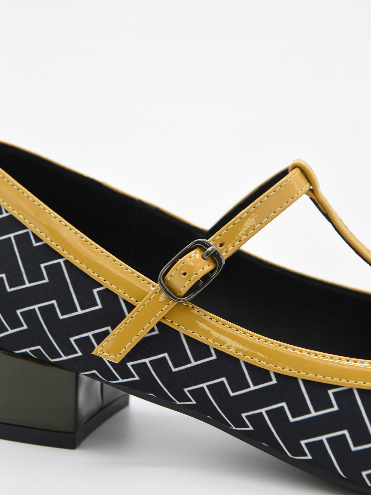 Este zapato no pasa desapercibido. Con su estampado geométrico en blanco sobre fondo negro, y detalles en charol verde oliva y ribetes en amarillo mostaza, se convierte en la pieza clave de cualquier look que busque personalidad y originalidad.