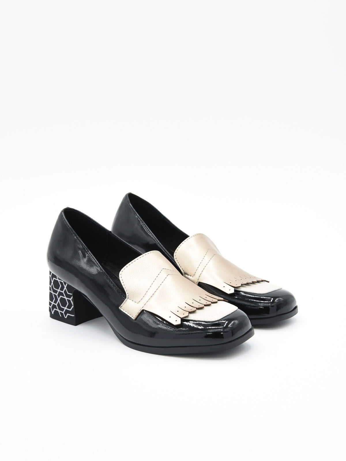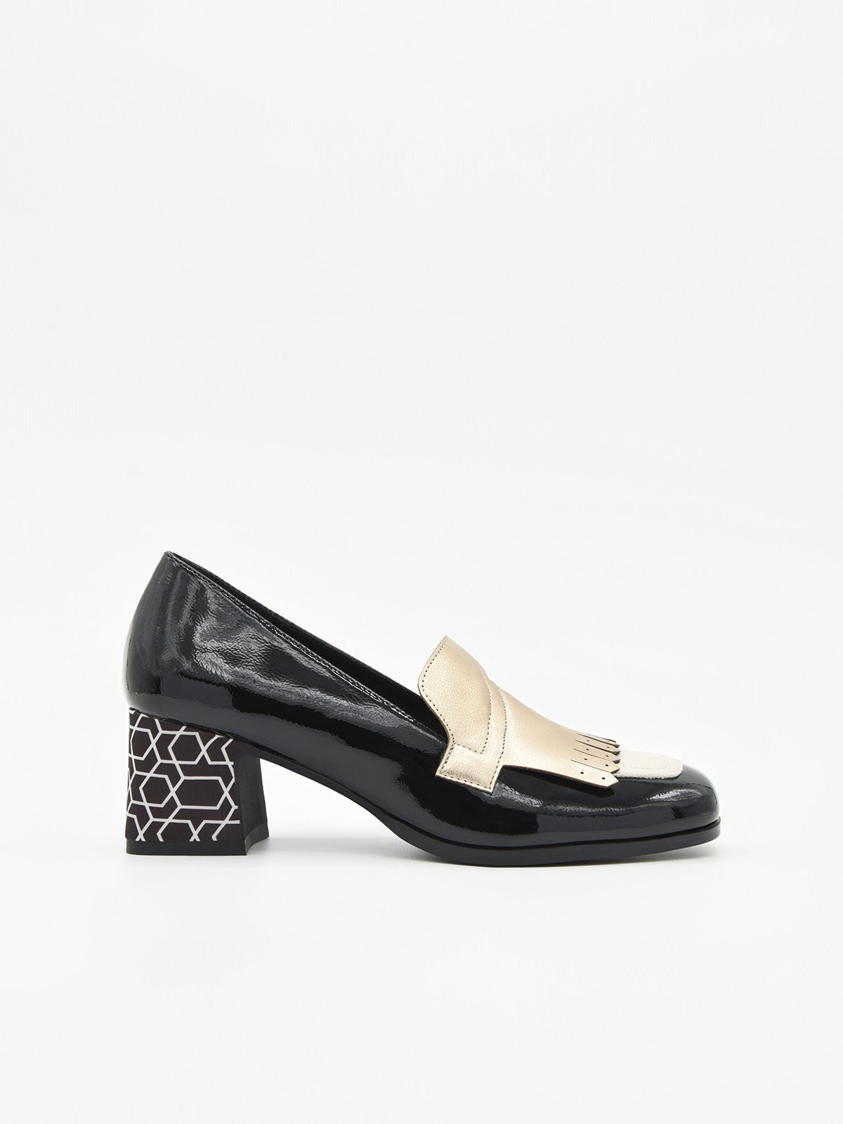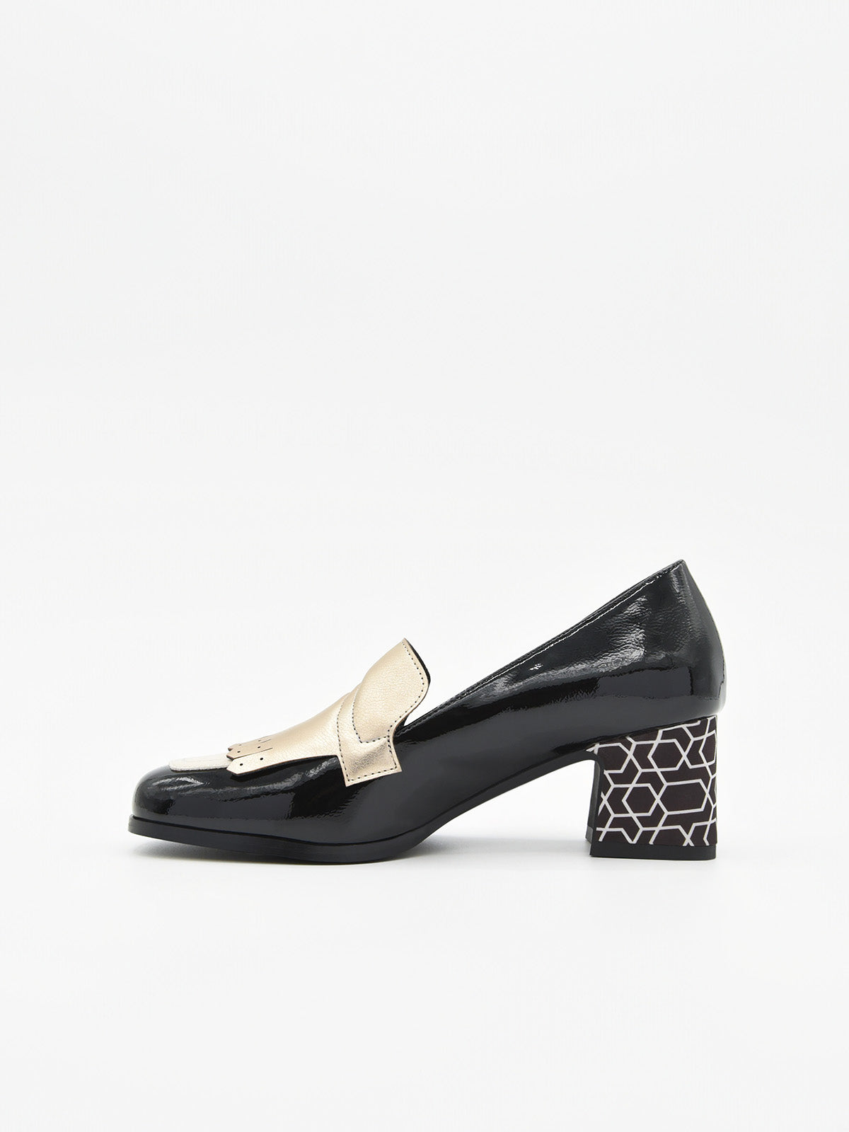 Zapatos de Charol Negros con Flecos y Tacón estampado