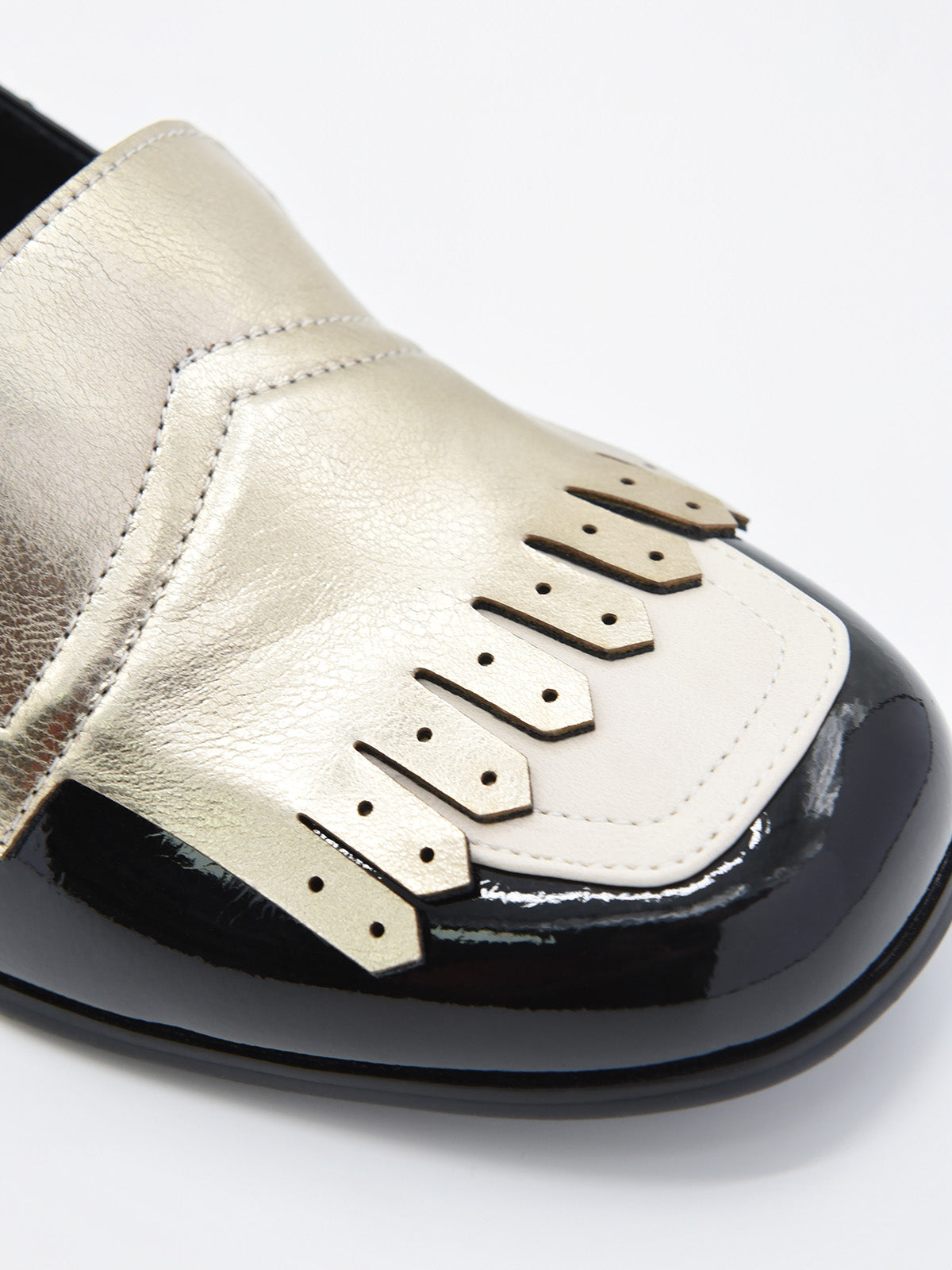 Estos zapatos de charol negro combinan elegancia clásica con detalles contemporáneos. Los flecos añaden movimiento y textura, mientras que el tacón estampado aporta un toque de personalidad a cada paso. Confeccionados en charol de alta calidad, ofrecen un acabado brillante y duradero que realza cualquier conjunto. Ideales para quienes buscan un calzado versátil que transita entre lo formal y lo casual con sofisticación. Un diseño que destaca por su capacidad de transformar tanto looks minimalistas como más atrevidos.