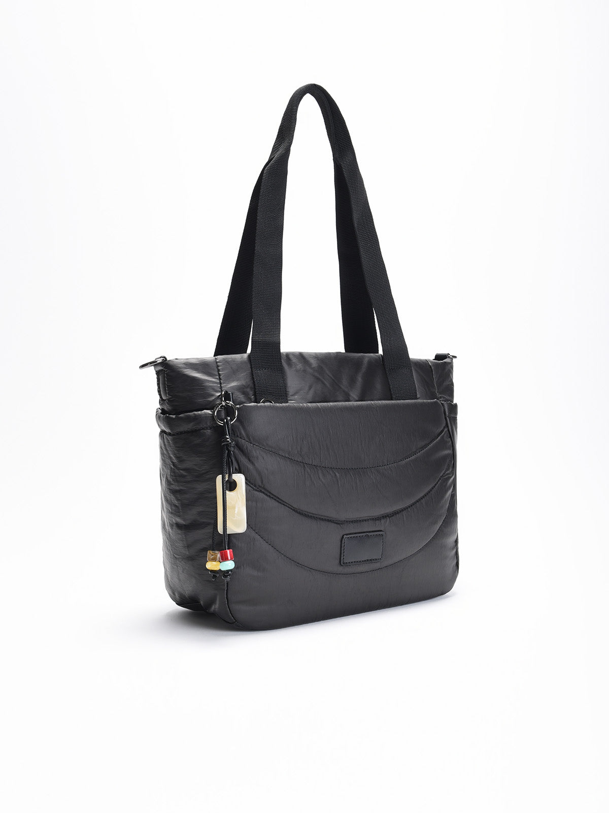 El interior amplio con compartimento con cremallera lo convierte en un bolso todoterreno ideal para oficina, escapadas de fin de semana o como básico diario. Además, el detalle lateral con abalorios y colgante aporta un toque divertido y actual, sin restar elegancia a su diseño atemporal en negro.