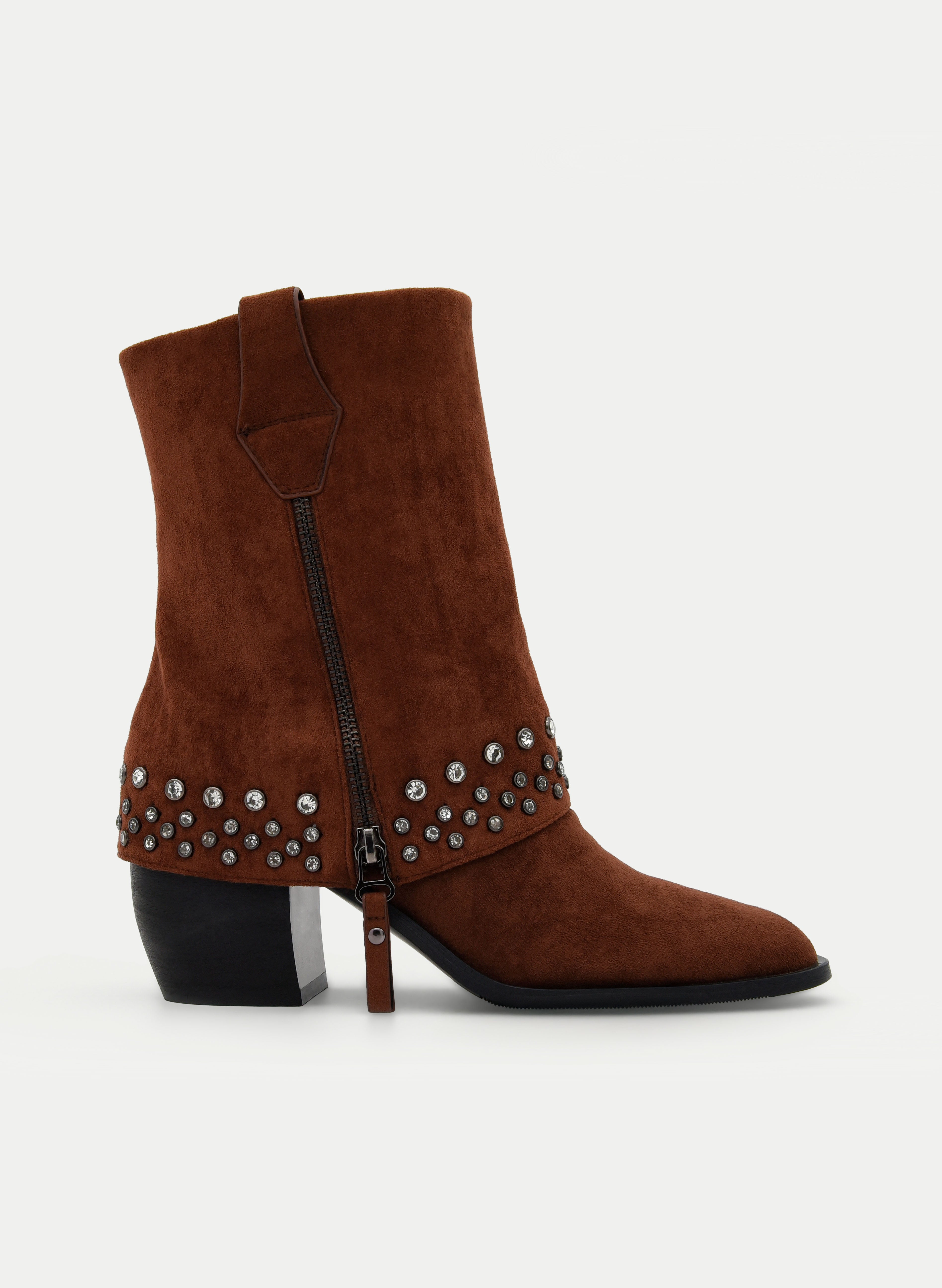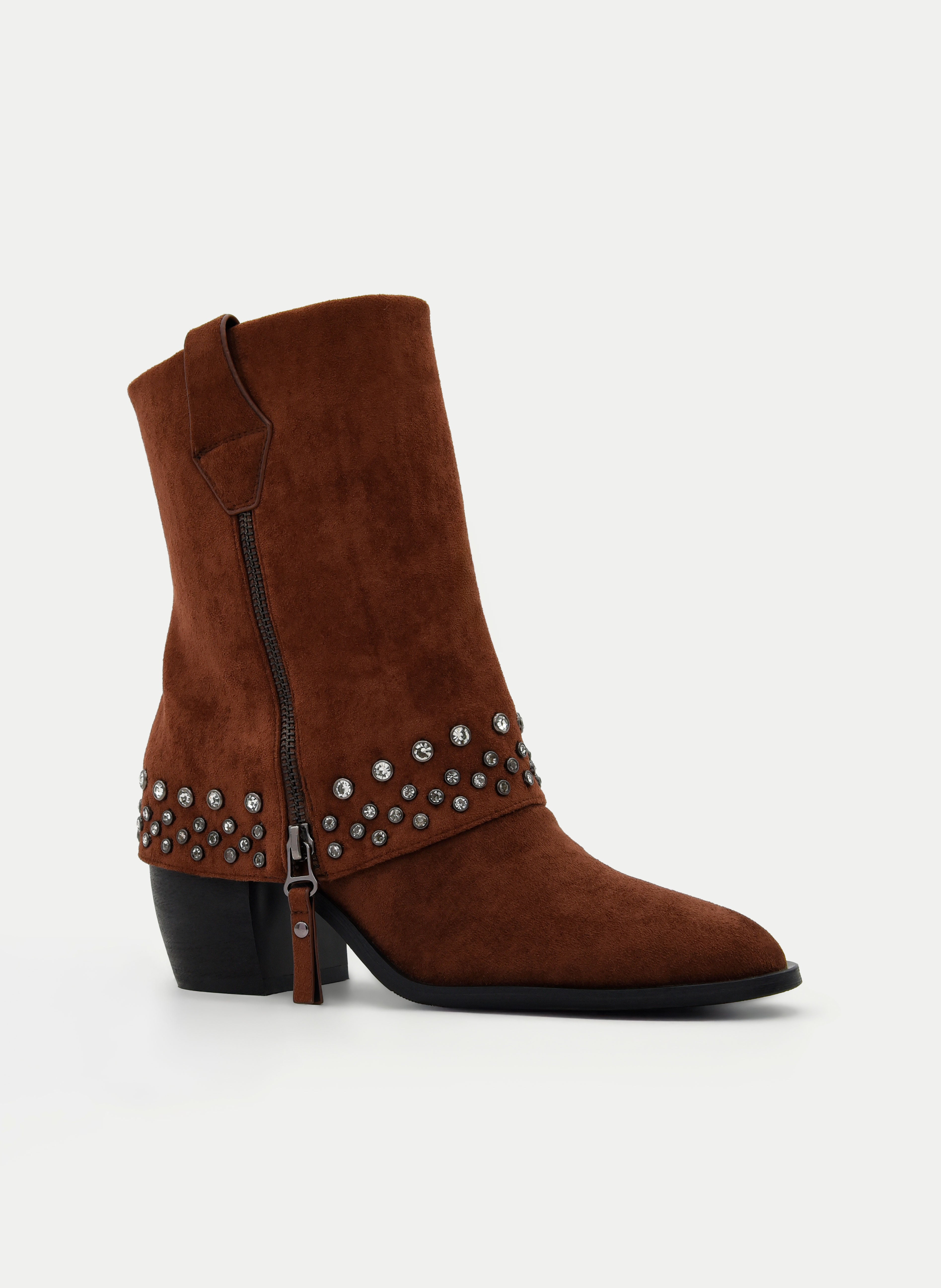 Estos botines marrones destacan por su estilo moderno y ese toque desenfadado que combina a la perfección con looks urbanos y femeninos. El tacón medio cómodo aporta altura sin renunciar a la estabilidad, mientras que las tachuelas brillantes añaden personalidad y un acabado muy actual.