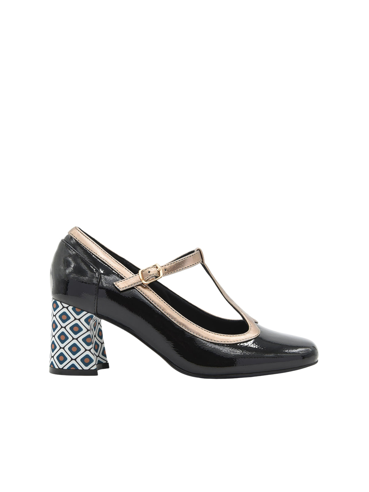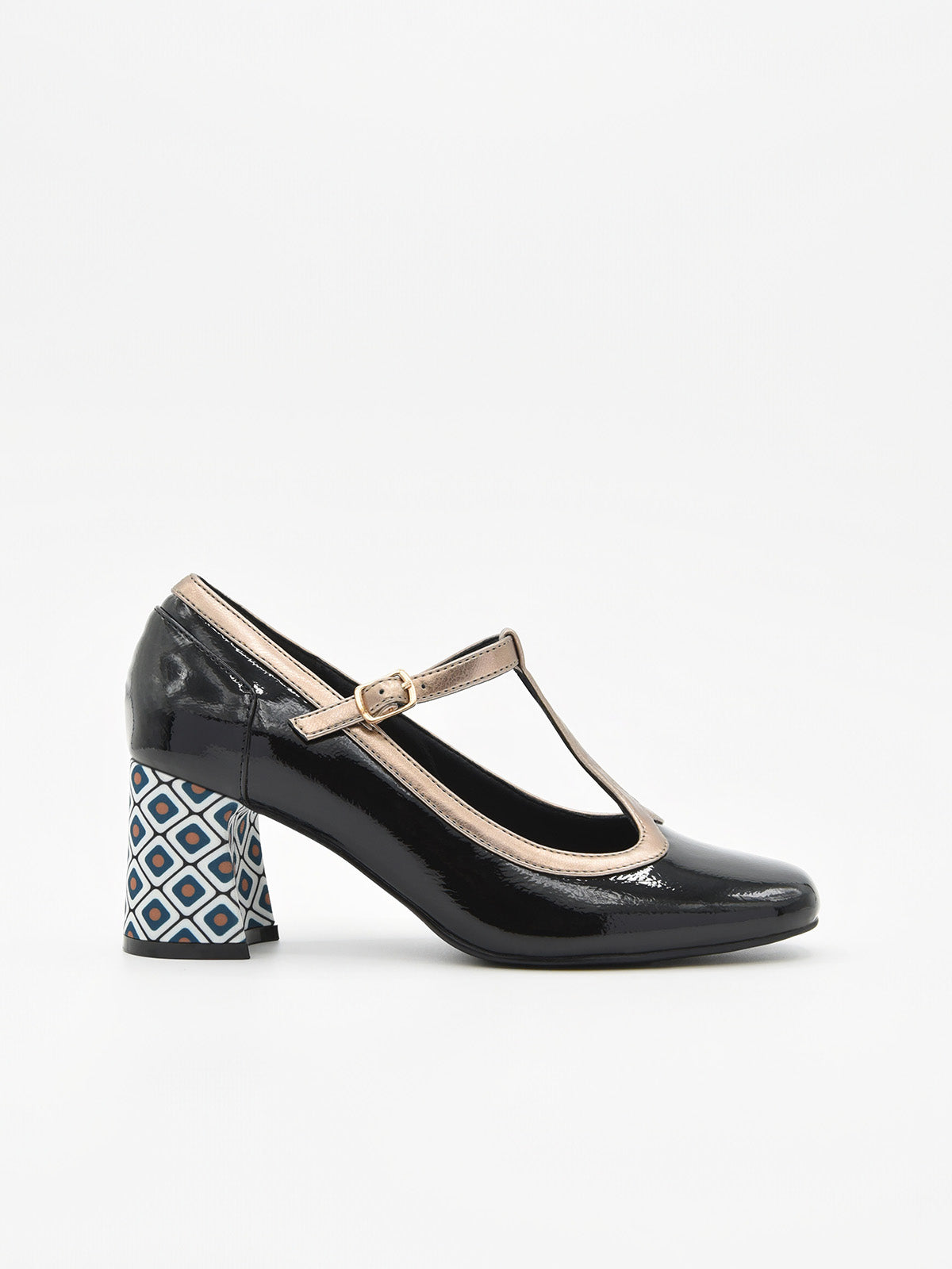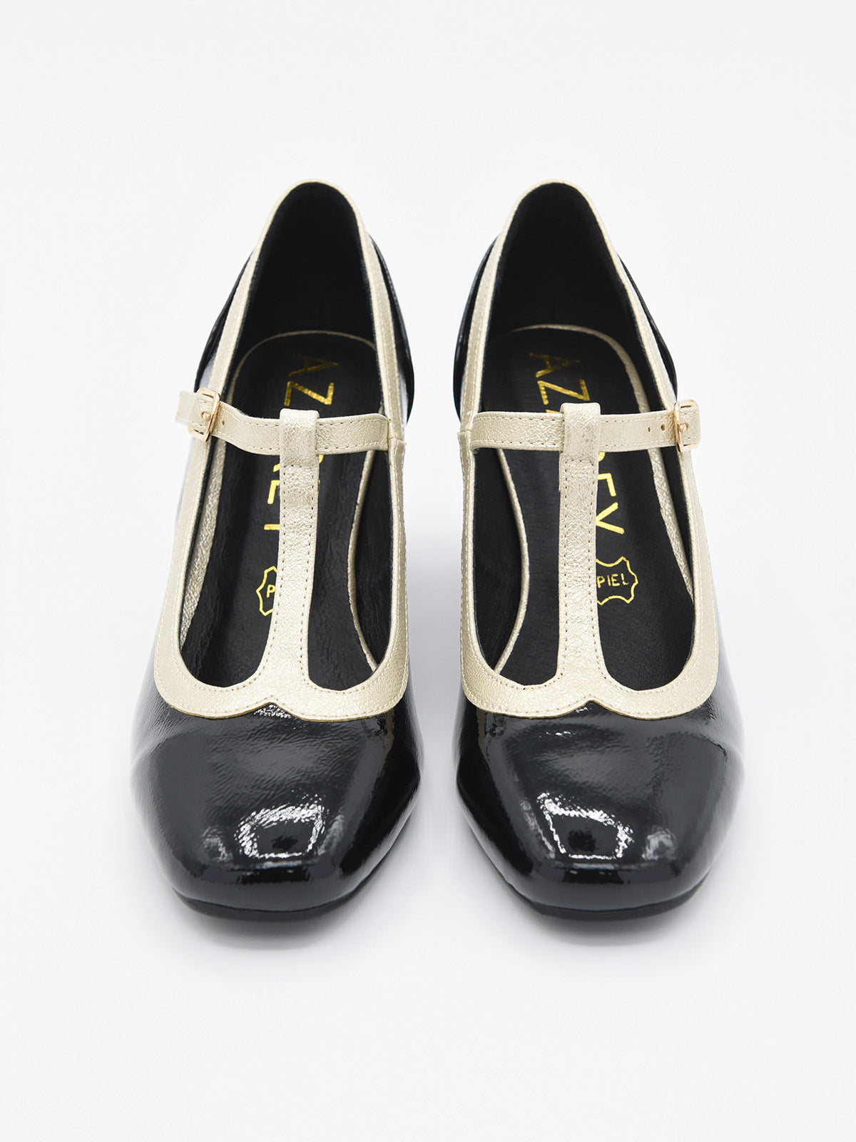 Esse zSalão preto Apato Com detalhes dourados e Calcanhar impresso É uma jóia real do estilo retro chique. O acabamento Lango preto brilhante, combinado com o Pulseira de barra t metálica, destaca a feminilidade com um ar sofisticado e alegre.